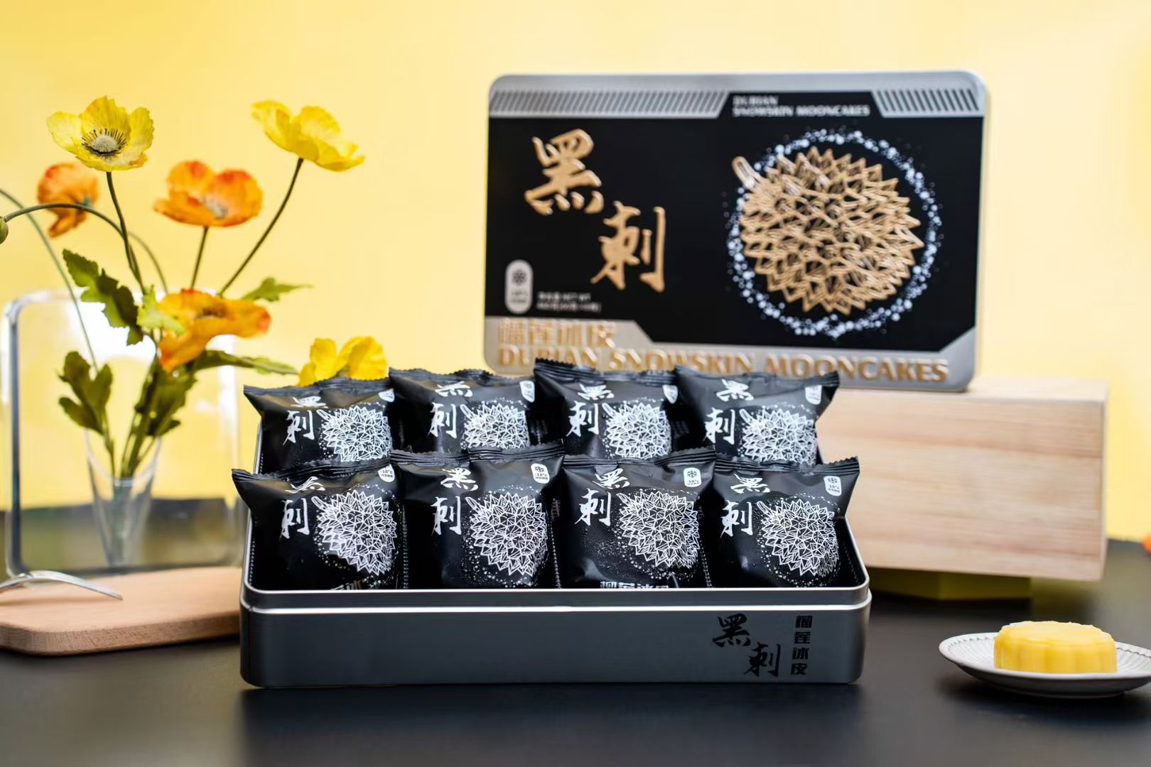 「冰皮黑刺榴莲流心月饼」——咬开的瞬间,浓郁榴莲流心“噗”地爆浆,冰凉绵密裹着醇厚榴莲香,连空气都染上热带气息!