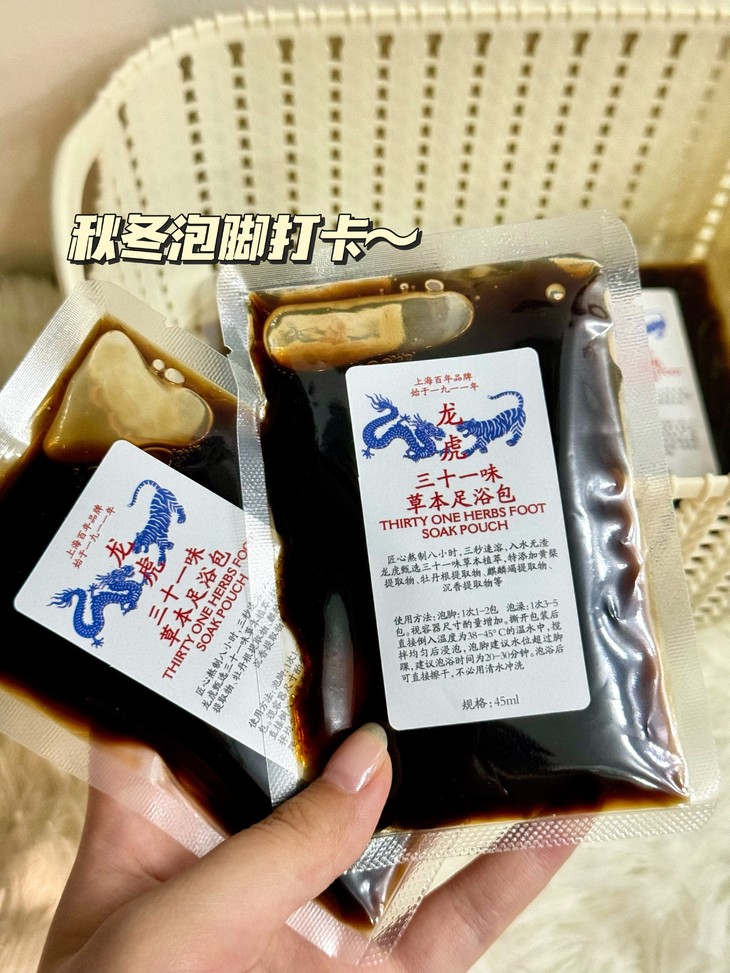 【品牌】龙虎 【产品名称】三十一味草本足浴包 【规格】45ml*10包 【产地】河南 【市场零售价格】29.9 【生产日期】以收到实物为准 【保质期】3年 【成分】纯净水、艾叶、百合、女贞子、伸筋草、决明子、钩藤、郁李仁、茵陈、当归、川芎、益母草、木香、花椒、杏仁、地黄、蛇床子、小茴香、红花、甘草、决明子、百合、肉豆蔻、佛手、杏仁、郁李仁、金银花、桑枝、天冬、黄檗提取物、牡丹根提取物、麒麟竭提取物、沉香提取物 【使用说明】泡脚:1次1-2包;泡澡:1次3-5包。视容器尺寸,酌量增加。 撕开包装后直接倒入温度为38-45°C的温水中,搅拌均匀后浸泡,泡脚建议水位超过脚踝,建议泡浴时间为20-30分钟。泡浴后可直接擦干,不必用清水冲洗。 【注意事项】本品只可外用,禁止内服;开放性损伤禁用,孕妇心脏病者慎用。本品为居家日用品,不代替任何药物和医疗器械使用。 【适用范围】手脚冰冷、失眠熬夜、工作乏累、排毒养颜、排湿散寒 【保存方法】常温保存,避免高温及阳光直射。