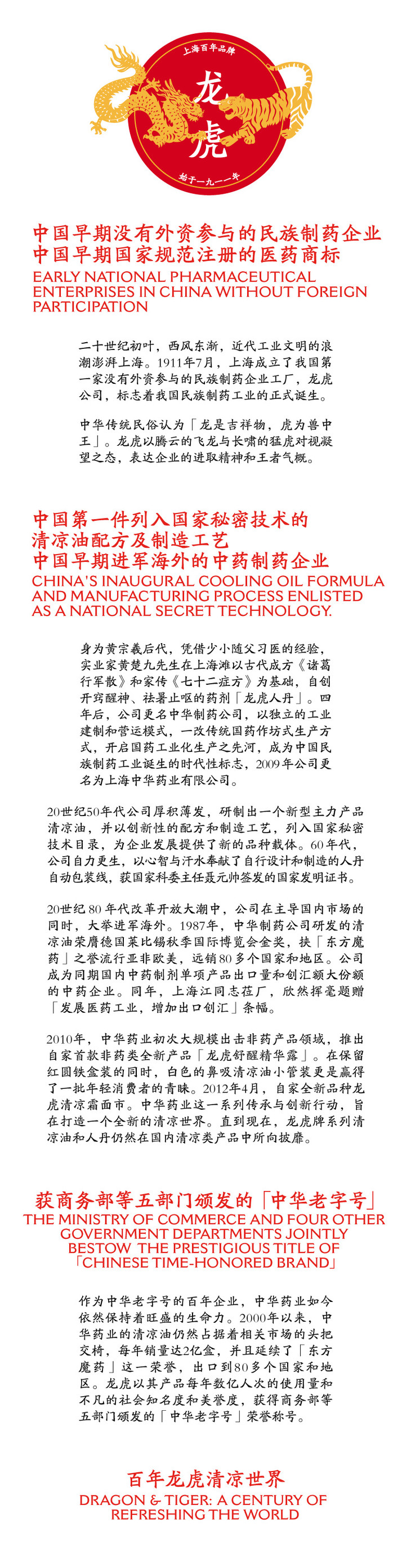 【百年中华老字号】 • 中国第一家没有外资参与的民族制药企业,始于1911; • 1911年 少年随父行医的黄楚九,以古代名方《诸葛行军散》和家传祖方《七十二症方》为基础,自创开窍醒神、祛暑止呕的药剂龙虎人丹,开启国药工业化生产之先河。 • 1925年 获准注册,成为国内第一家由政府认定的、规范的医药商标; • 2010年 注册商标龙虎被商务部评为「中华老字号」,是国内生产清凉类外用产品的领军企业,名副其实的「百年老字号」