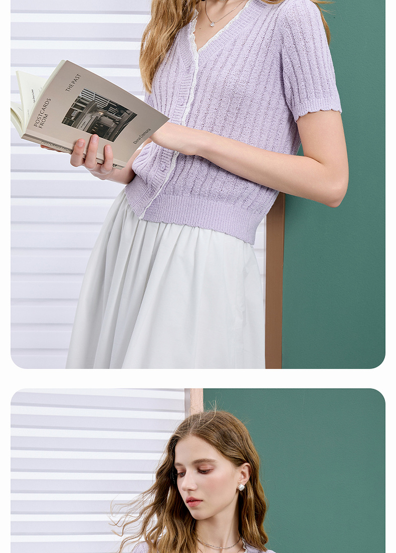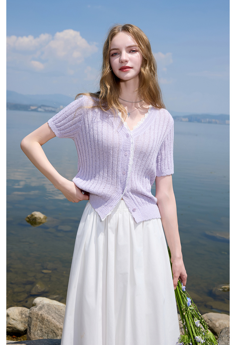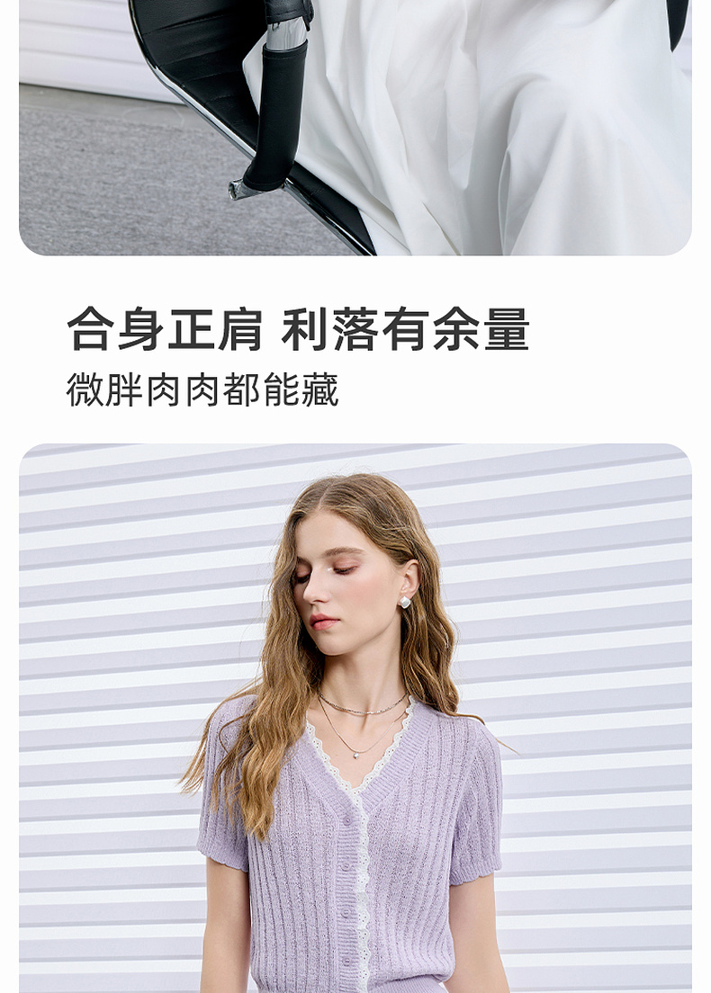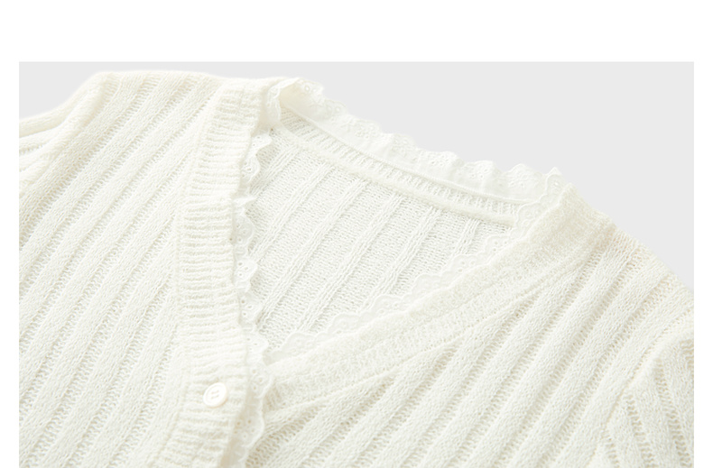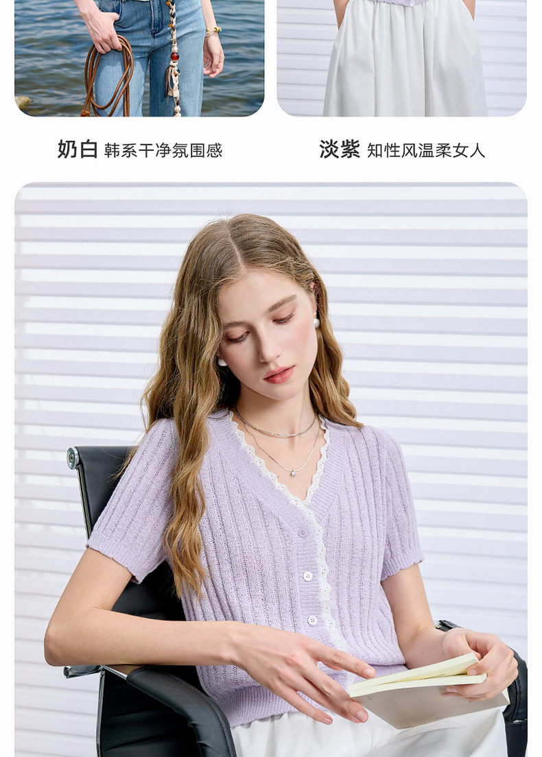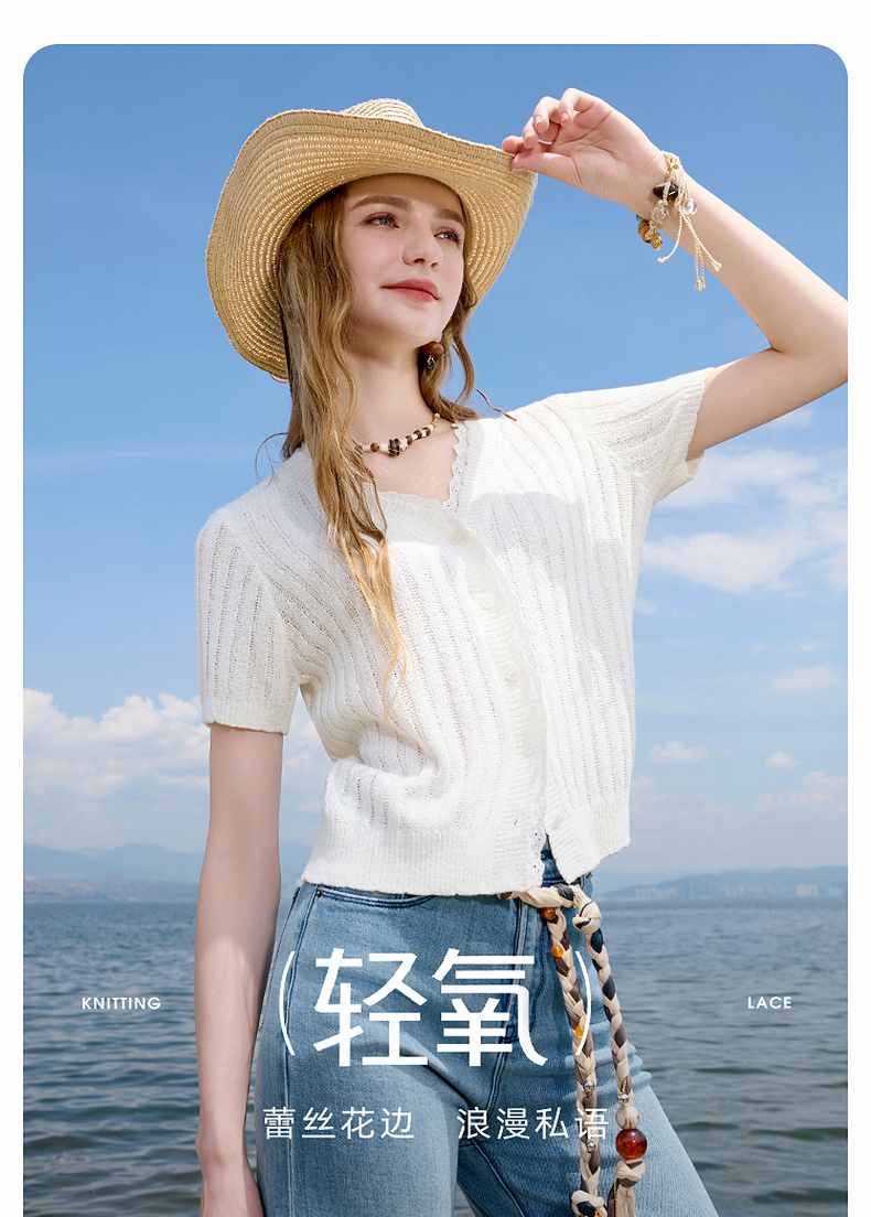 三彩2025秋季新款简约V领蕾丝花边针织衫肌理感小开衫短袖M