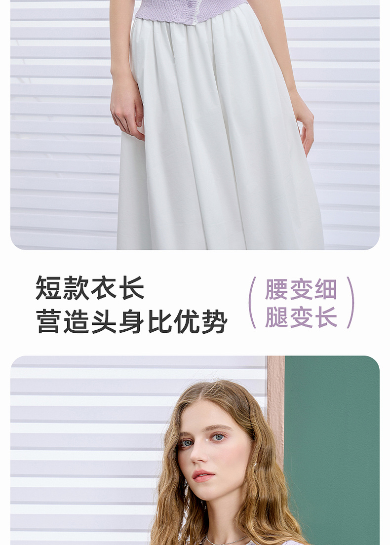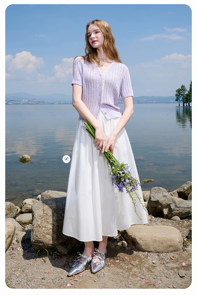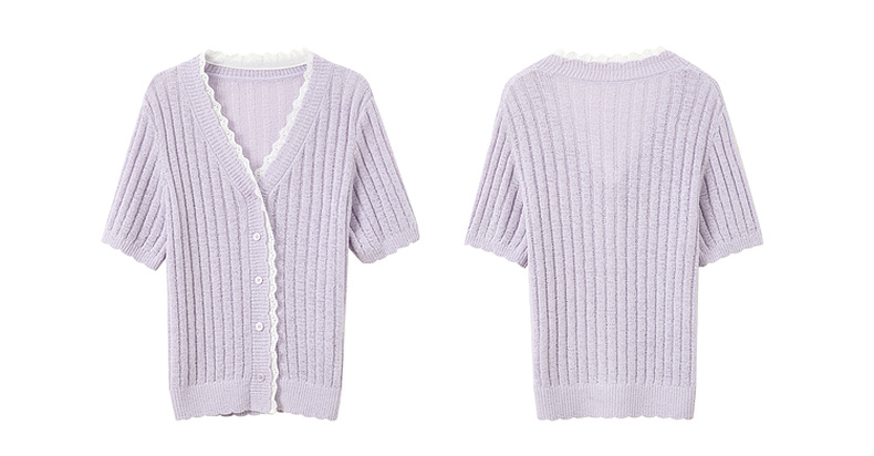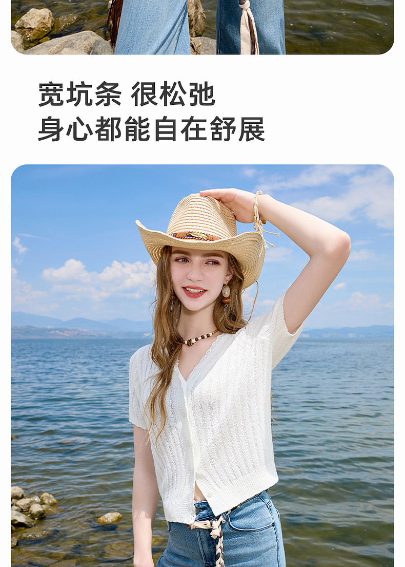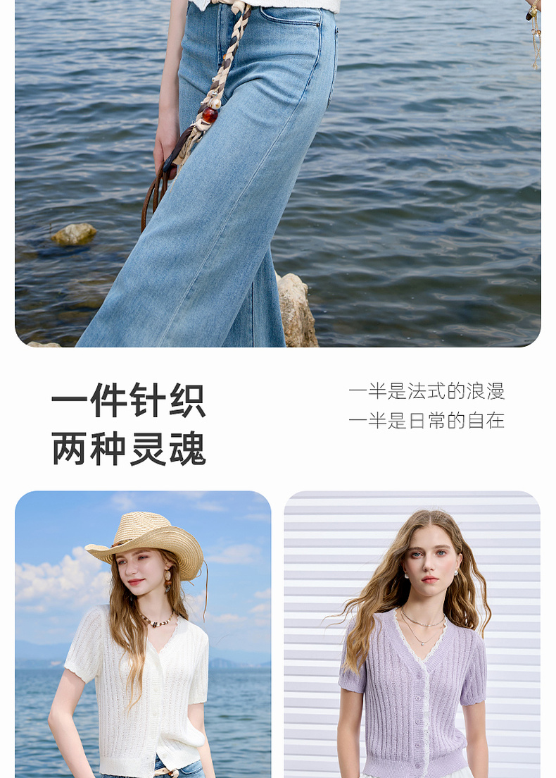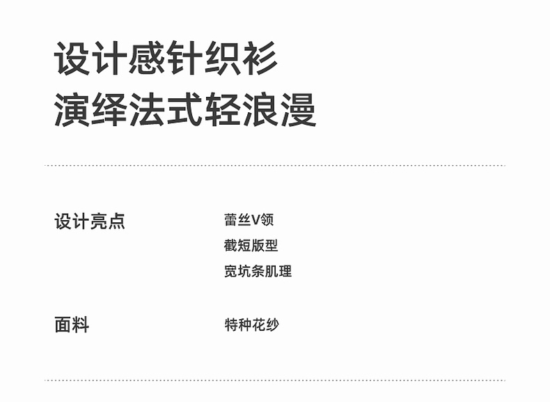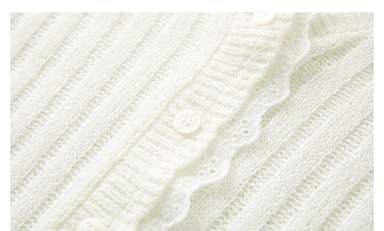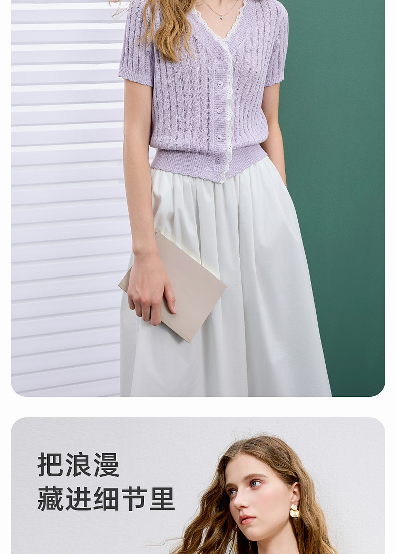 三彩2025秋季新款简约V领蕾丝花边针织衫肌理感小开衫短袖M