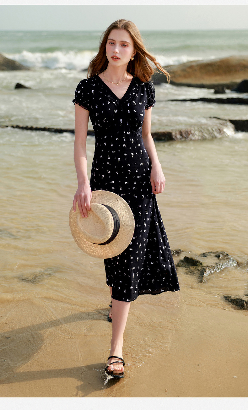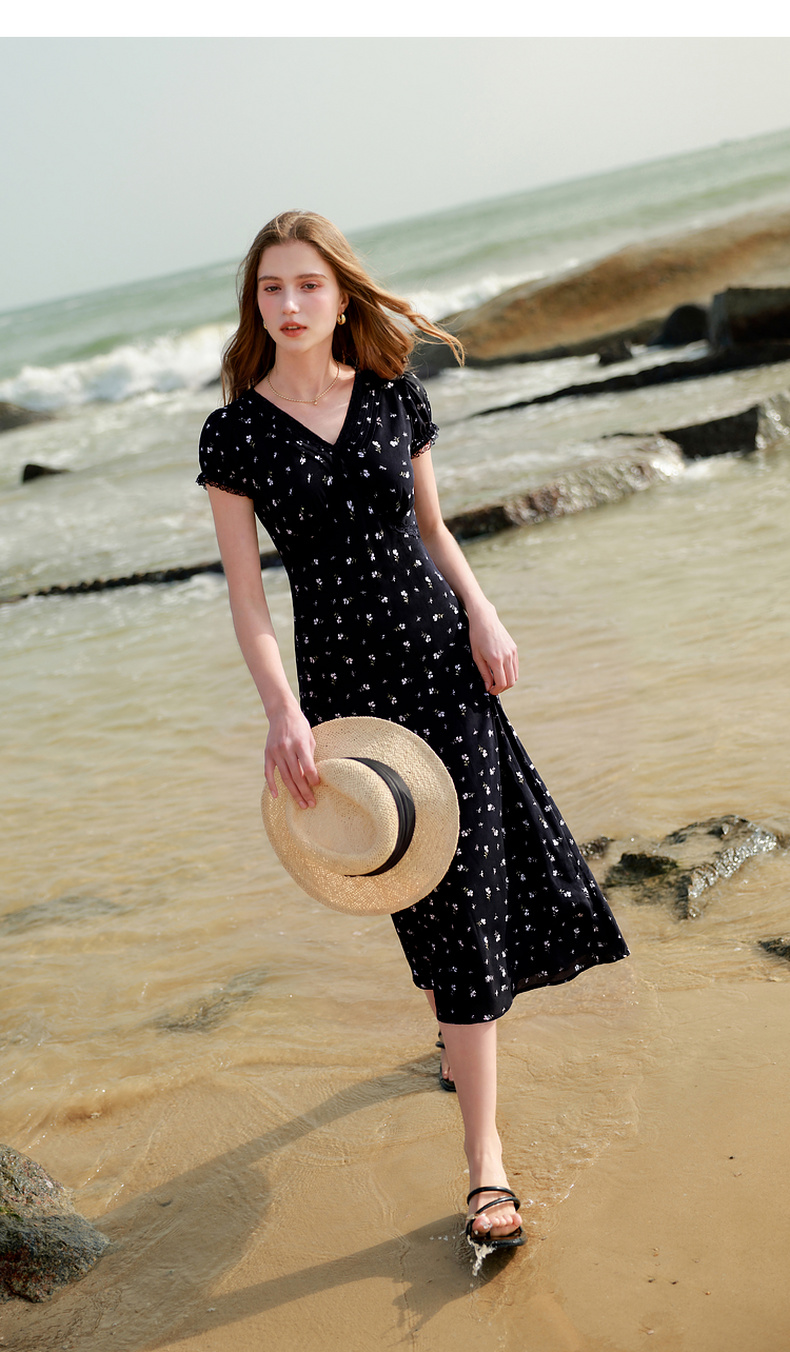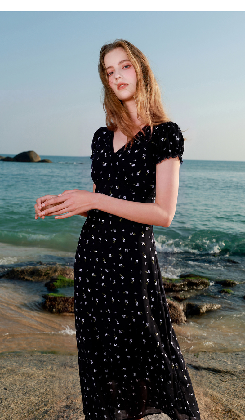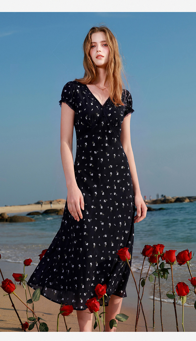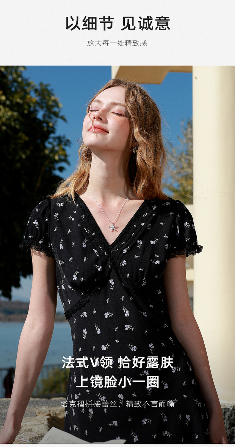 【理想裙】三彩2026春季新款法式蕾丝V领碎花裙A字裙连衣裙浪漫M