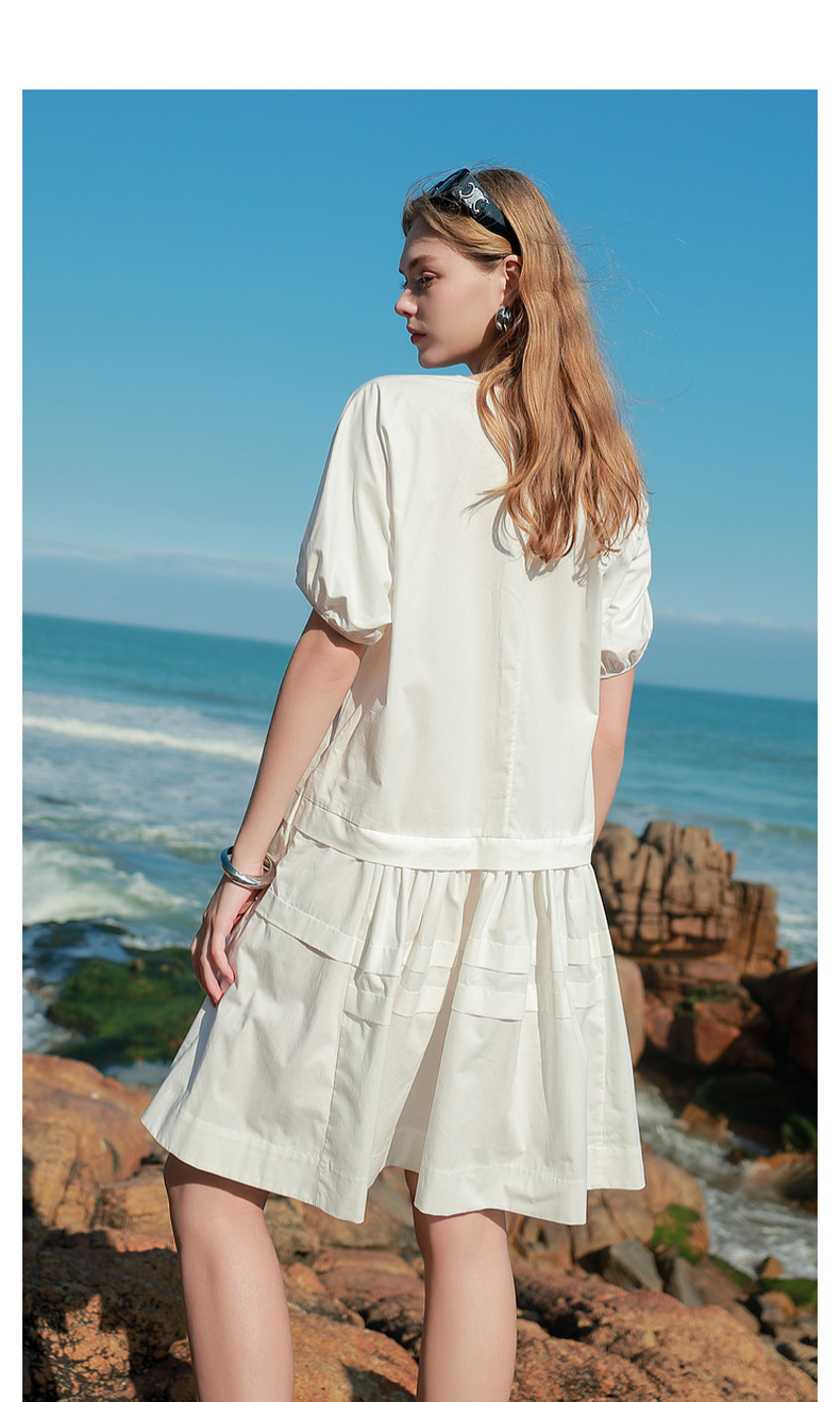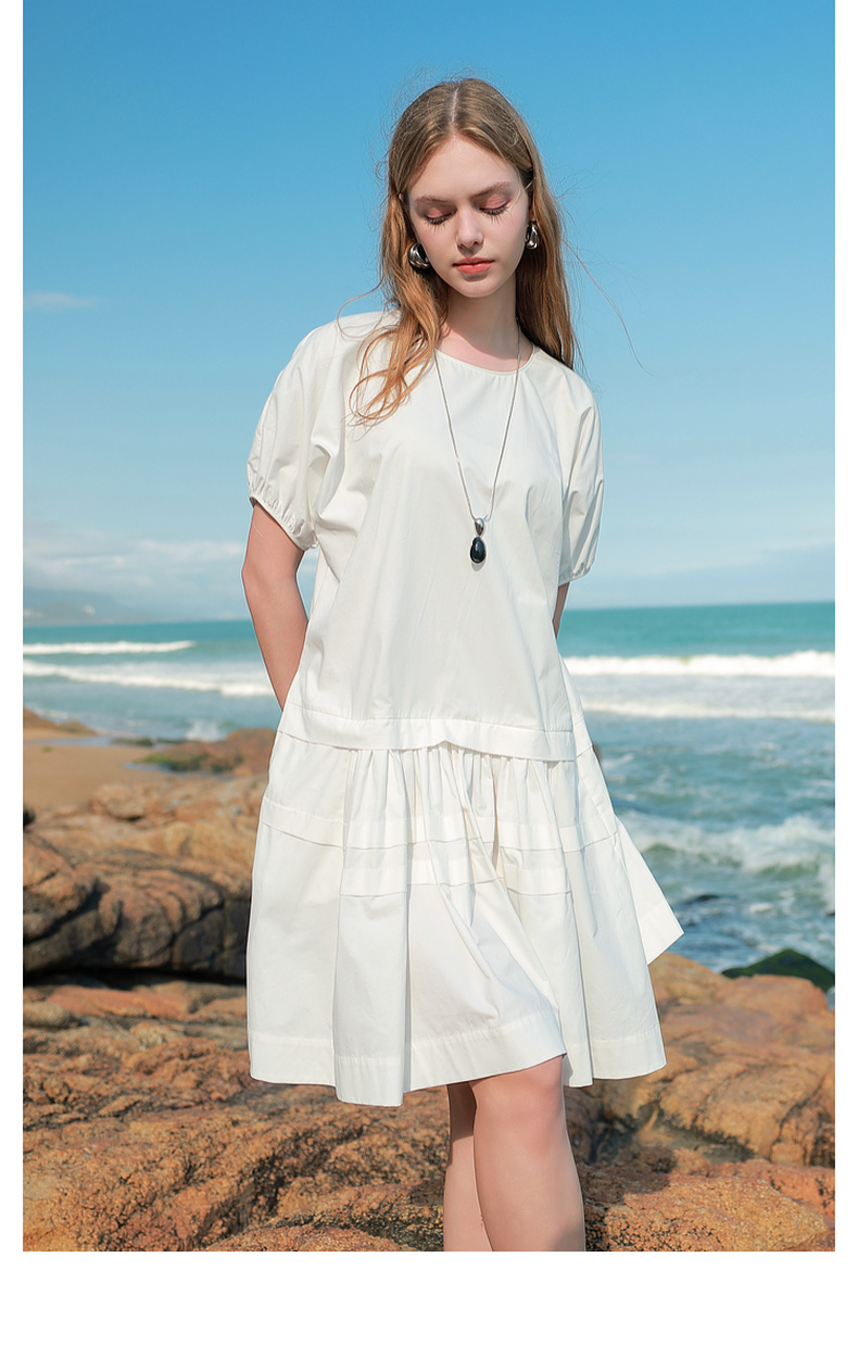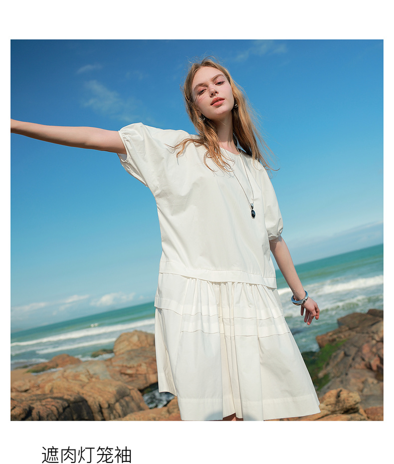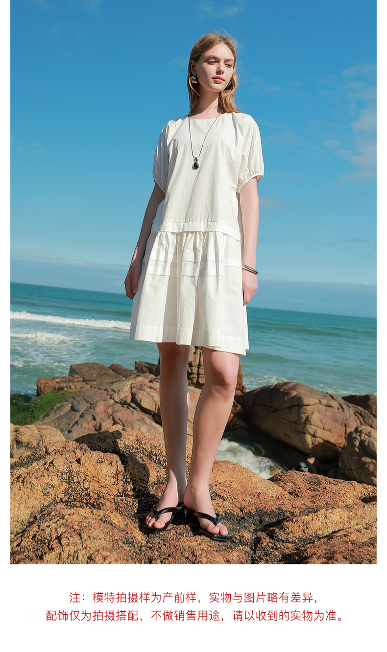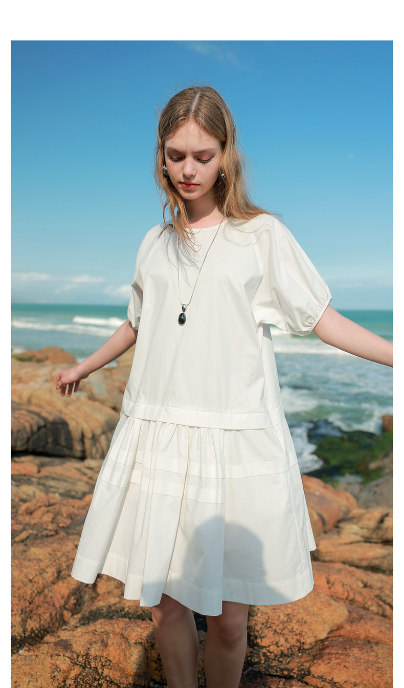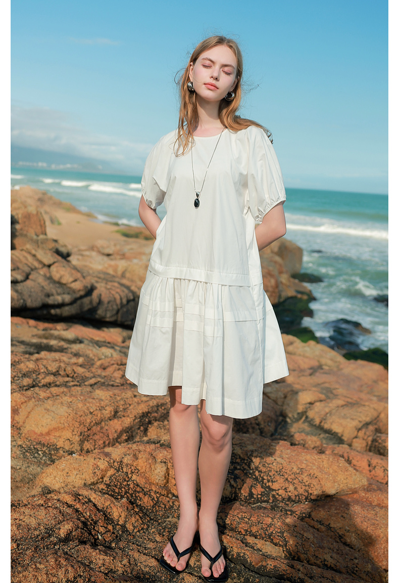 三彩2025夏季新款纯棉小白裙宽松娃娃裙圆领灯笼袖连衣裙中裙M