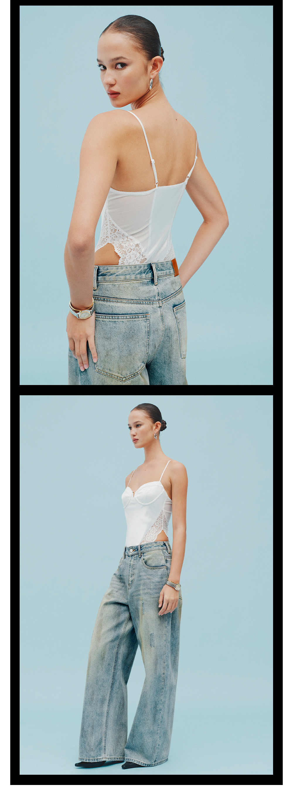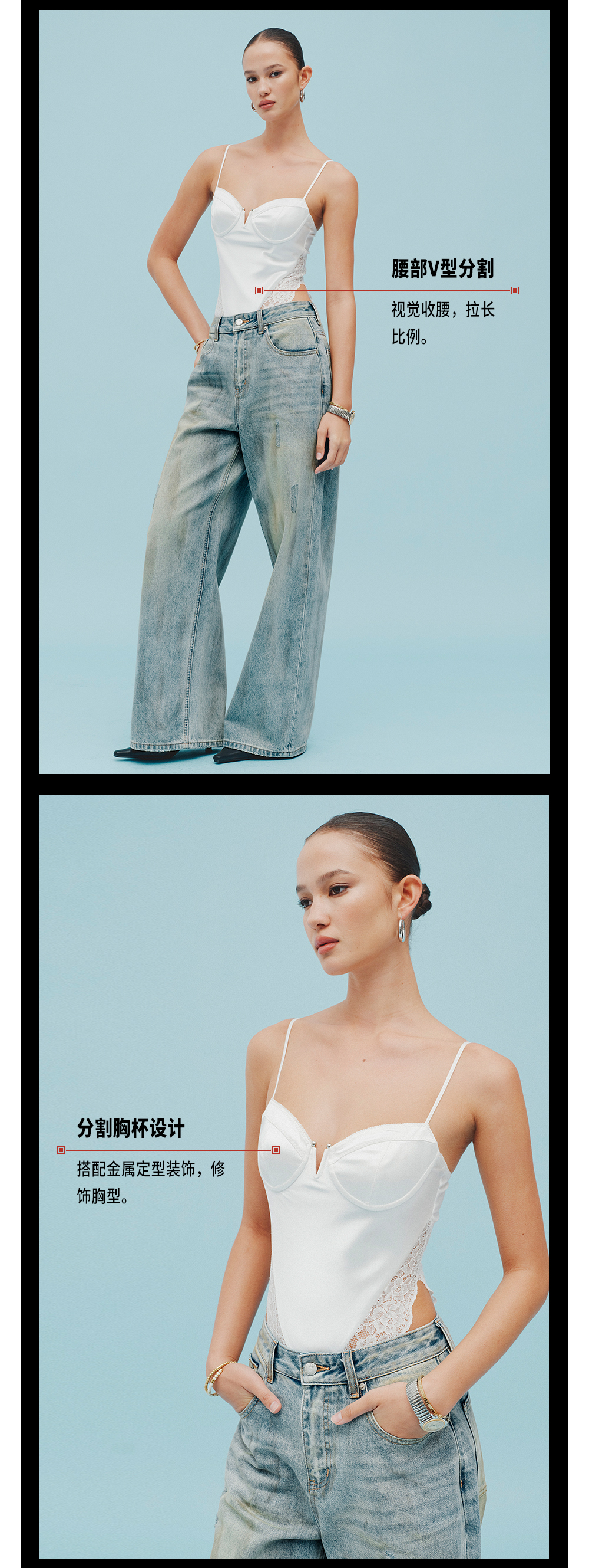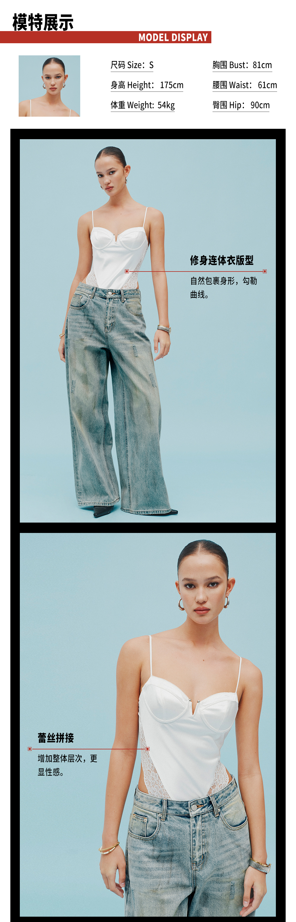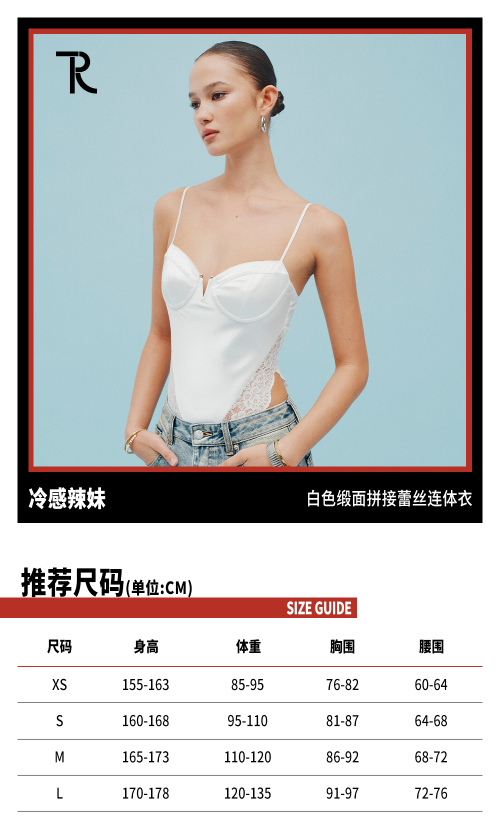 TR她热 冷感辣妹 白色缎面拼接蕾丝修身性感显瘦小V领连体衣上衣 预售