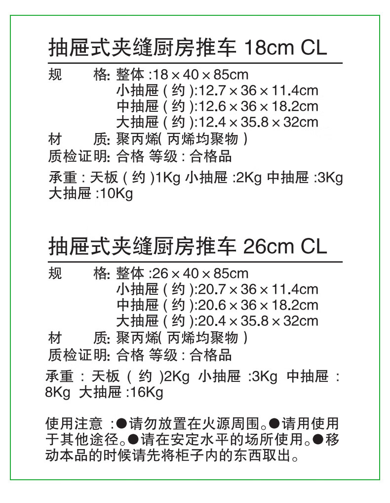 抽屉式夹缝厨房推车 宽约18cm/26cm