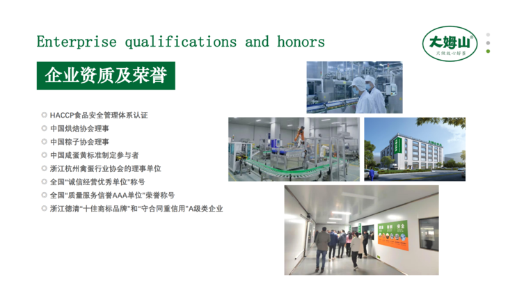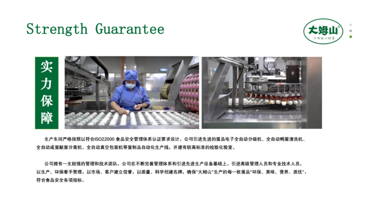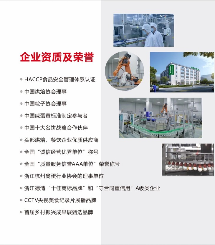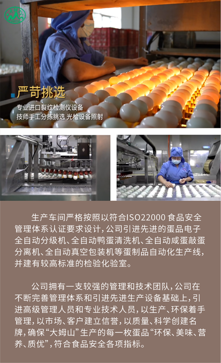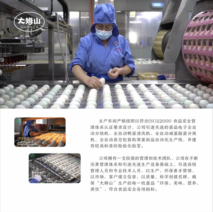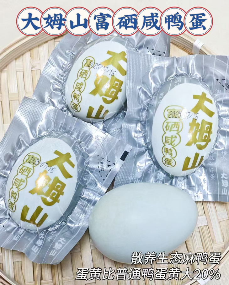 🔥 为什么选择大姆山富硒咸鸭蛋? ✅大姆山咸鸭蛋腌制技艺荣获“第七批德清县非物质文化遗产代表性项目”,坚持传统腌制,口感好 ✅大姆山持续丰富产品线,2024年独创研发出了【富硒咸鸭蛋】👍👍 ✅大姆山鸭蛋的工厂,也是最现代化的工厂,拥有湖州鸭蛋厂家最先进的专业设备,形成从养殖、加工到销售的全链条发展,品牌影响力不断扩大 ✅公司有着成熟的市场化运作机制,与全国知名烘培,餐饮等品牌均有合作,并有着强大的全国经销网络,近盖江浙沪,皖闵赣,远达宁青新,粤桂琼。同时荣登央视春晚,央视美食展播 ✅HACCP食品安全管理体系认证等等荣誉 给消费者的舌尖安全承诺💯💯 放心吃❗❗品质保障👍👍