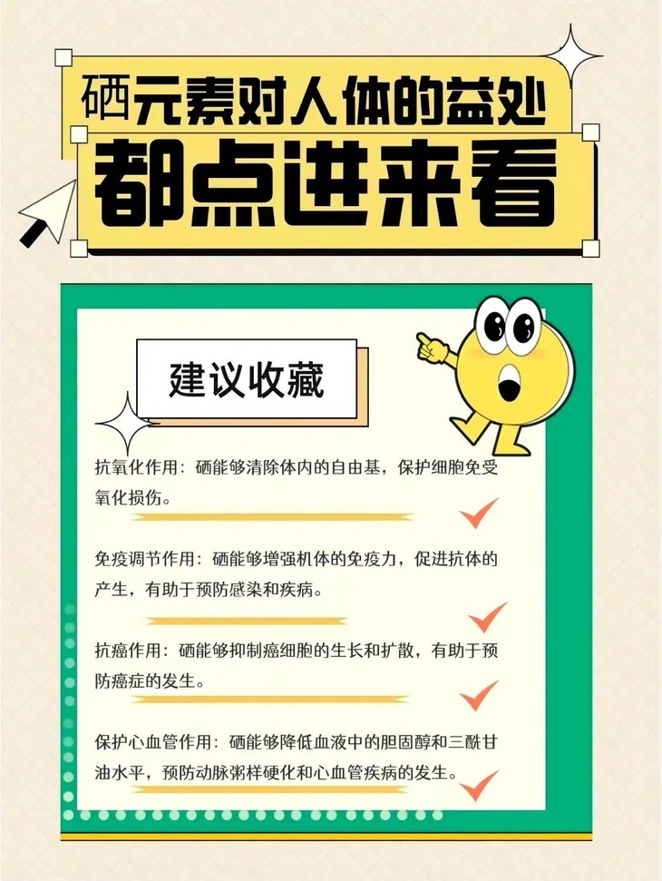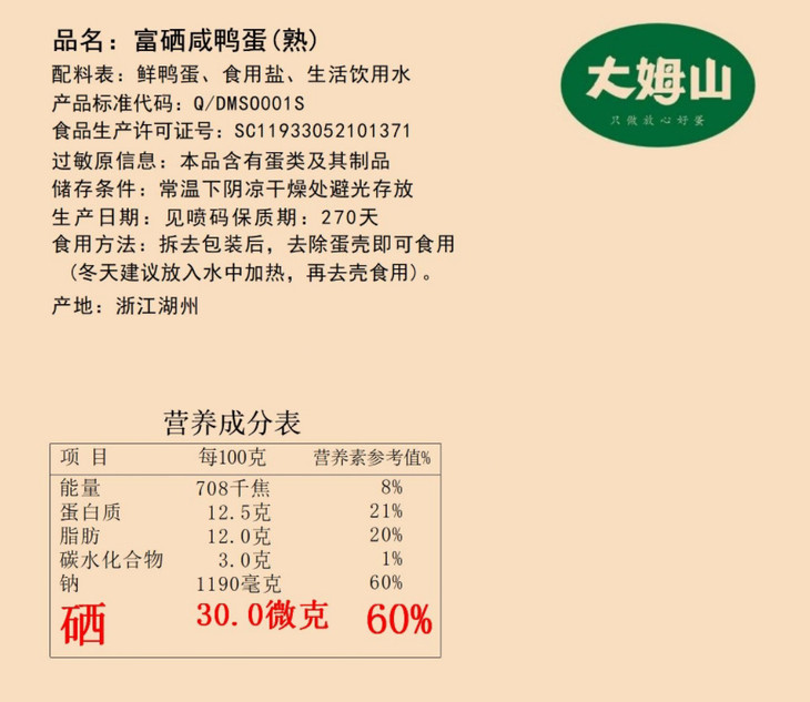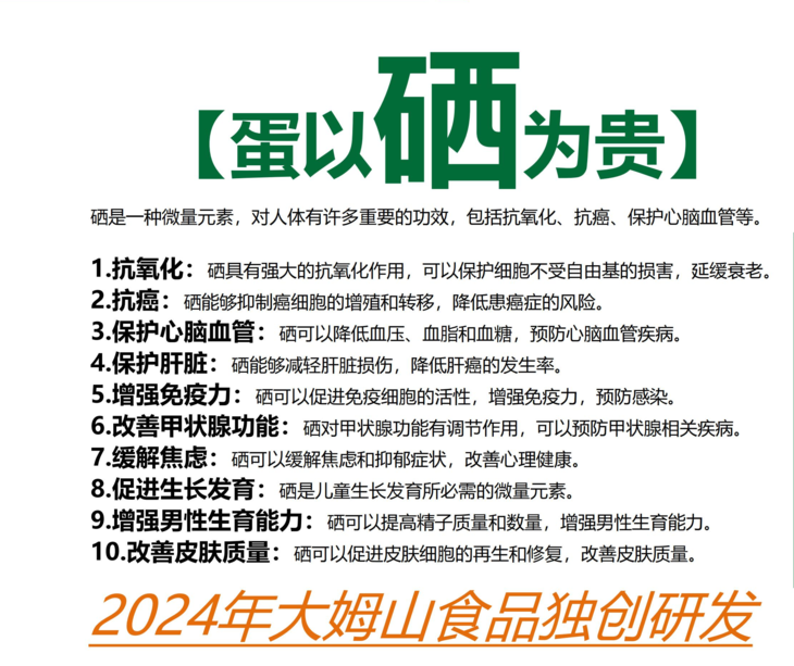 蛋以硒为贵,大姆山富硒咸鸭蛋每100g的硒含量占比为60% 硒是人体必需的微量元素之一,在人体健康中起着重要作用 ✅抗氧化:硒具有强大的抗氧化作用,延缓衰老 ✅保护心脑血管:硒可以降低血压、血脂和血糖,预防心脑血管疾病。 ✅保护肝脏:硒能够减轻肝脏损伤 ✅增强免疫力:硒可以促进免疫细胞的活性,增强免疫力 ✅改善用状腺功能:硒对甲状腺功能有调节作用 ✅缓解焦虑:硒可以缓解焦虑和抑郁症状,改善心理健康。 ✅促进生长发育:硒是儿童生长发育所必需的微量元素。 ✅改善皮肤质量:硒可以促进皮肤细胞的再生和修复,改善皮肤质量