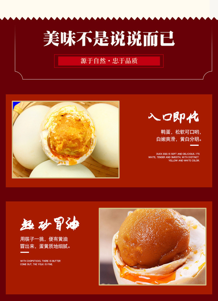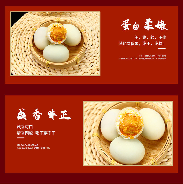 【温馨提示】鸭蛋不是工业制品,受鸭子进食多样性影响,鸭蛋蛋壳密度厚度都不一样,所以咸度会有差异,虽用盐量时间均一样但出来的咸度仍会有差异,如果咸度高了还请不要空口食用,谢谢理解。