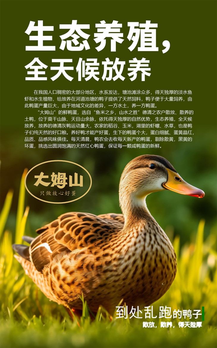 蛋品好的鸭蛋,才能做出一颗好吃的咸鸭蛋❤ 大姆山的鲜鸭蛋,只用放养蛋,选自“鱼米之乡,山水之胜”德清之农户散放、散养的麻鸭 麻鸭蛋相比普通鸭蛋,营养价值更高,是一种高营养价值的食物, 富含优质蛋白质、维生素A、B族维生素、维生素D、矿物质(如钙、铁、锌)及卵磷脂等成分。 它不仅能提供人体必需的能量,还对骨骼健康、视力保护、免疫力提升有积极作用 德清的水环境优良,位于莫干山脉、天目山余脉 依托得天独厚的自然优势,生态养殖,农家的稻谷,玉米,湖里的虾螺,水草,都是鸭子们纯天然的口粮, 养好鸭才能产好蛋,生下的鸭蛋个大,蛋白细腻,蛋黄晶红 鸭农每天会精心挑选出圆润饱满的天然红心鸭蛋,剔除散黄,黑黄的坏蛋,保证每一颗咸鸭蛋的新鲜🥰