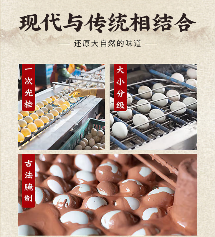 🦆🥚遵从传统裹泥做法, 减少用盐量 鸭蛋腌制选用的配料,志在极致 红泥、食盐、水,以5:1比例混合,将当天的新鲜麻鸭蛋裹起来。 按照一定比例调配后,均匀的裹附在鸭蛋上 因用的盐份少,所以盐分进入的慢 40天+是常规时间 ,不着急 ,不求速度,不求产量,只为口感和健康 封坛45天以上的鸭蛋,历经时间的洗礼,再清洗干净外表的红泥, 挑走破损蛋,留下优质好蛋,真空包装和杀菌后运送到您的手里。 每一枚鸭蛋大小均匀,经过层层筛选,无空壳,开袋即食,蛋白不齁咸蛋黄起沙流油,每一口都层次感十足。