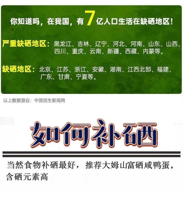 你知道吗? 在我国,有7亿人口生活在缺硒地区! 严重缺硒地区:黑龙江、吉林、辽宁、河北、河南、山东、山西、四川、重庆、云南、新疆、西藏、内蒙等 缺硒地区:北京、江苏、浙江、安徽、湖南、江西北部、福建,广东、甘肃、宁夏等。 如何补硒? 当然食物补硒最好,推荐大姆山富硒咸鸭蛋 含硒元素高👍👍 每100g硒含量≥30µg 鸭蛋中的硒是一种有机硒--硒蛋白是目前世界上已知的最好的硒营养补充剂,其吸收率高达80%