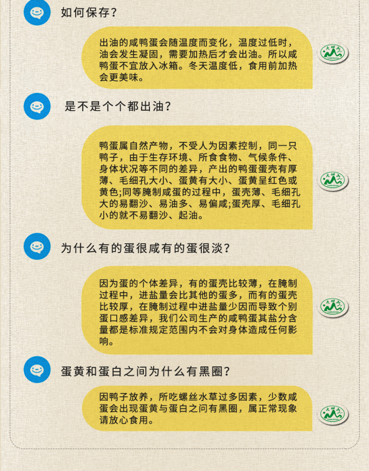 【售后规则】 1、食品类非质量问题不支持7天无理由退换货 2:若收到产品有质量问题或者破损少件,请签收24小时内对产品拍照+快递箱面单照片联系售后处理 3:个人口味问题不在售后范围内 4、咸鸭蛋为真空包装,快递运输中个别难免会有破损情况,只要真空袋不破,都可以正常食用,不予赔付,严重压破情节导致流油等情况请在24小时内对产品拍照+快递箱面单照片联系售后处理