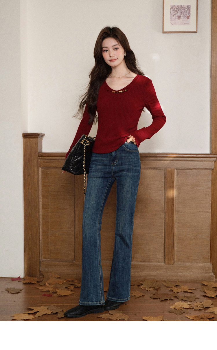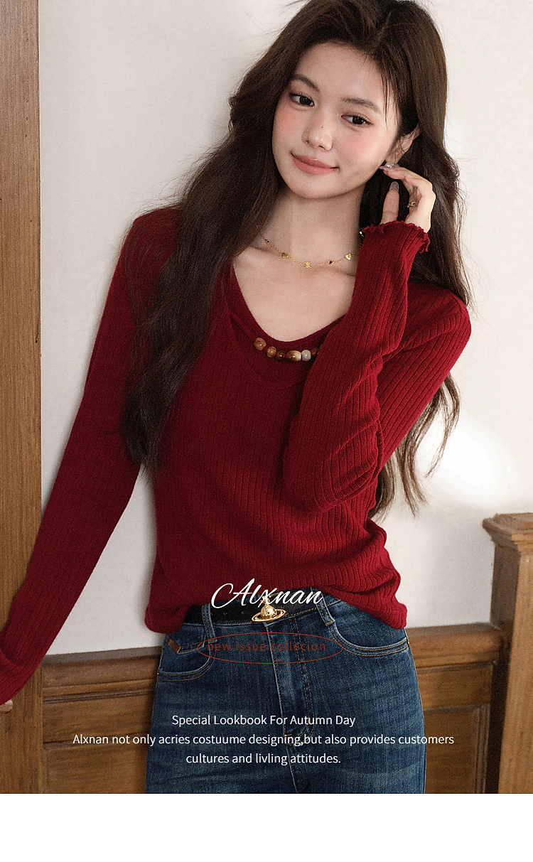 鹿向南「心动瞬间」复古红长袖针织t恤女早秋修身设计感内搭上衣