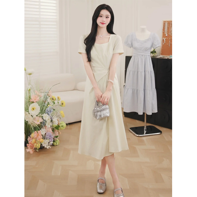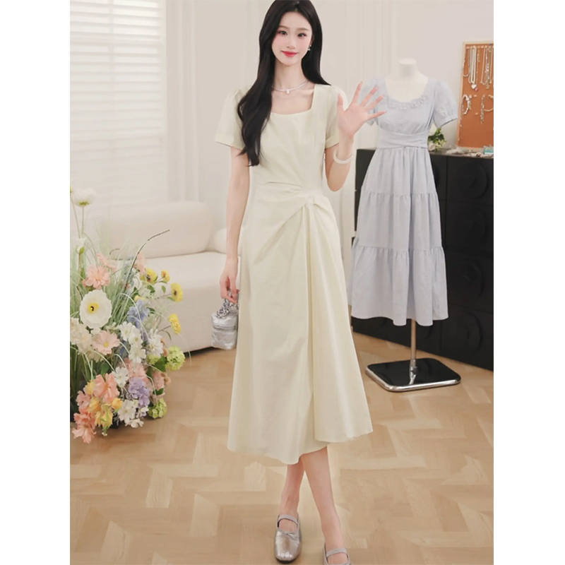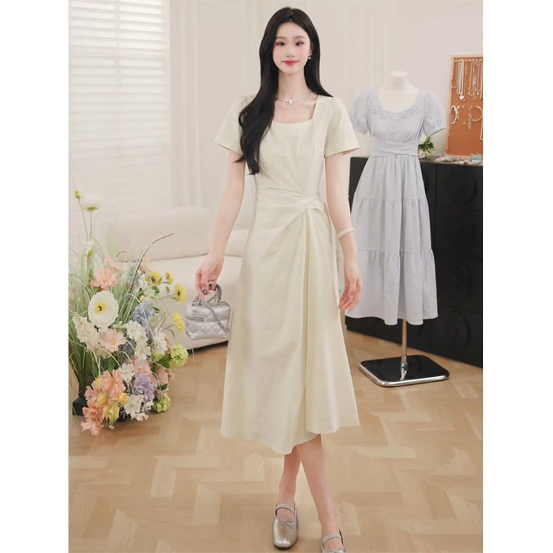 【6折秒杀】鹿向南「淡茉奶油」气质方领短袖连衣裙女夏季新款小众高腰长裙子QJD00376