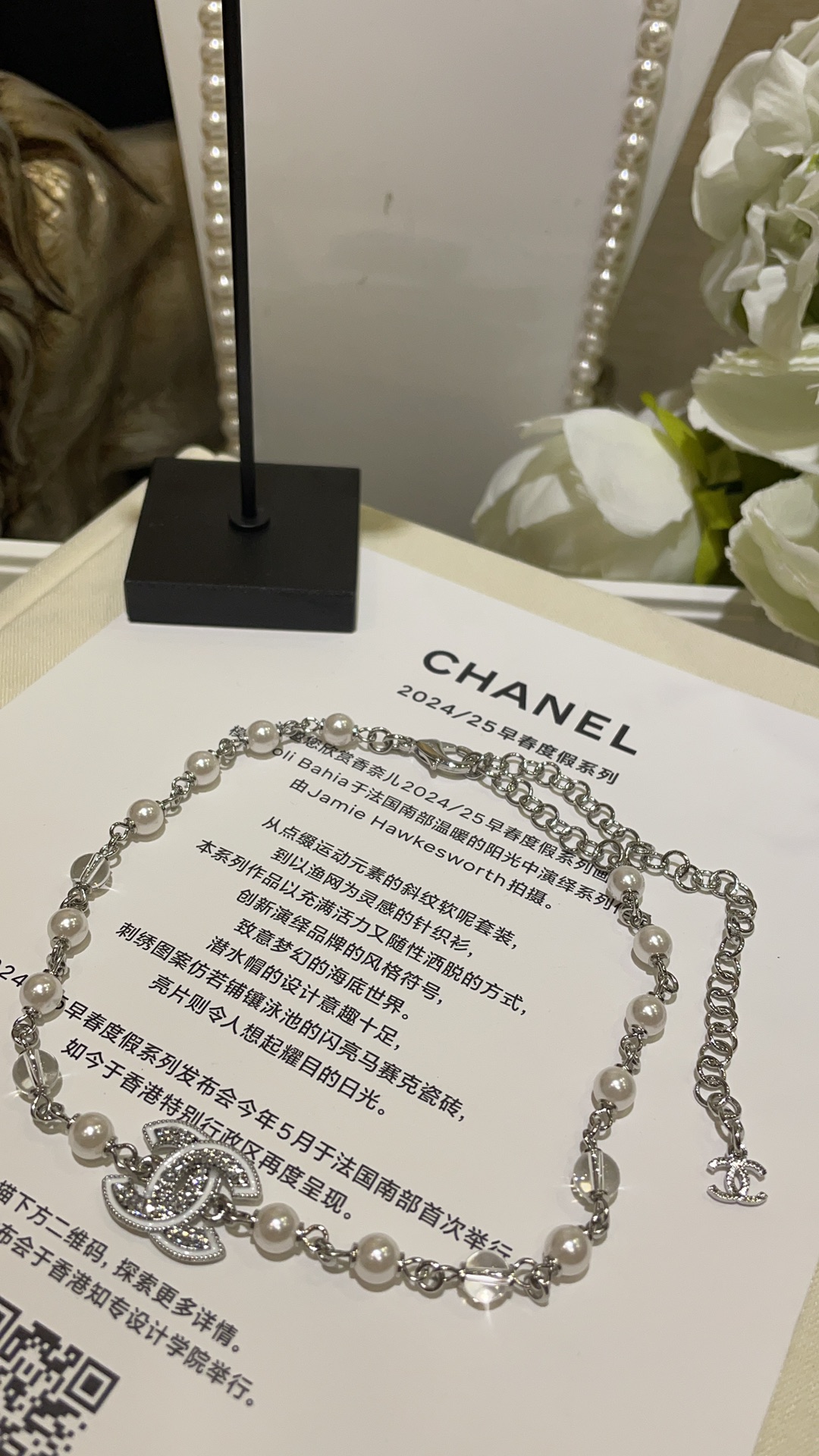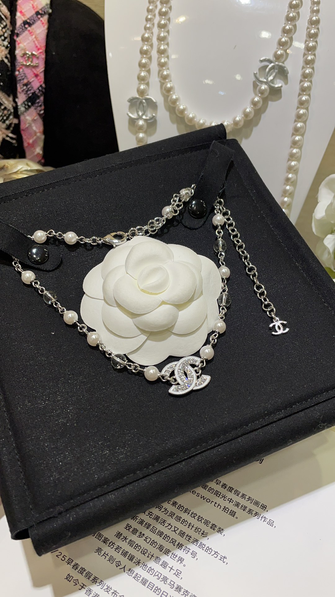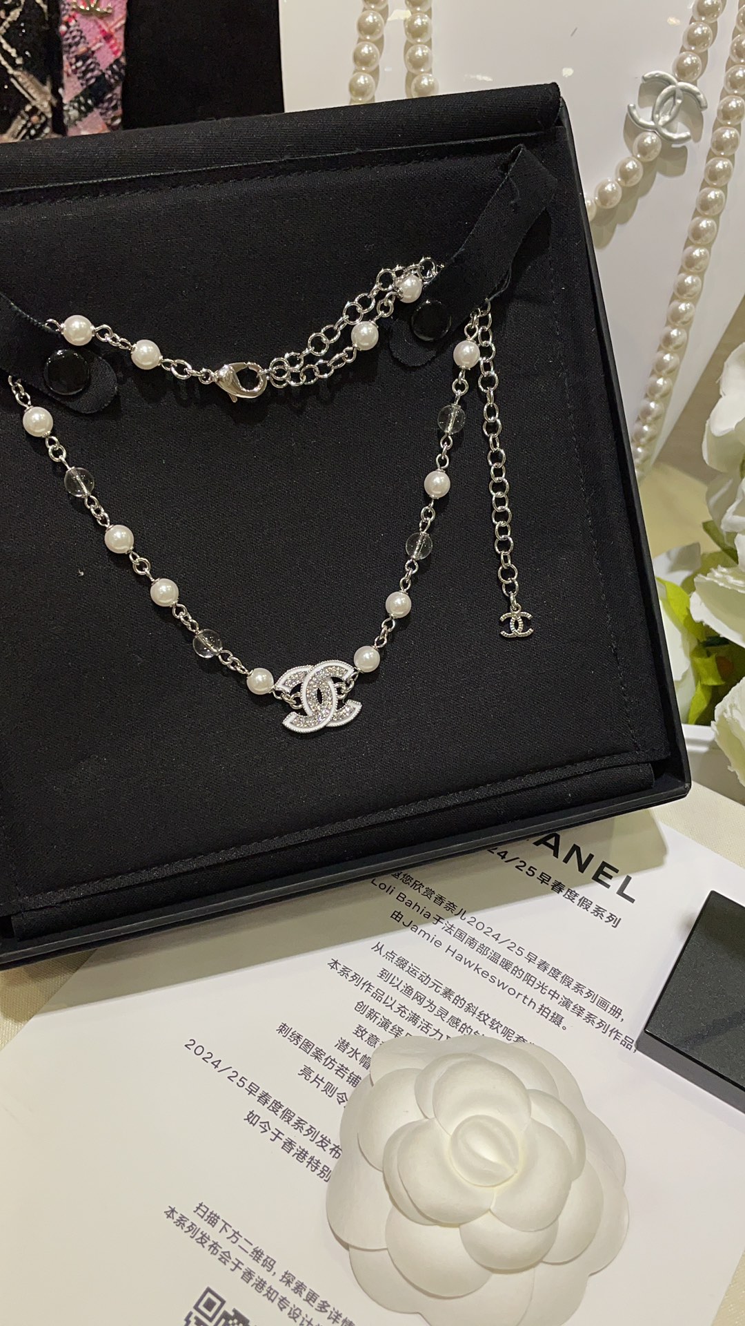 香奶奶 25C新款白色珐琅水钻双C珍珠项链