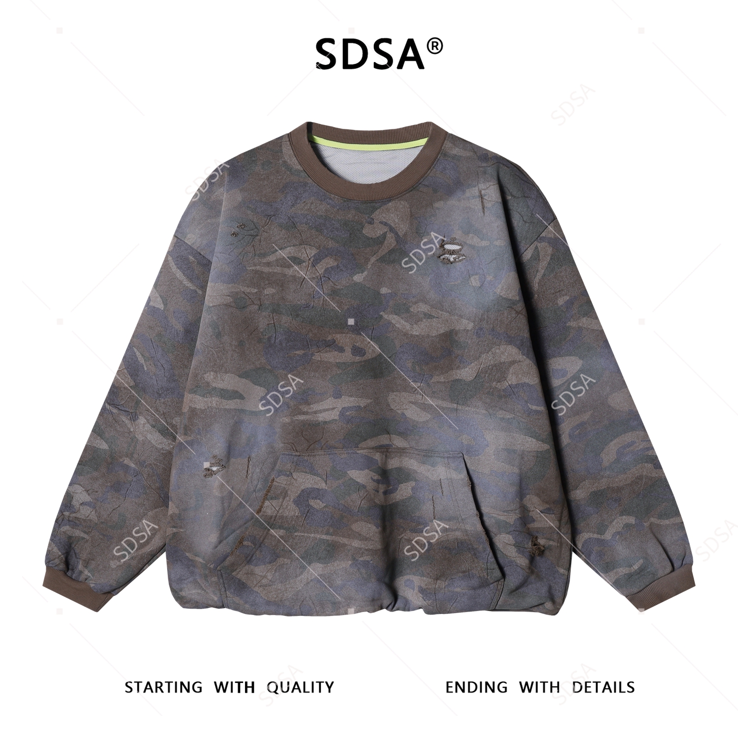 SDSA男士秋冬新款痞帅男装潮牌迷彩扎染破洞圆领卫衣百搭高街上衣
