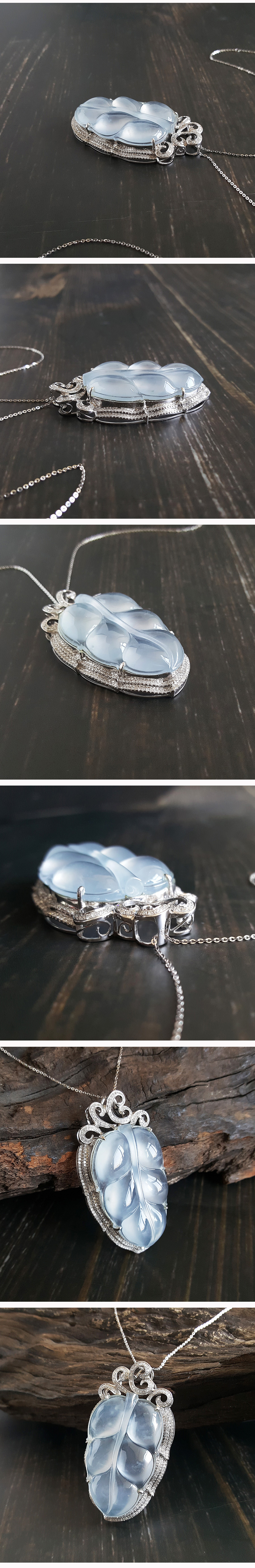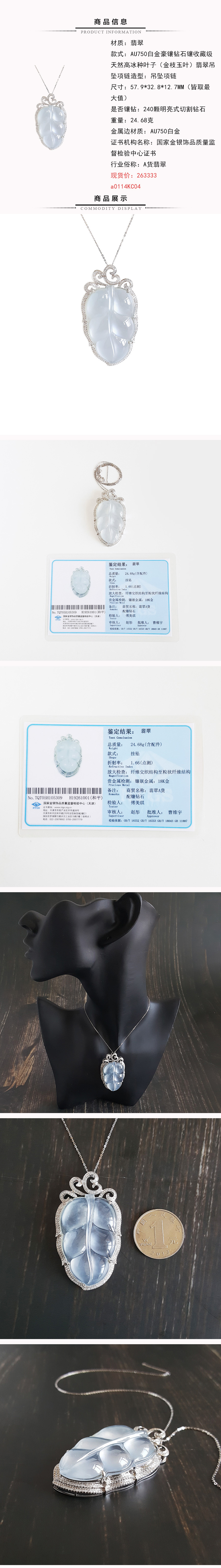 【天然正品】AU750白金 豪镶钻石 镶收藏级天然高冰种叶子 翡翠吊坠项链0114KC04
