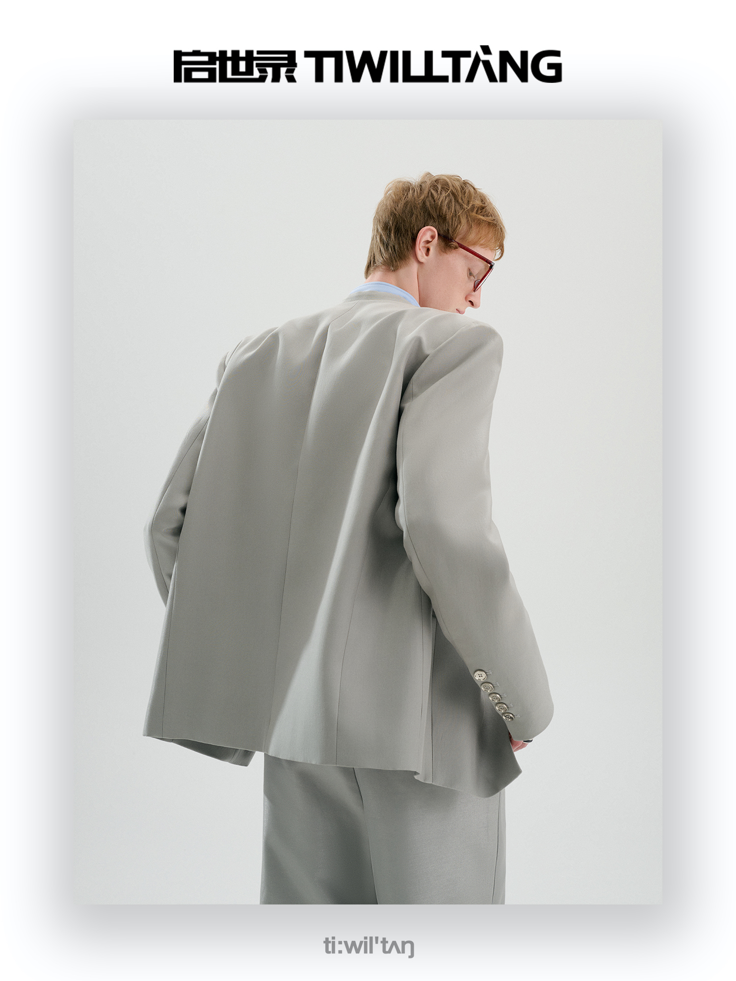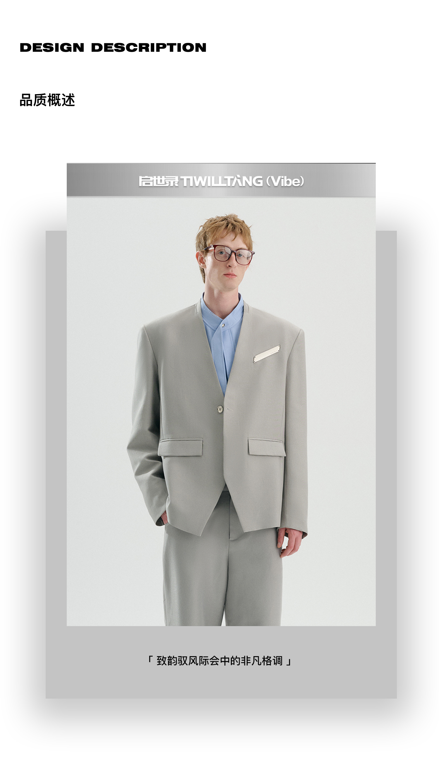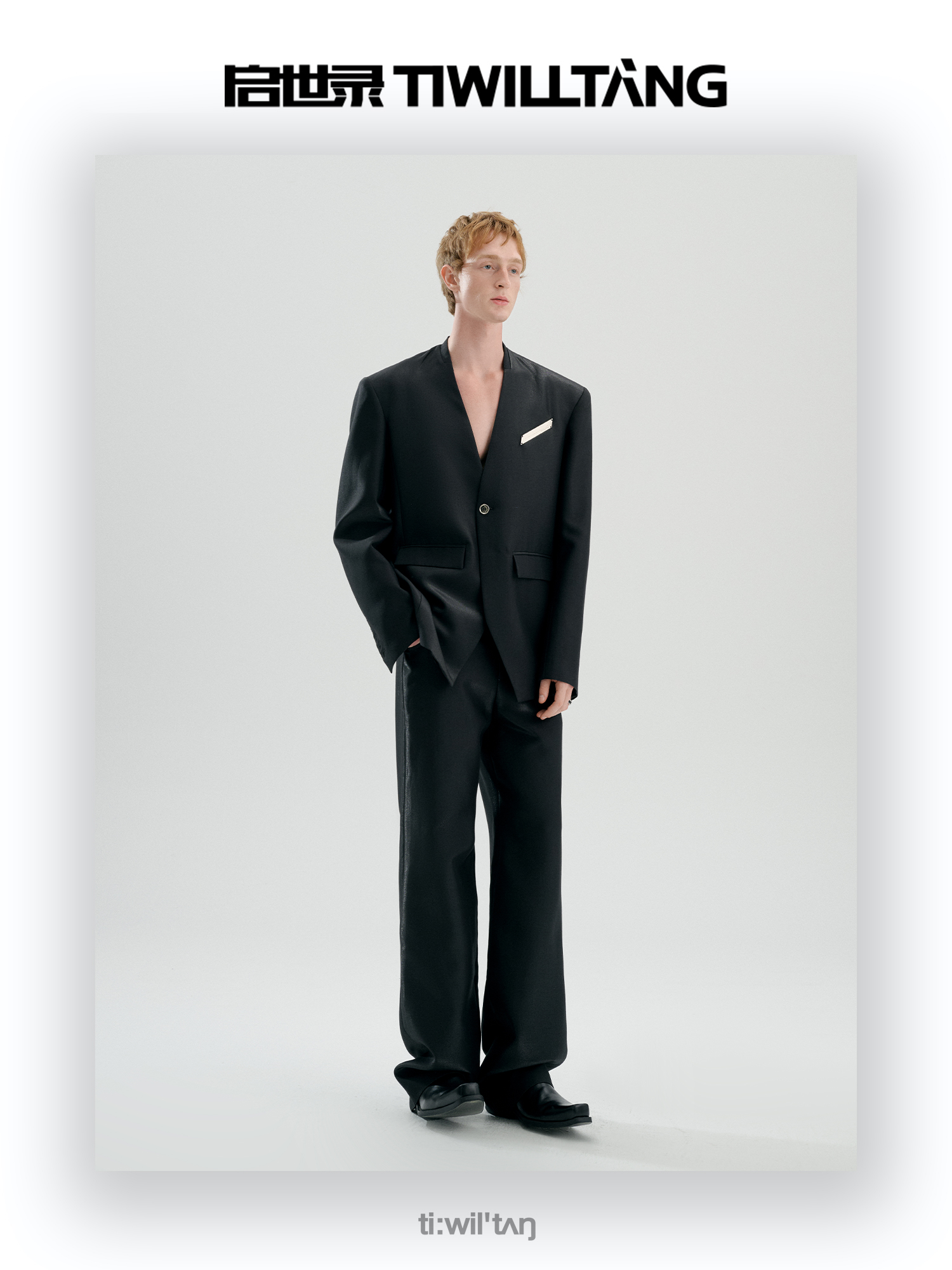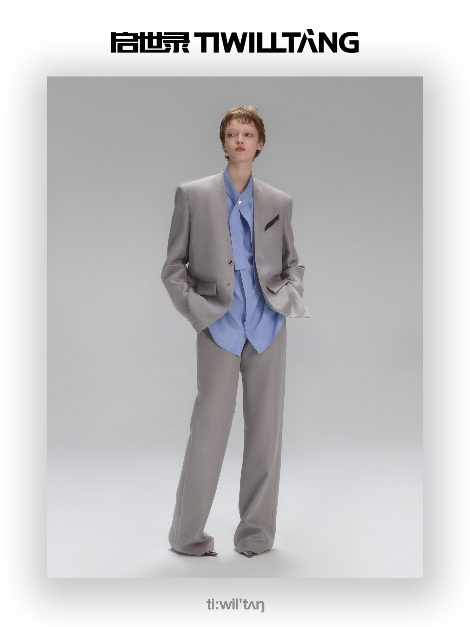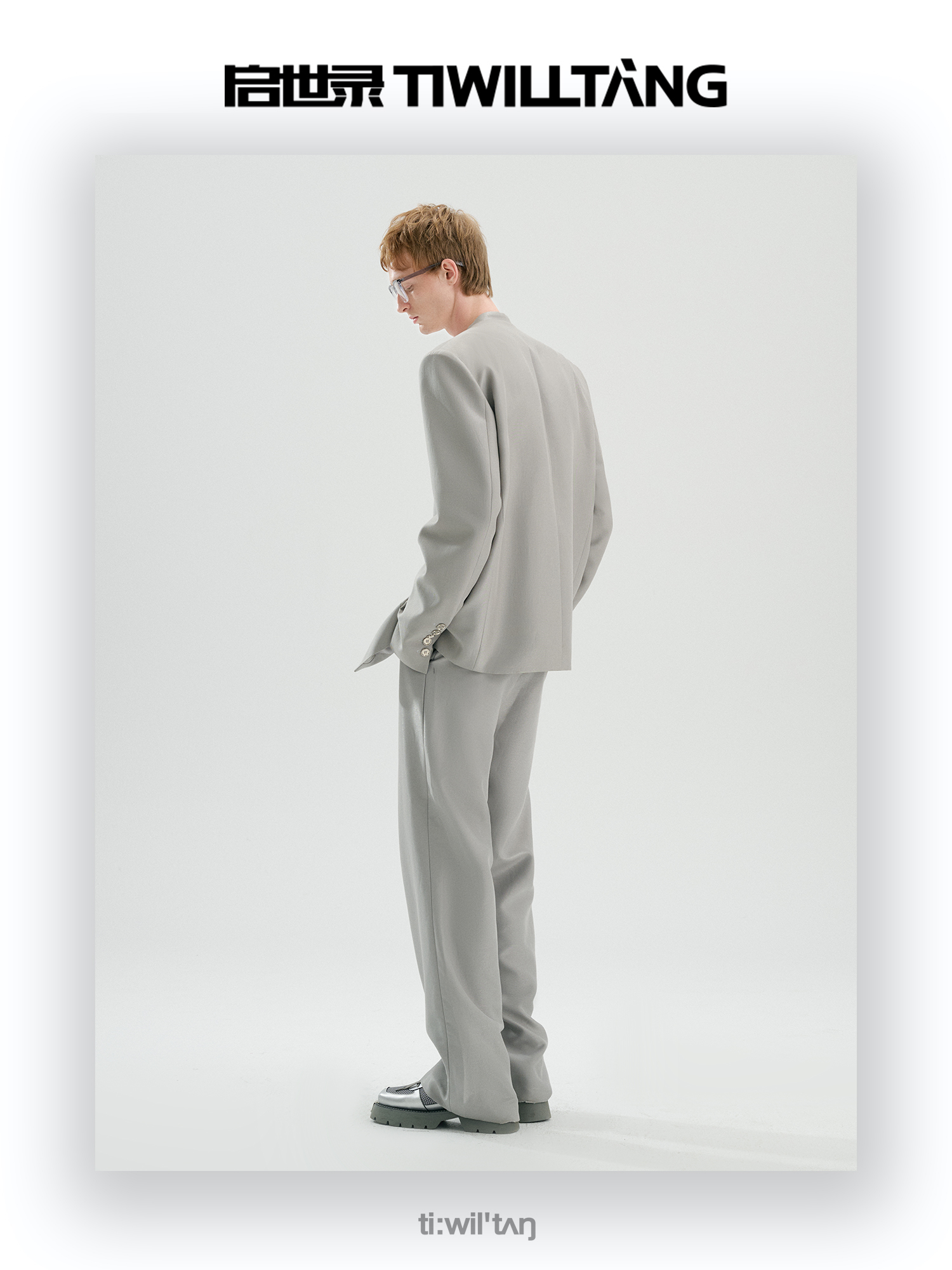 启世录TIWILLTANG“致御格际”金属标无领西装西裤套装