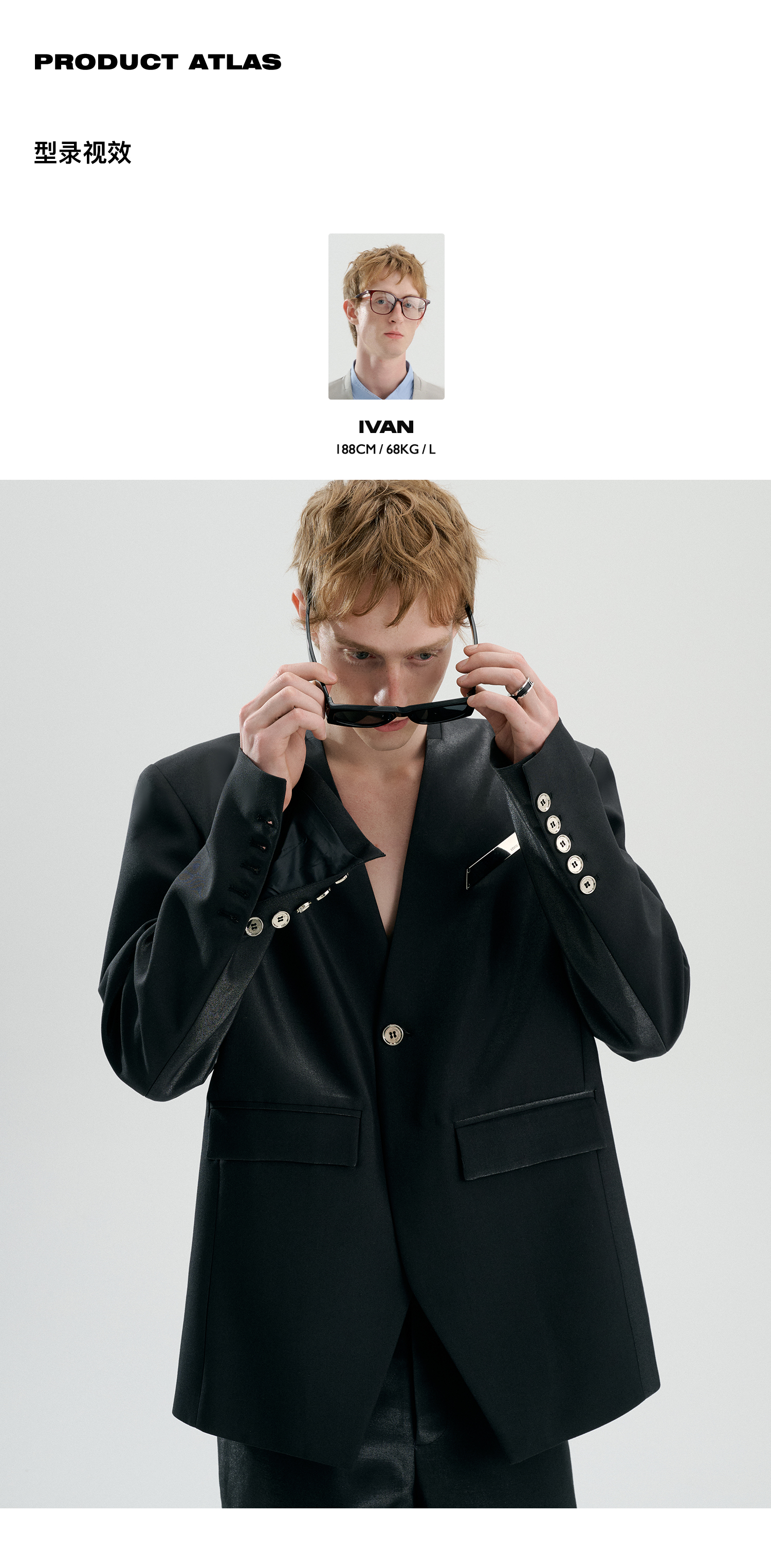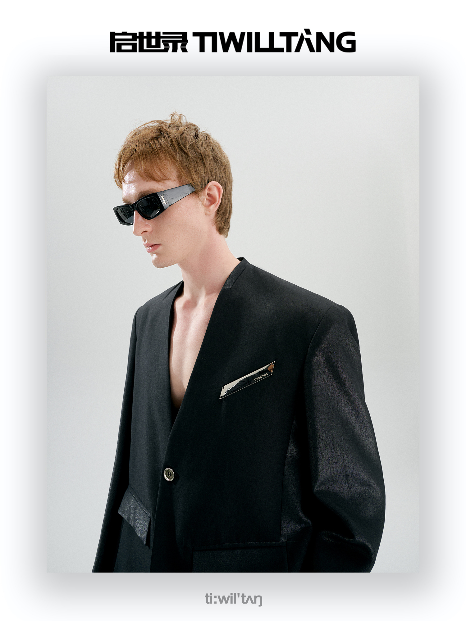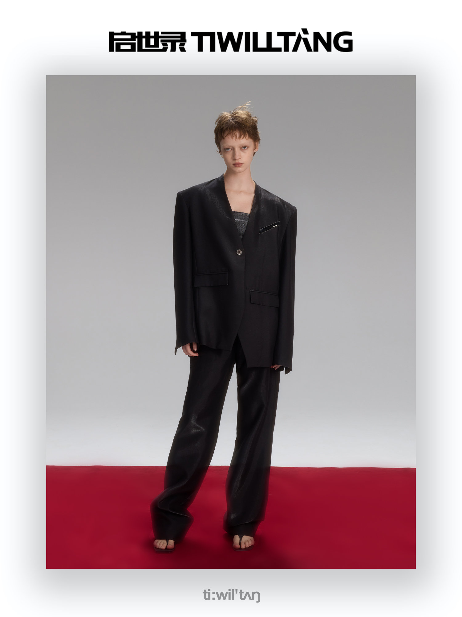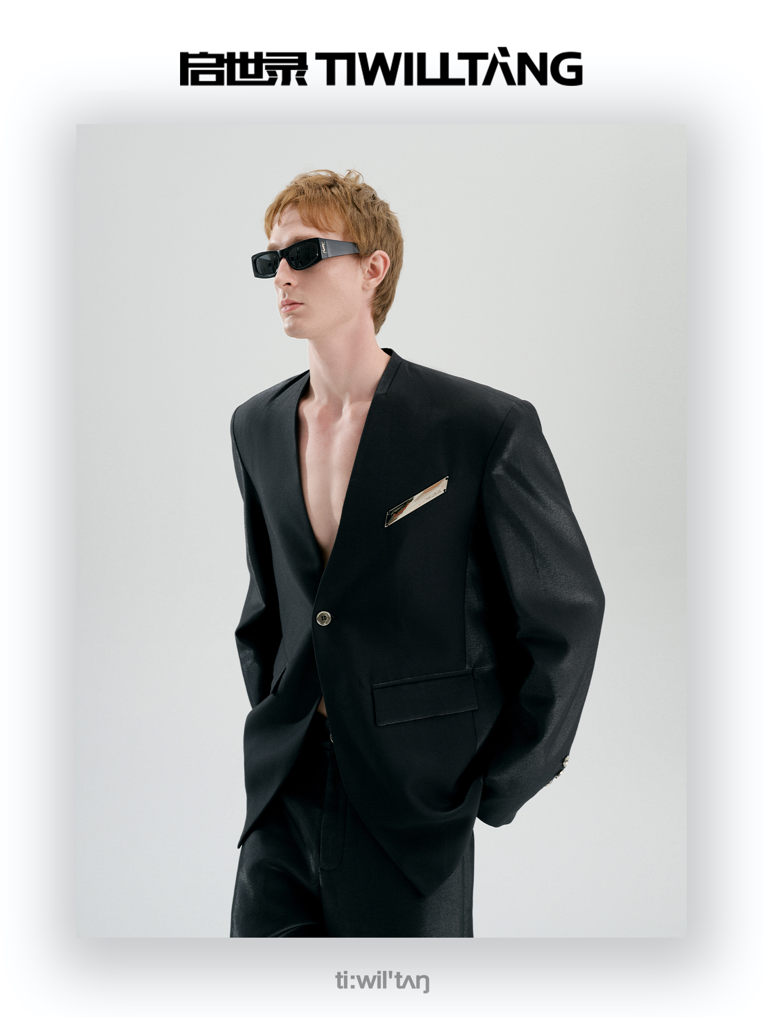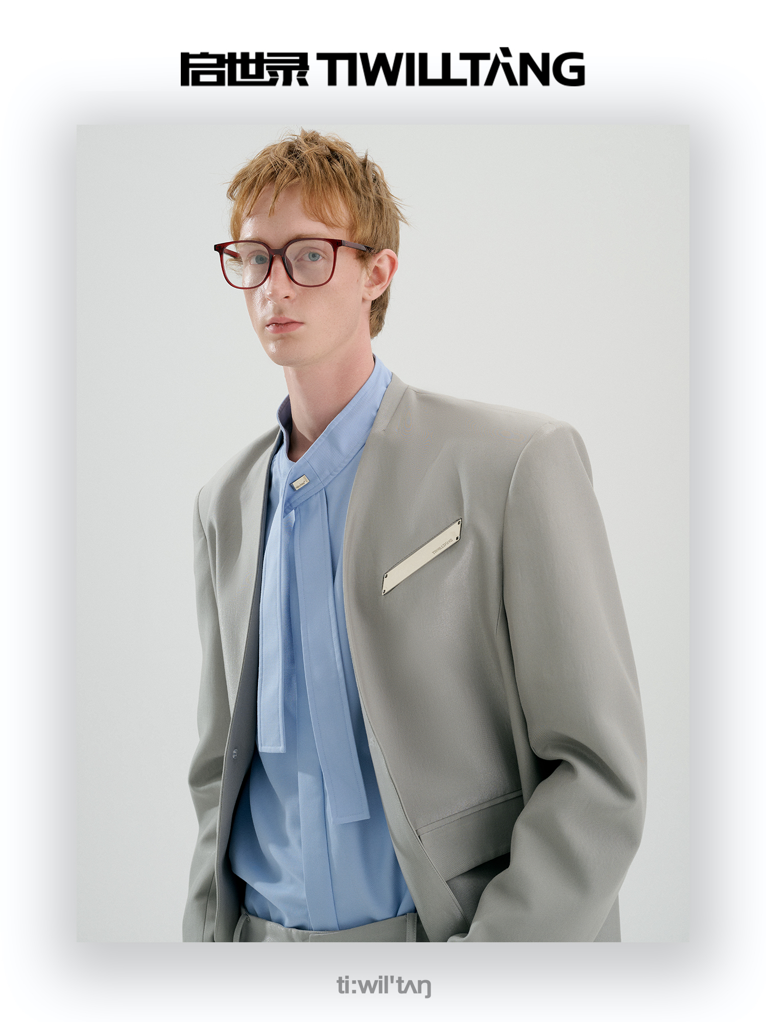 启世录TIWILLTANG“致御格际”金属标无领西装西裤套装