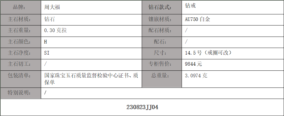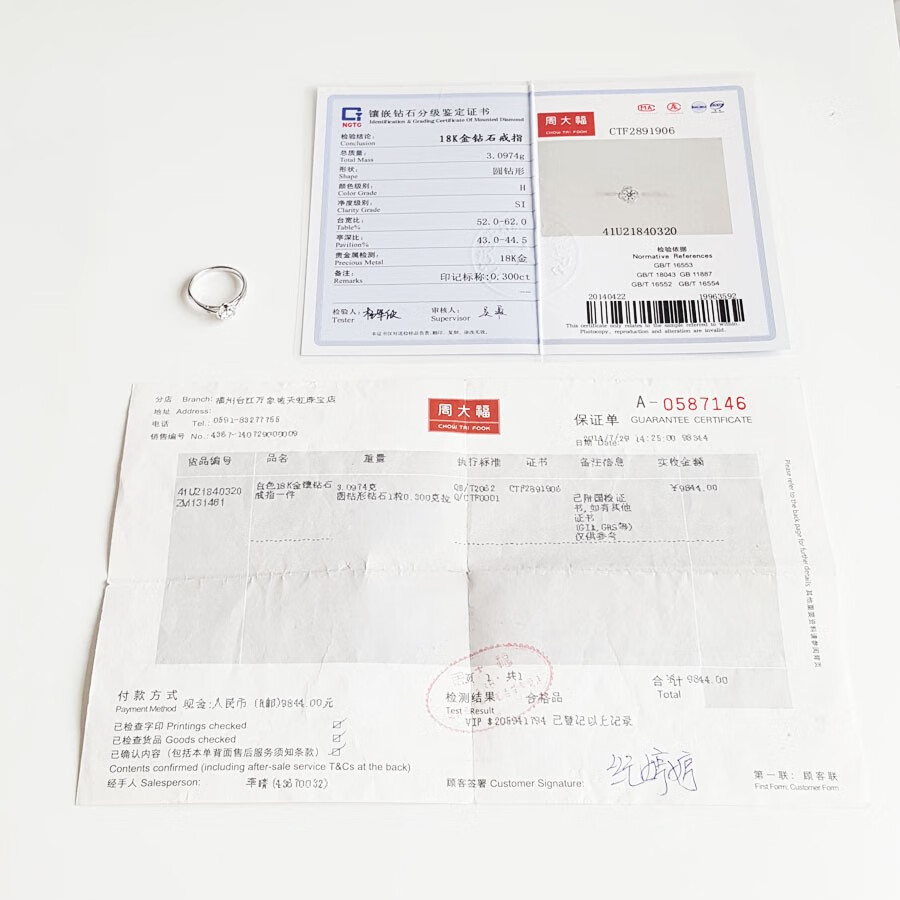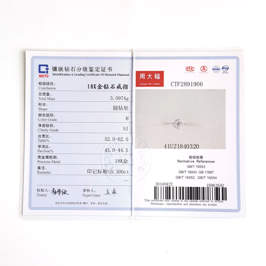 【天然正品】周大福AU750白金钻石戒指0.30克拉H SI 14.5号(戒圈可改)230823JJ04