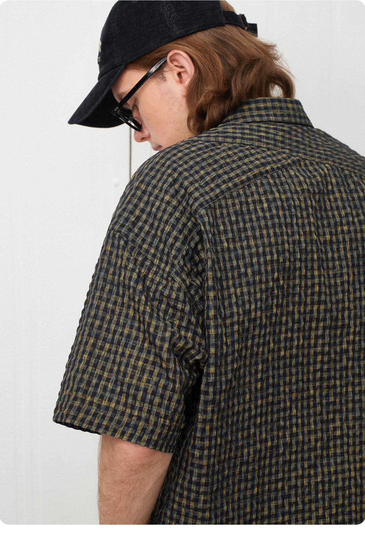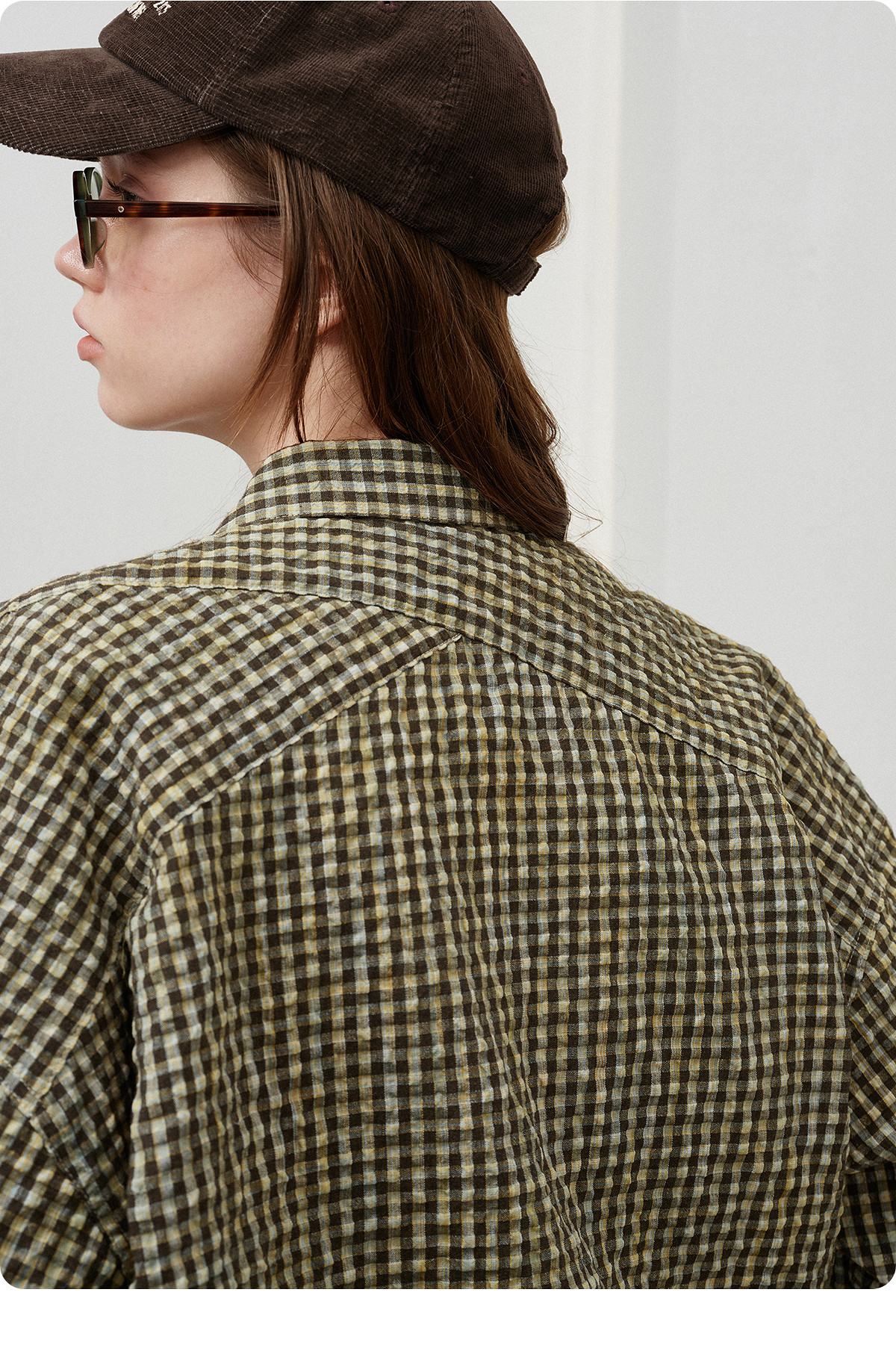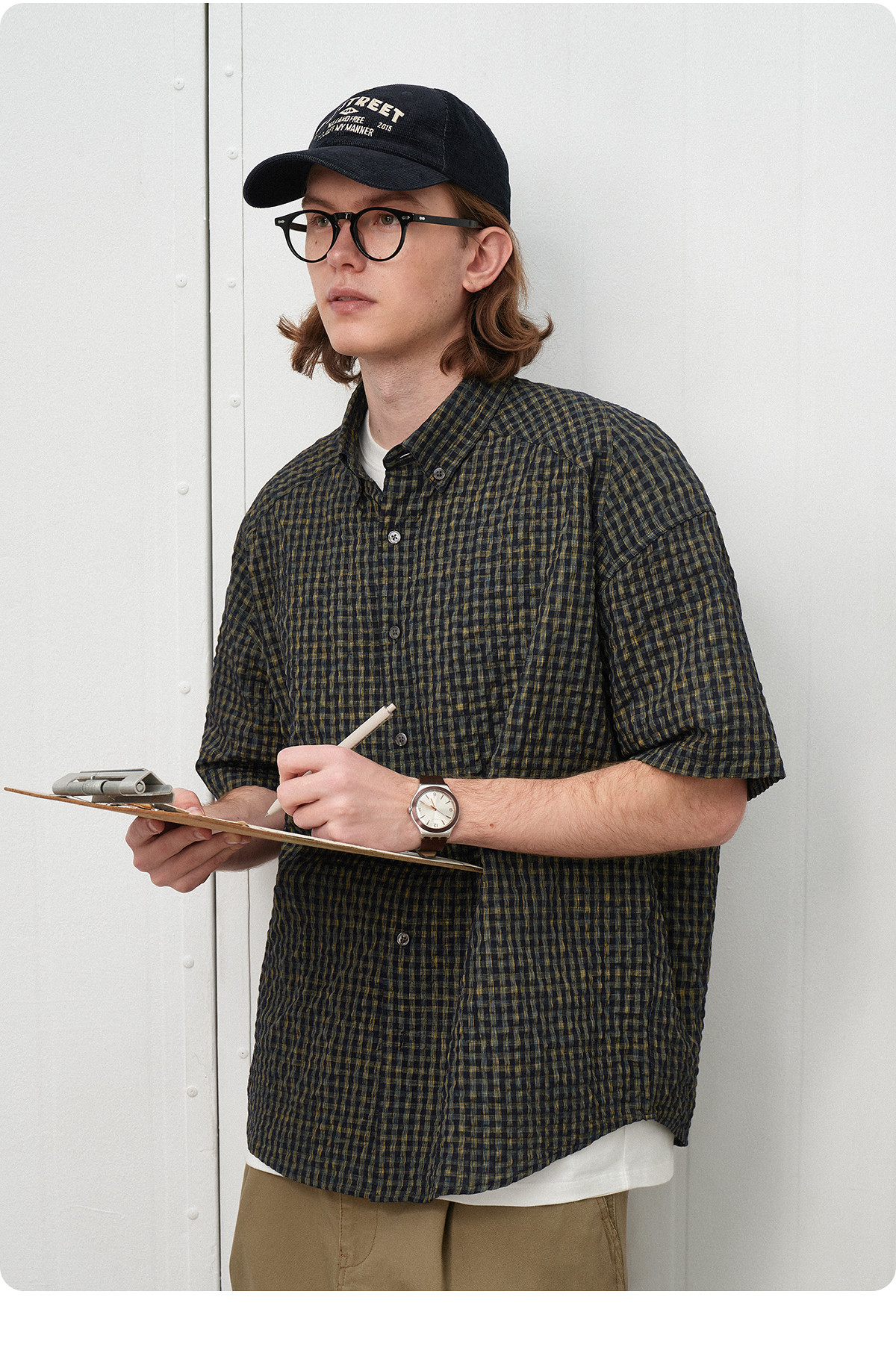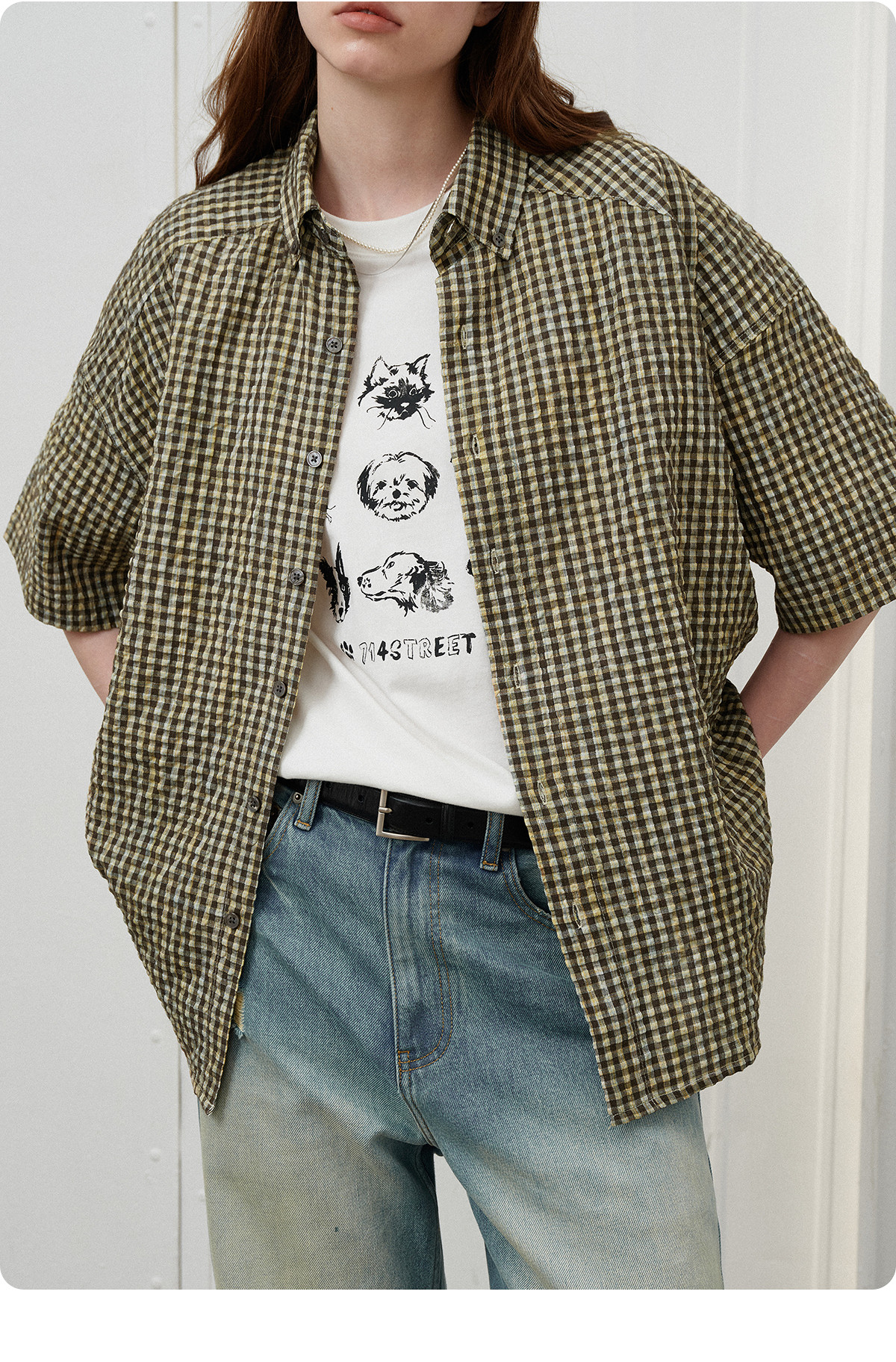 714street泡泡纱格子短袖衬衫男25春夏新款宽松轻薄透气情侣衬衣