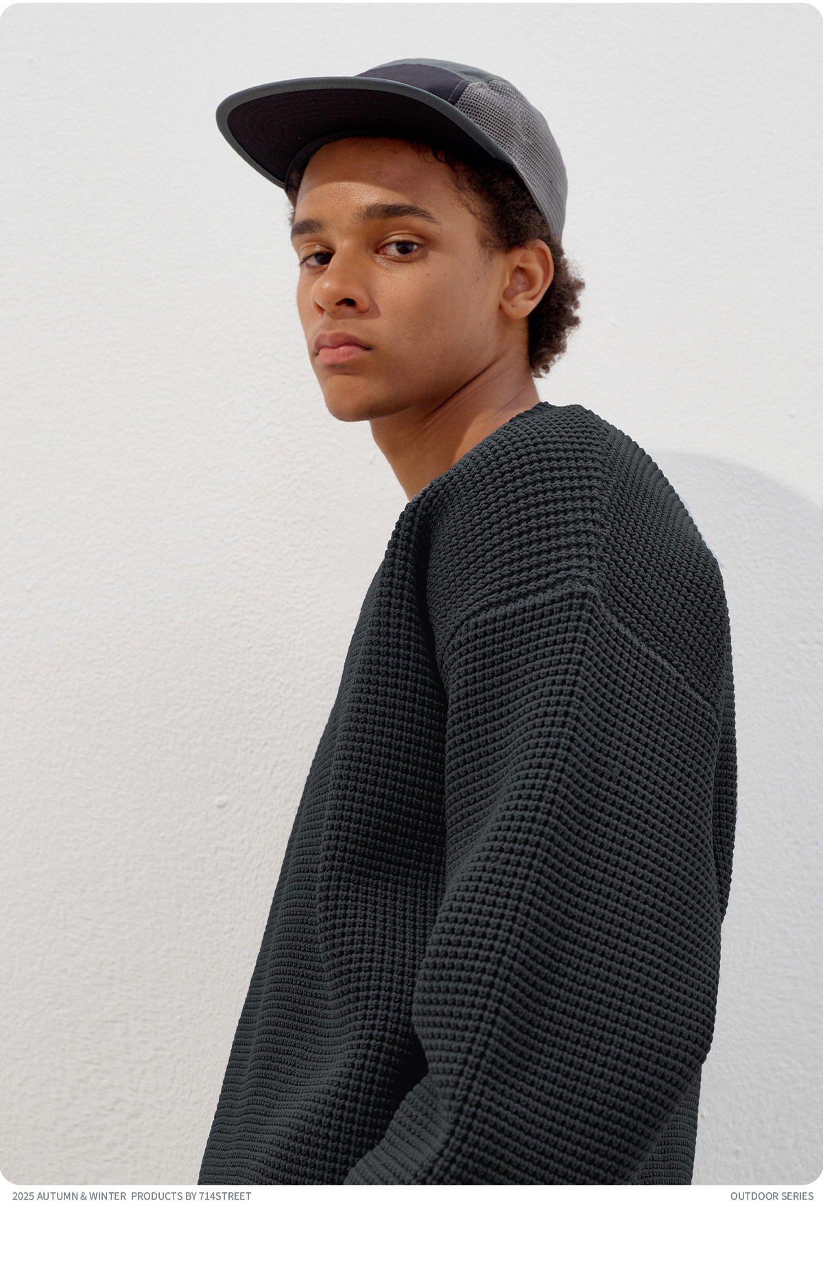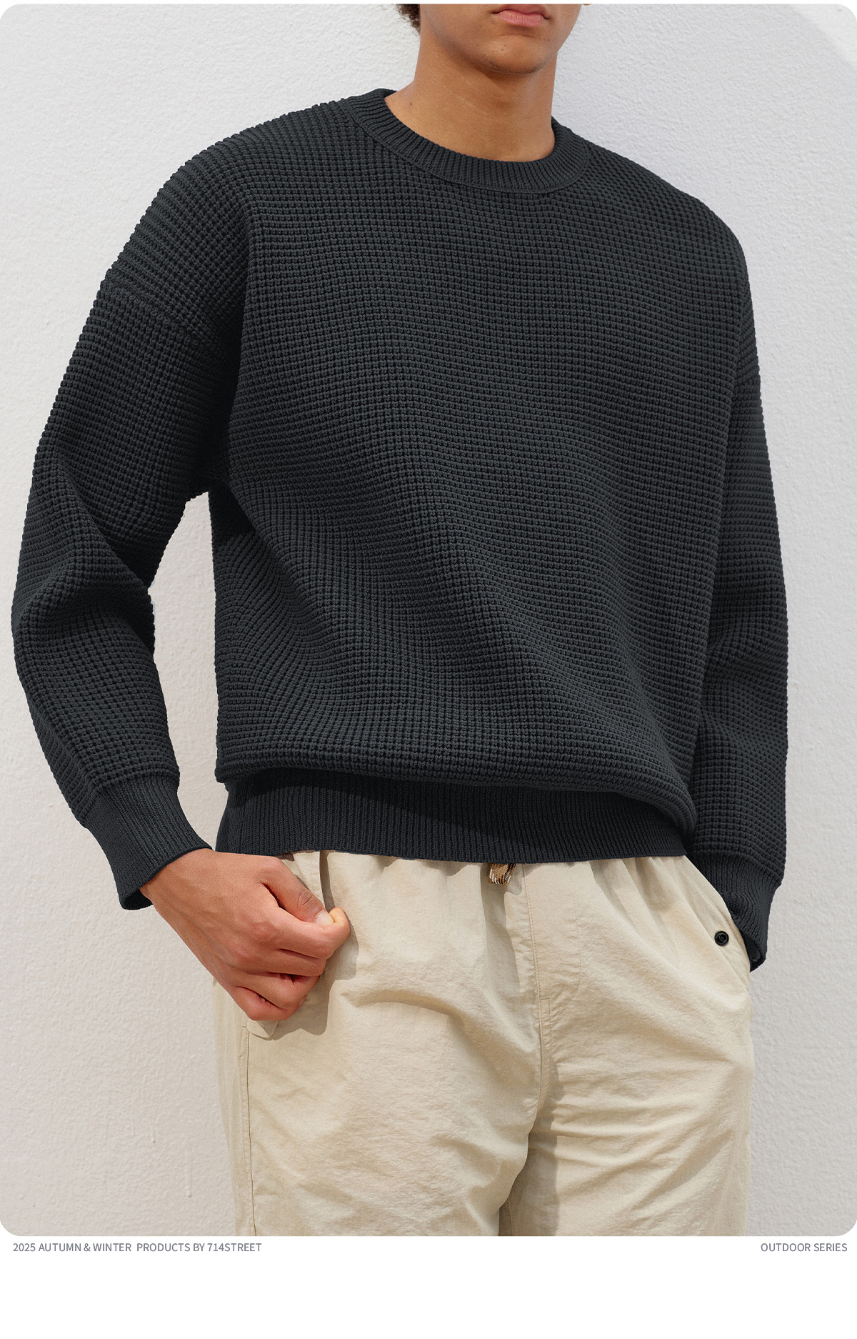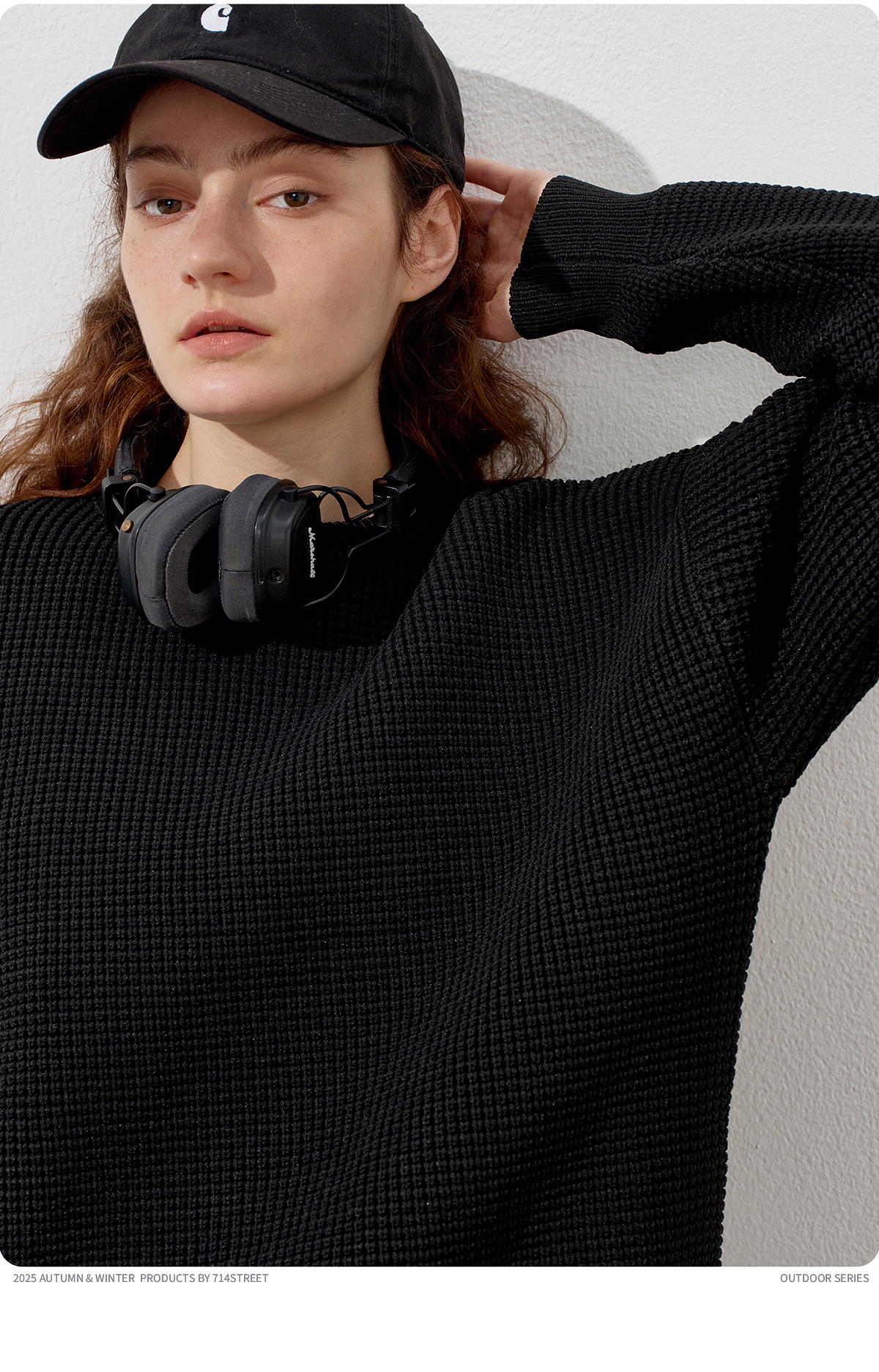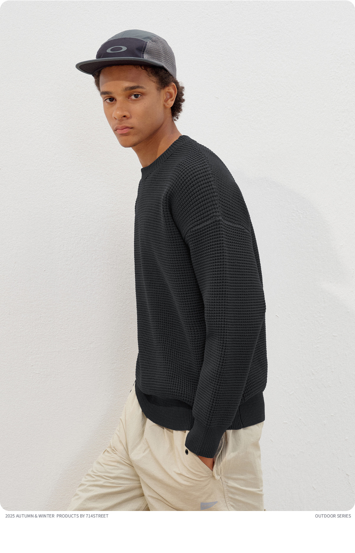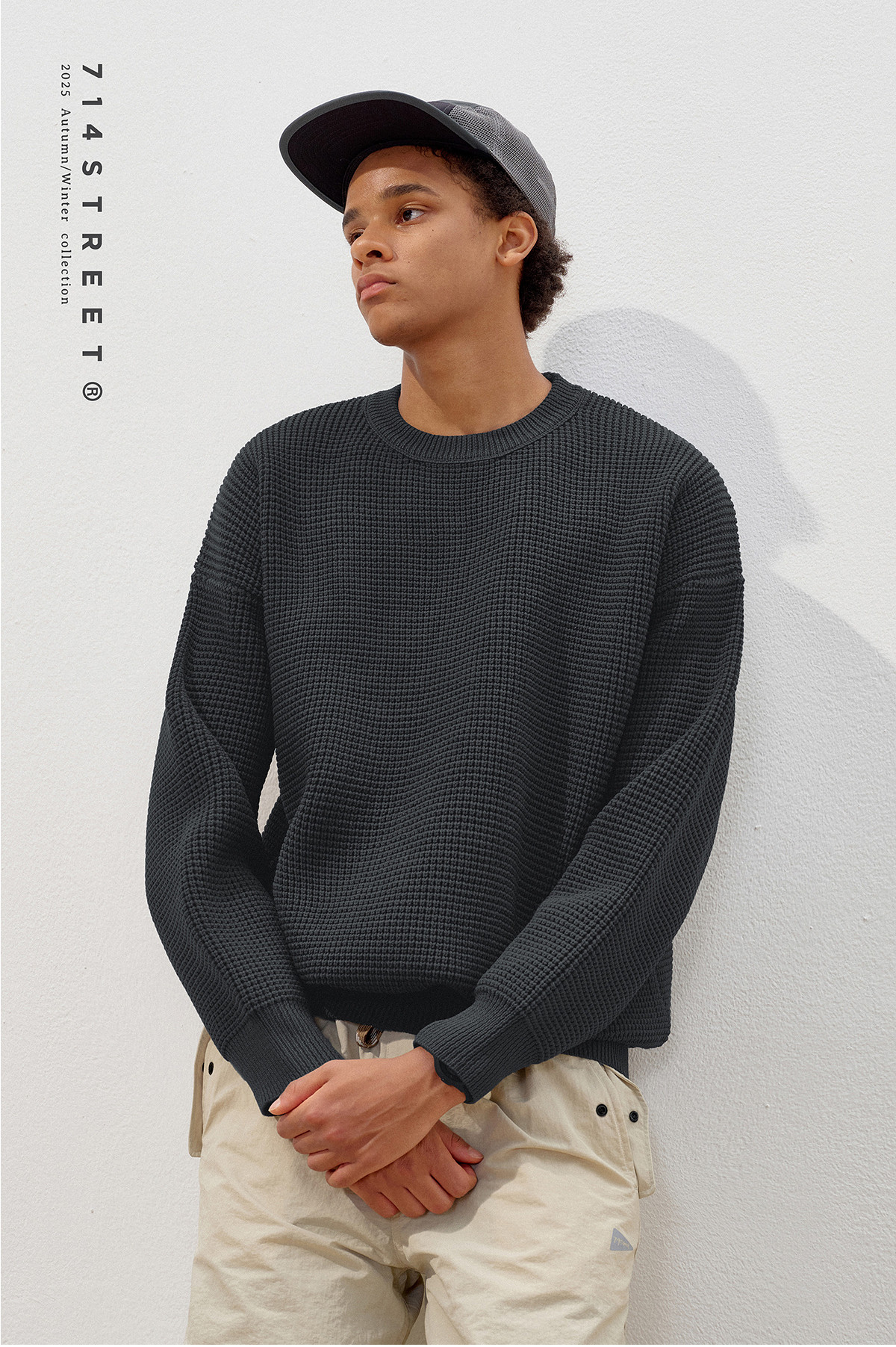 714street抗皱华夫格纹理长袖2025秋冬国潮廓形情侣毛衣针织衫男