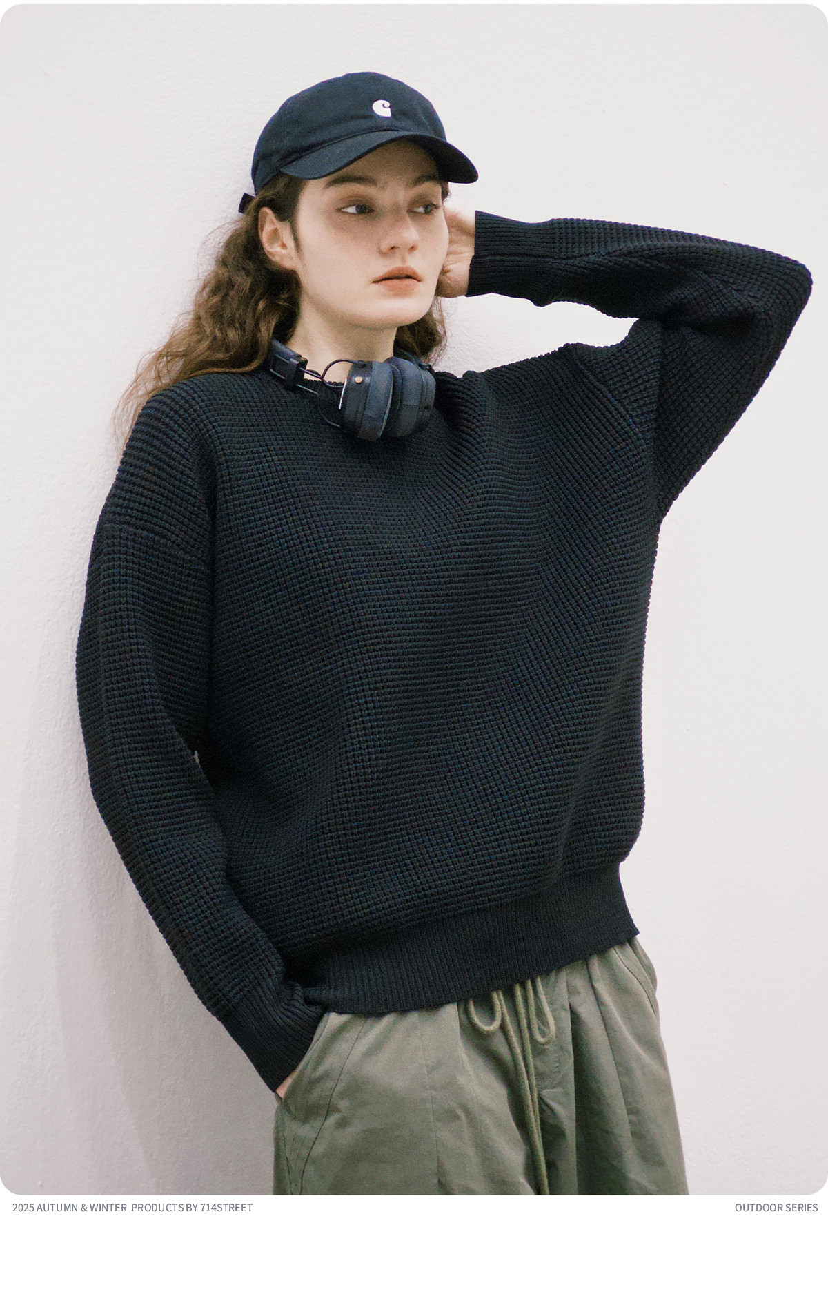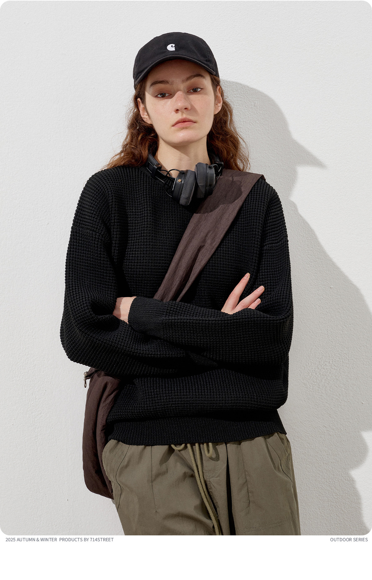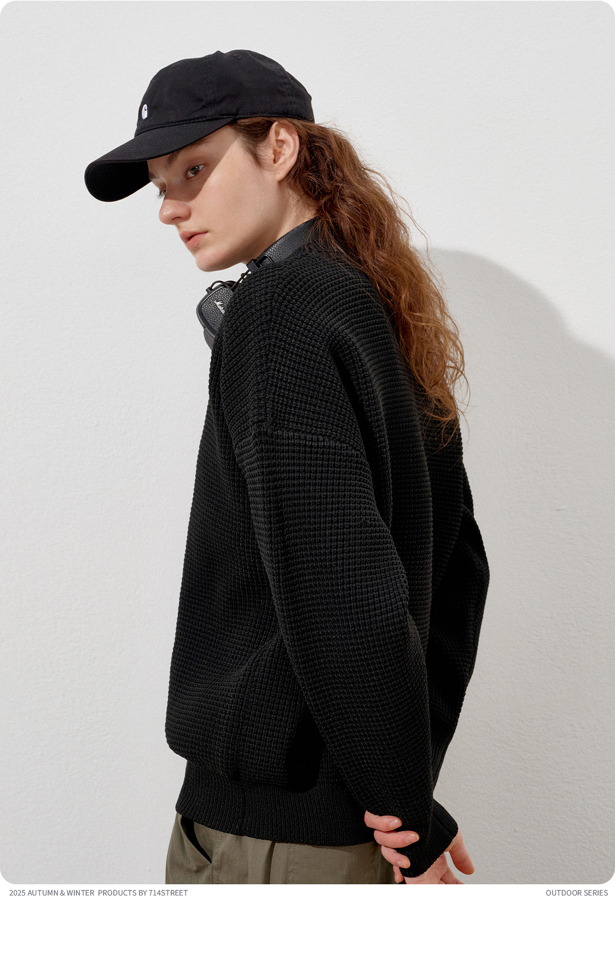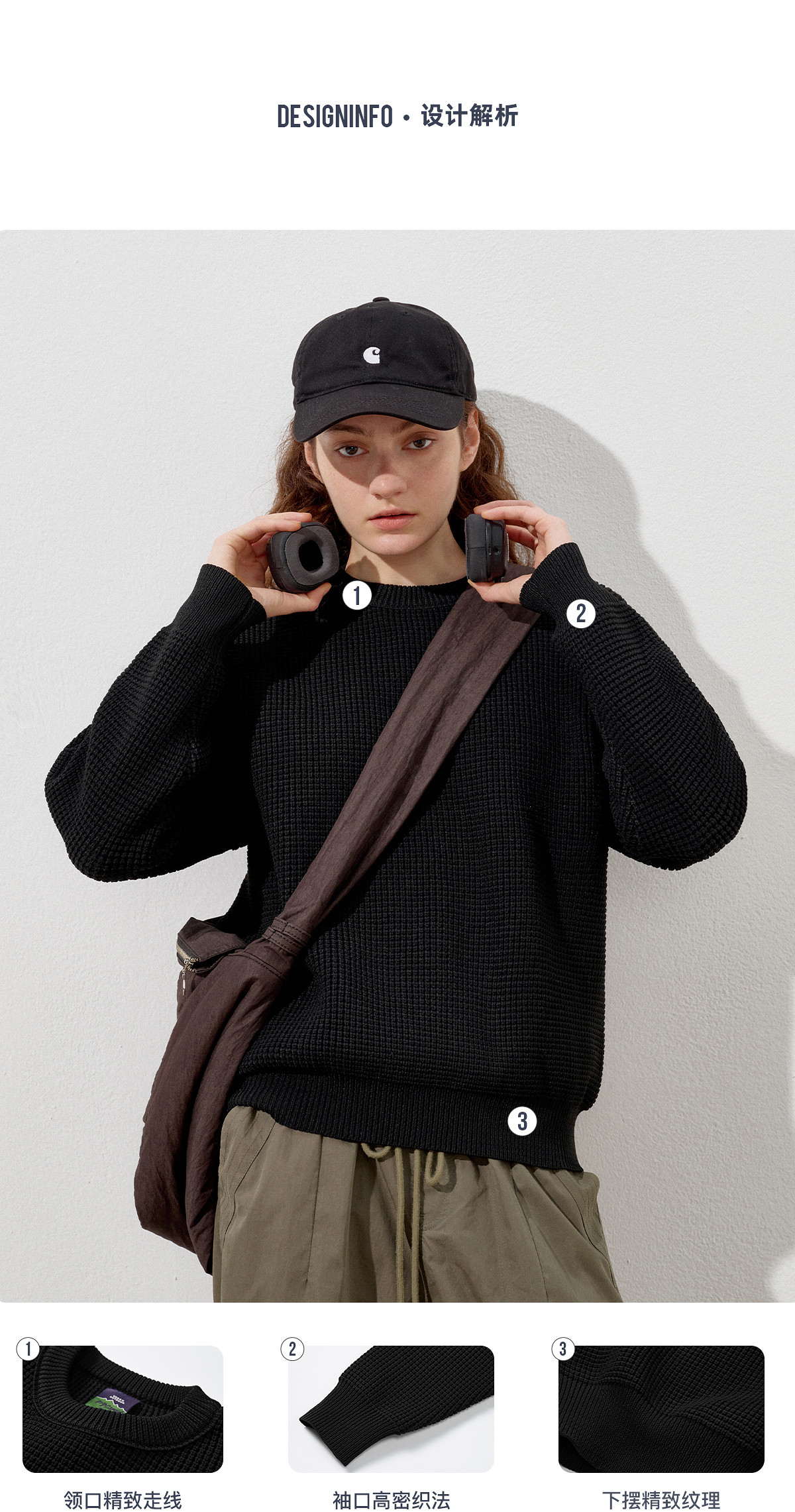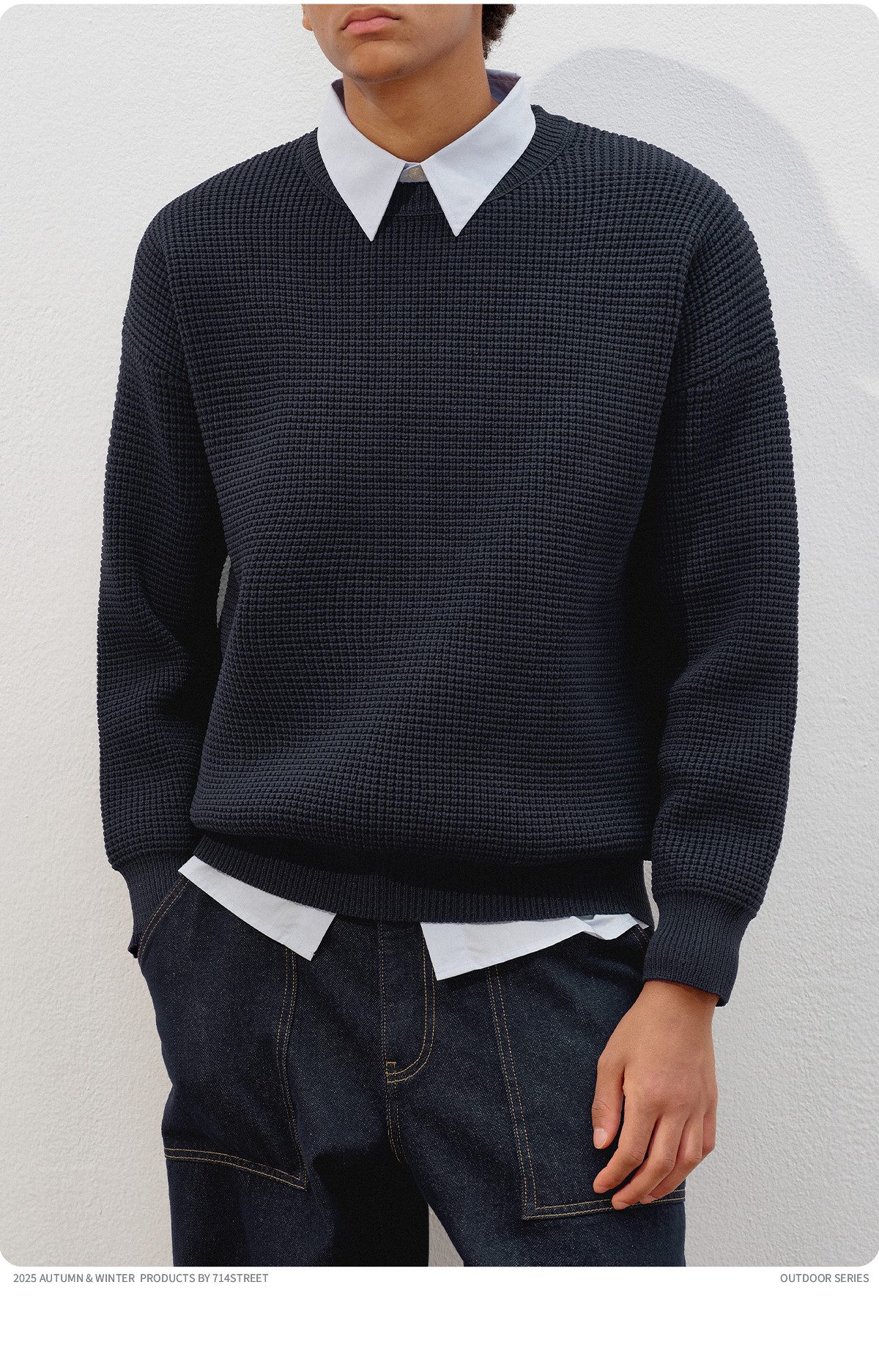 714street抗皱华夫格纹理长袖2025秋冬国潮廓形情侣毛衣针织衫男