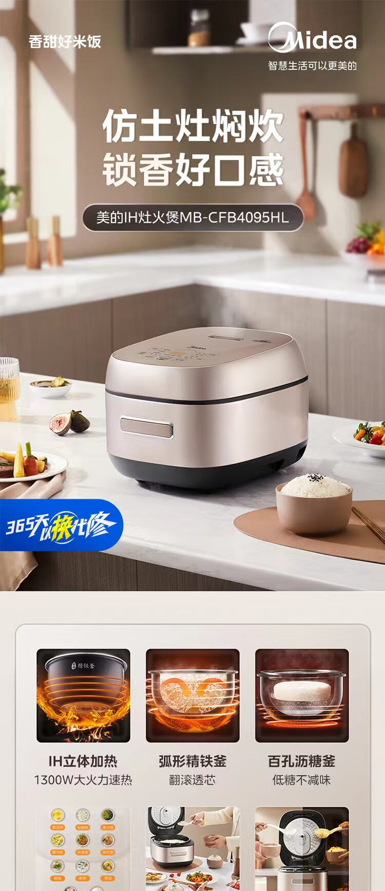 美的(Midea)多功能智能低糖电饭煲沥米汤饭IH电磁发热精铁釜大火包锅4升一级能效预约CFB4095H(线下同款)