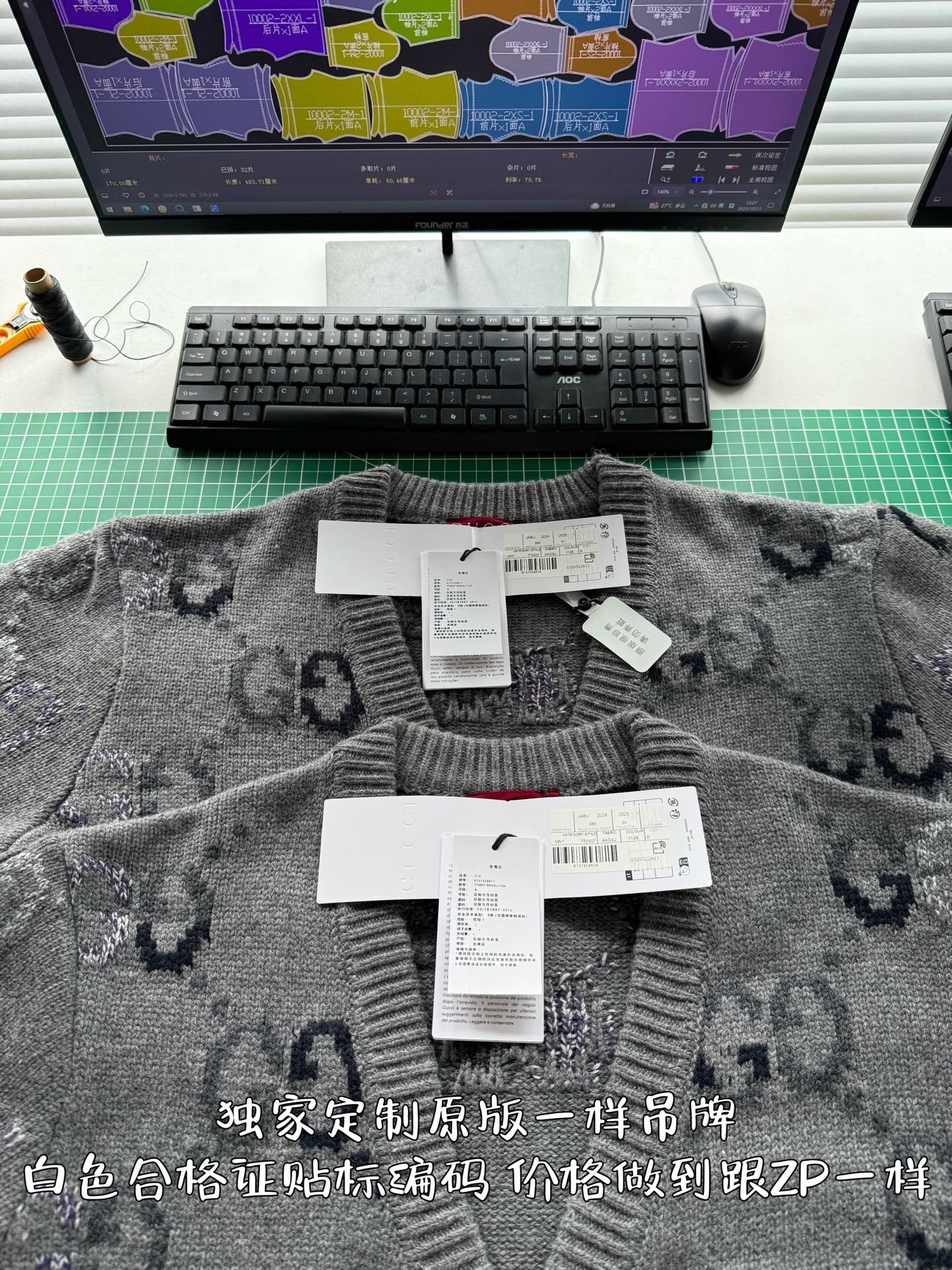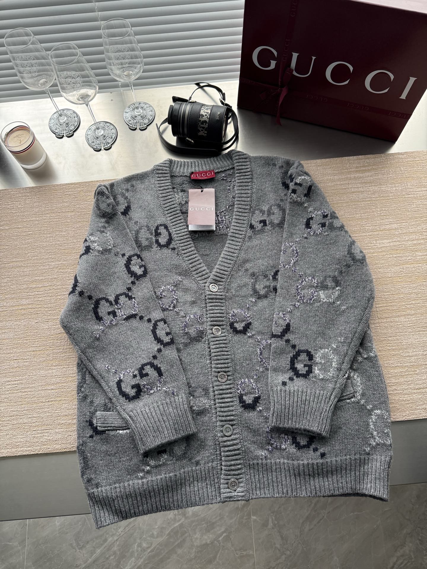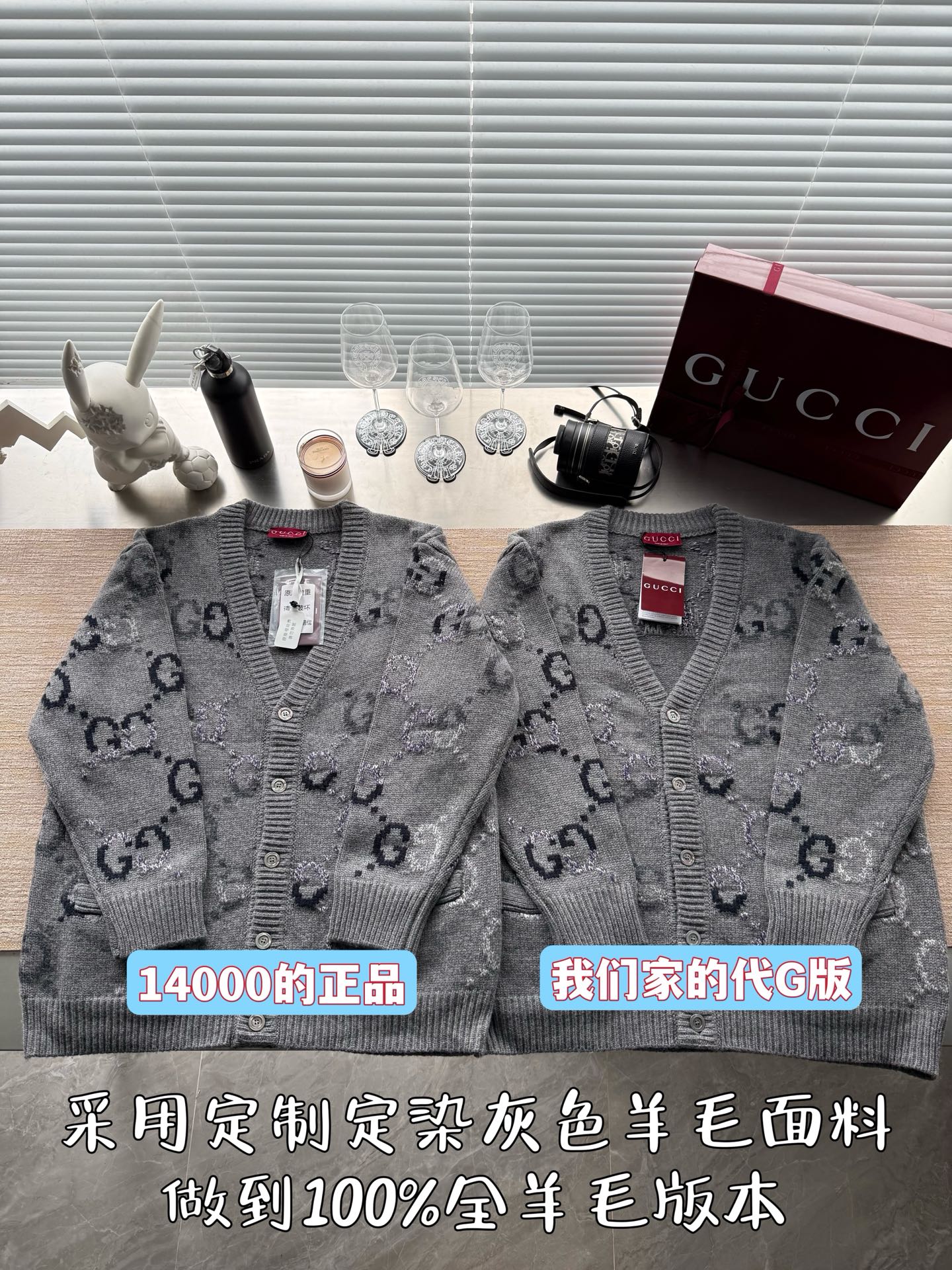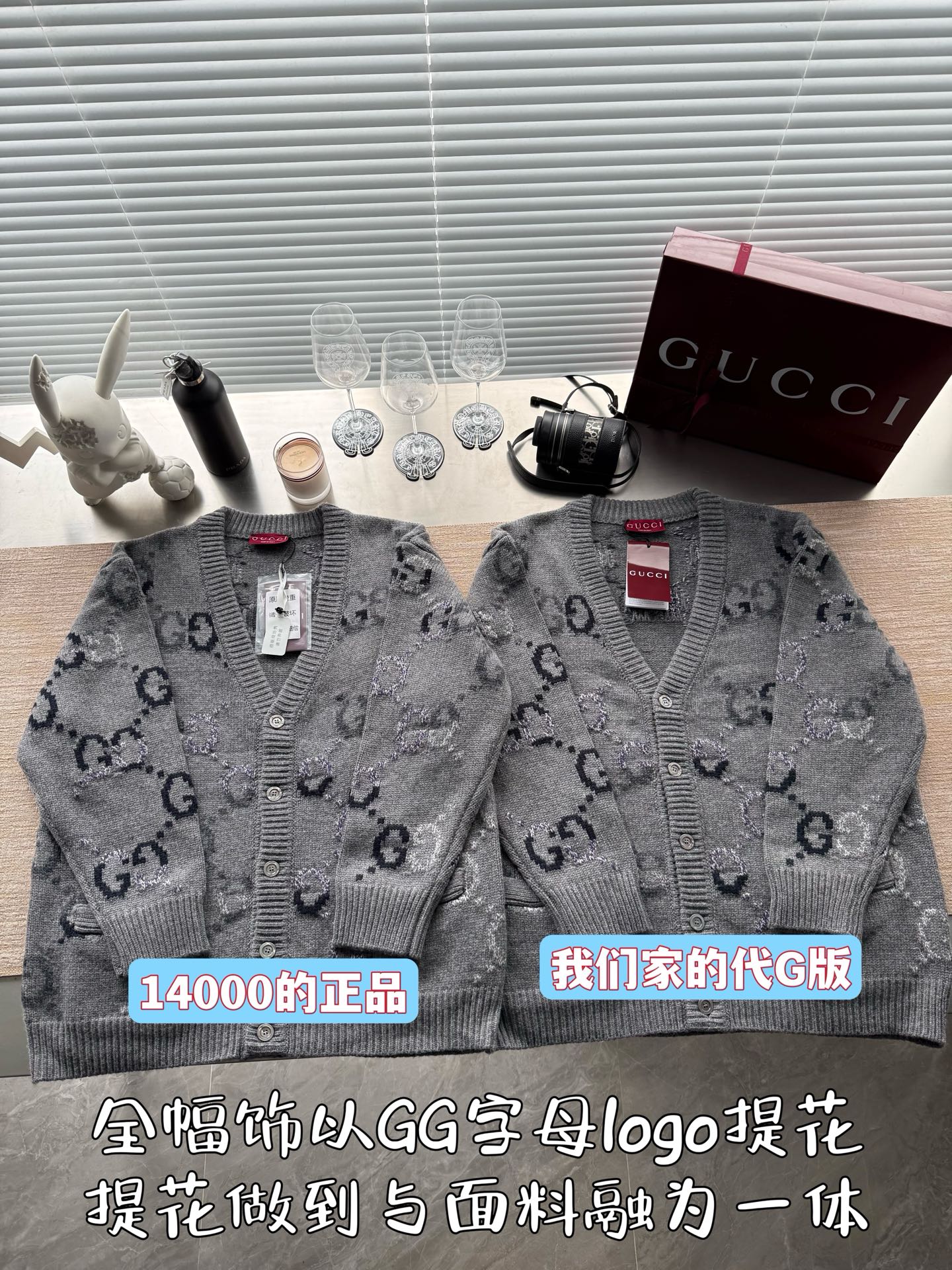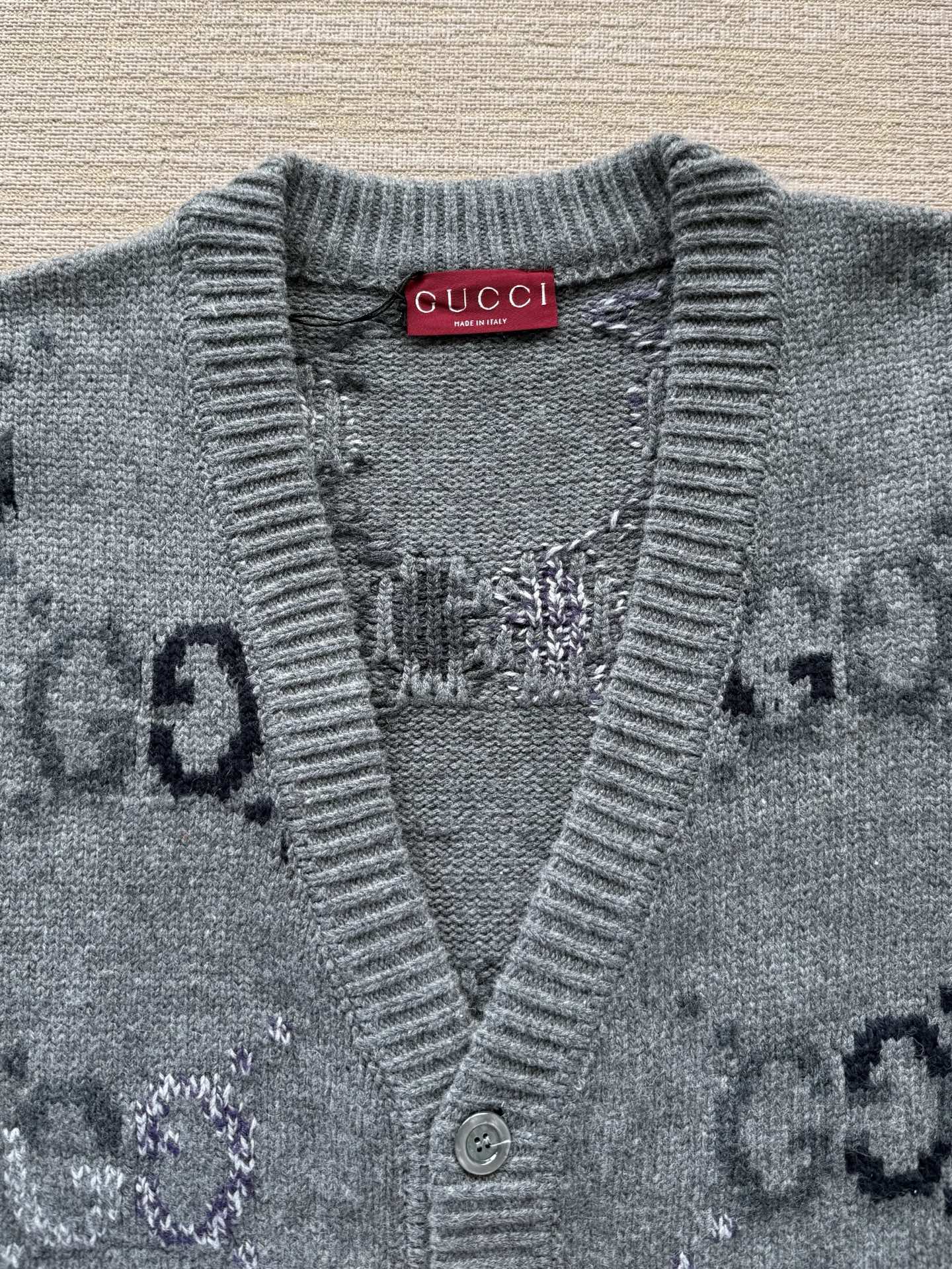 Gucci 2025 FW GG提花羊毛针织开衫‼️整件衣服14000购买Zp拆解打造,定制美利奴羊毛面料,全幅饰以GG字母提花,提花做到与面料融为一体,门襟开模定制GUCCI字母logo珍珠母贝纽扣,定织标志性罗纹V领 袖口 下摆,超紧密度局部编织,真正做到1:1copy 闭眼入 码数:S M L XL