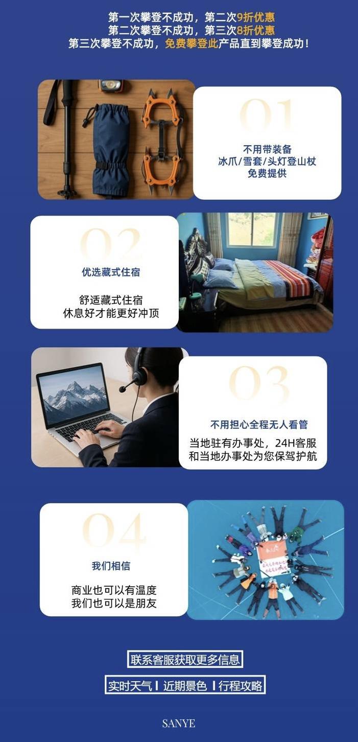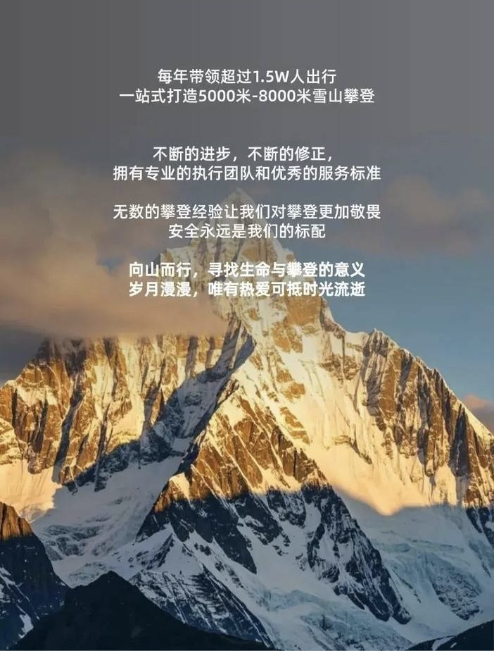 PS:高海拔登山会有各种不能顺利登顶的情况(如体能、高反、天气恶劣等),但所有成本均已支付,所以行程开始后不支持退费
