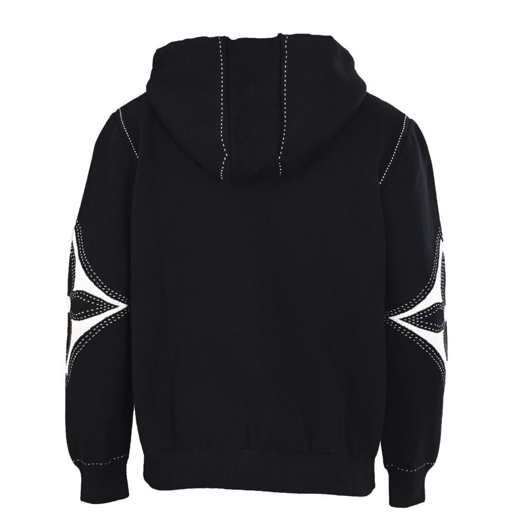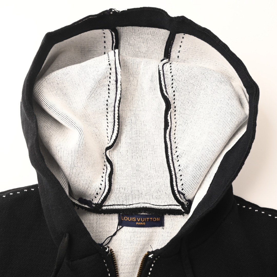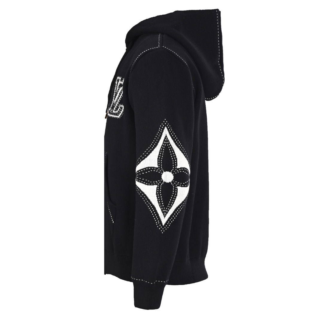 本款拉链棉质连帽衫为轻盈廓形融入繁复嵌花织纹于正面和肘部呈现大号Monogram 花卉并以虚线设计营造明线和刺绣观感