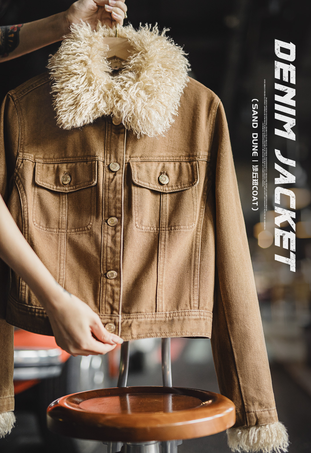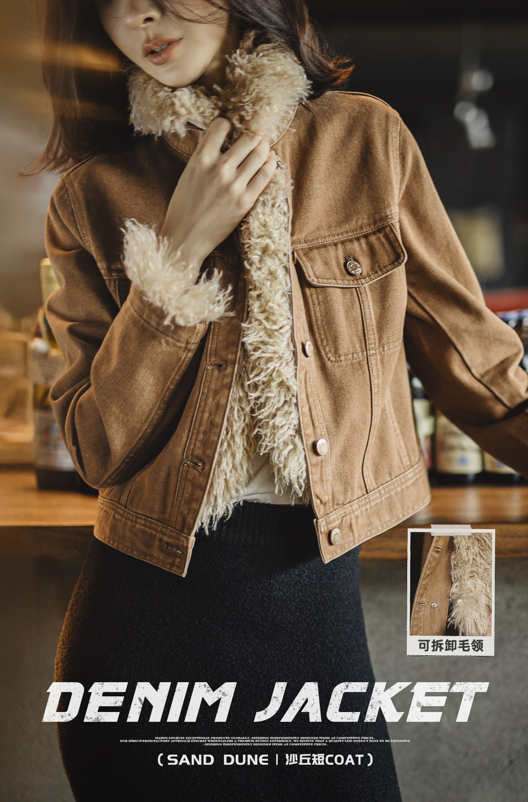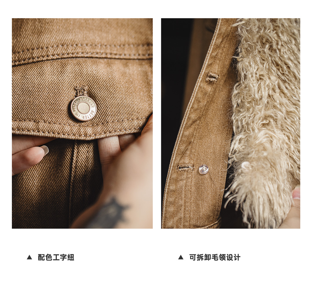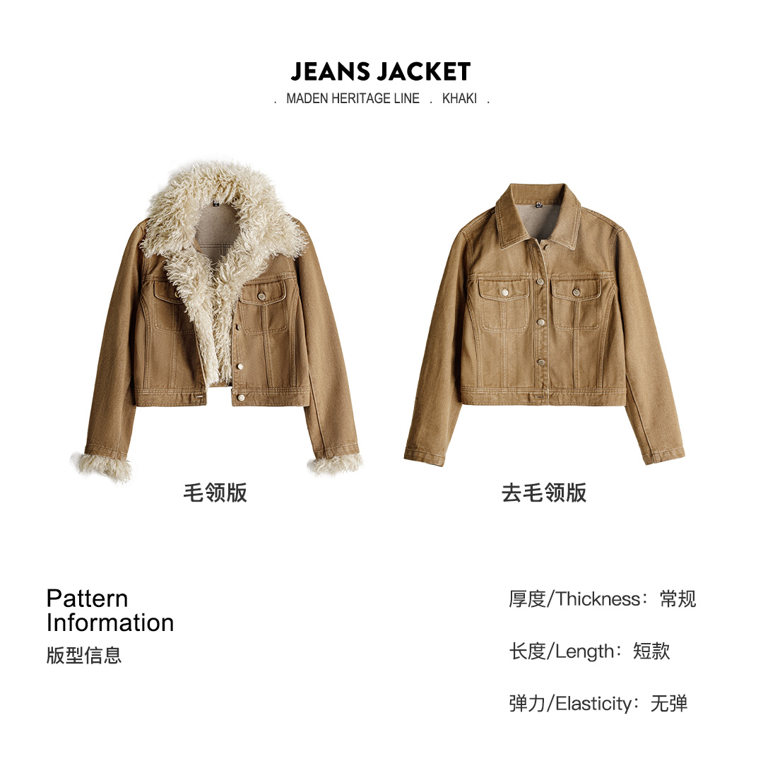 马登美式巴恩风卡其色水洗牛仔短款修身可拆卸毛领夹克外套女秋冬