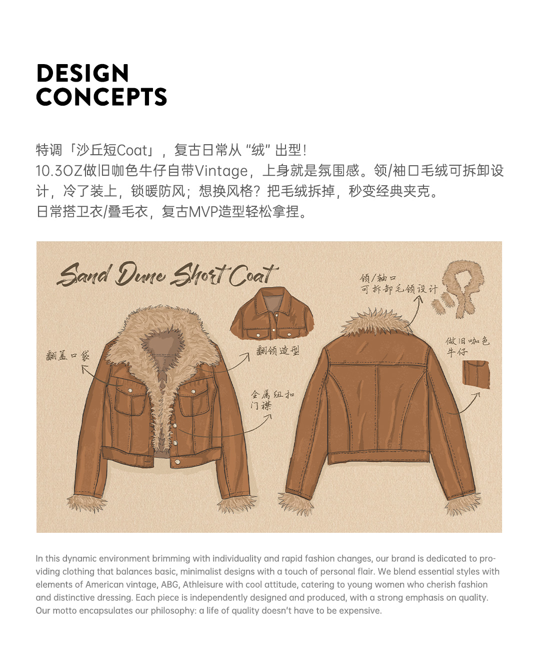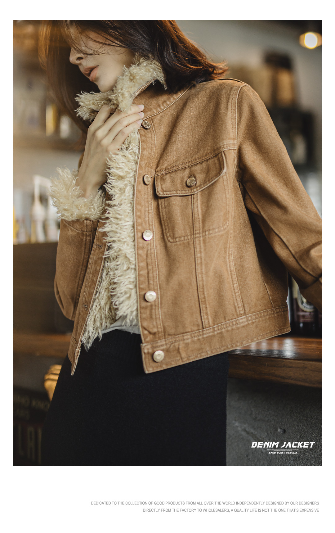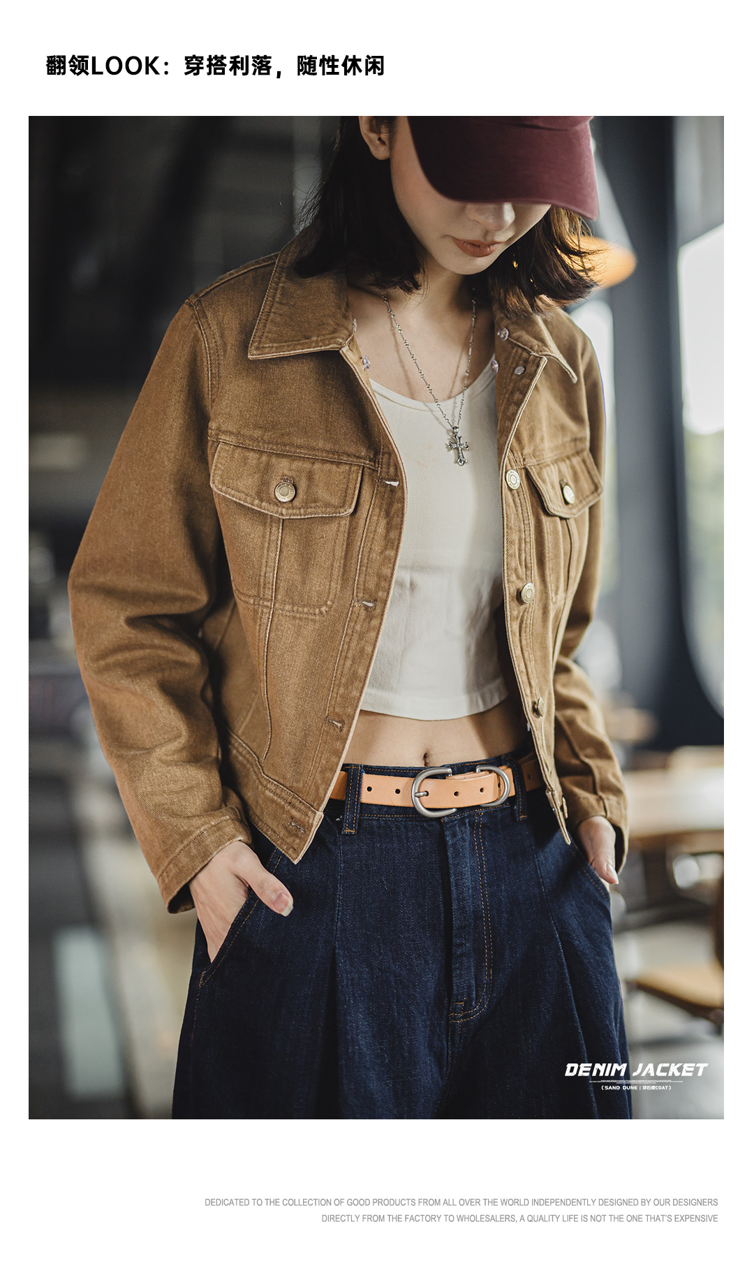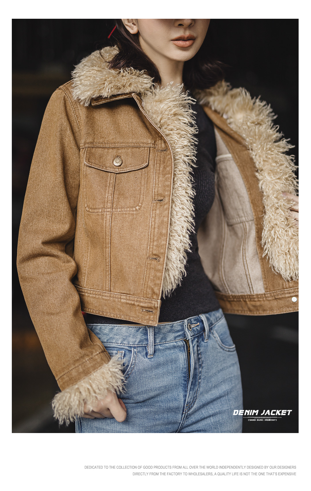 马登美式巴恩风卡其色水洗牛仔短款修身可拆卸毛领夹克外套女秋冬