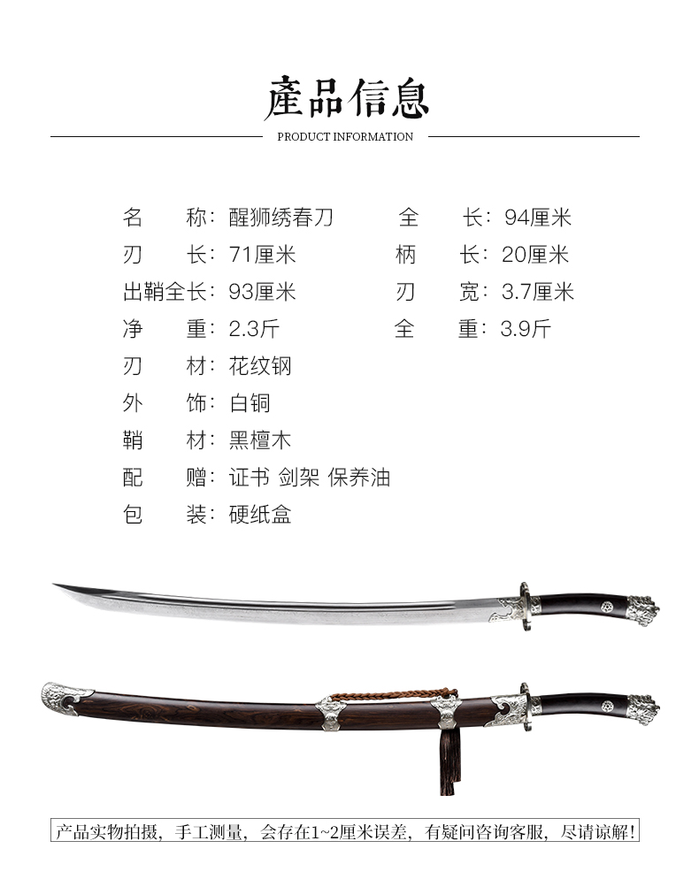 醒狮绣春刀 花纹钢 唐横刀剑 龙泉沈广隆一体刀剑传统刀剑 未开刃
