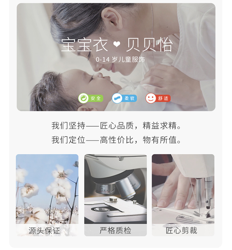 - 贝贝怡专注0-6岁婴幼儿服饰,坚持安全、柔软、舒适的产品理念,为千万中国家庭提供超高品质、安全可靠的婴幼儿服饰产品,妈妈放心,宝宝开心!