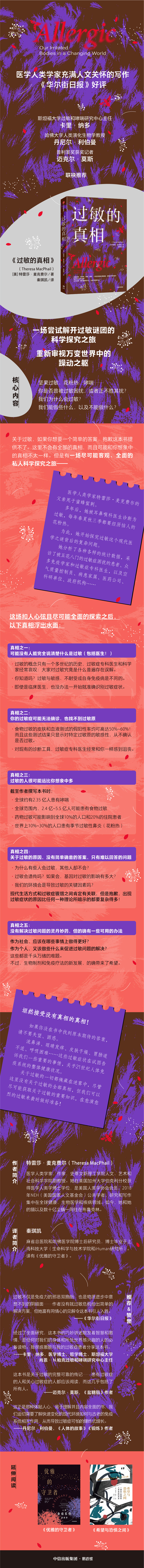 这是一本兼具科学知识和人文关怀的科普读物,讲述过敏症相关的医学研究、社会问题,既有医学科普,又有社会关怀,回应当今社会影响人们日常生活、带来普遍困扰的重要问题;这是21世纪为过敏而讲的故事,它不得不讲,每一个普通人不得不听。这里没有全部的真相,甚至离真相还有一段距离,但是它能为走在探求真相道路上的你提供所需的宝贵信息,让我们尽可能在愈演愈烈的过敏来袭时做好准备!
