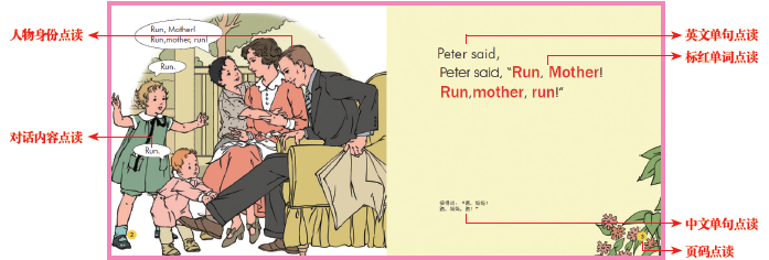 右页内容常规朗读,左页的对话分角色配音,语感更鲜明生动,像看动画片一样有趣。
