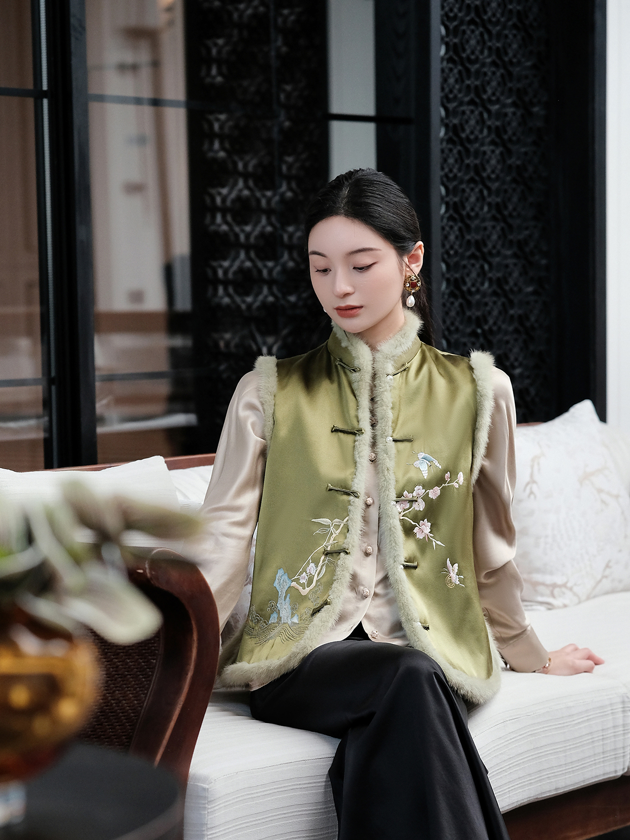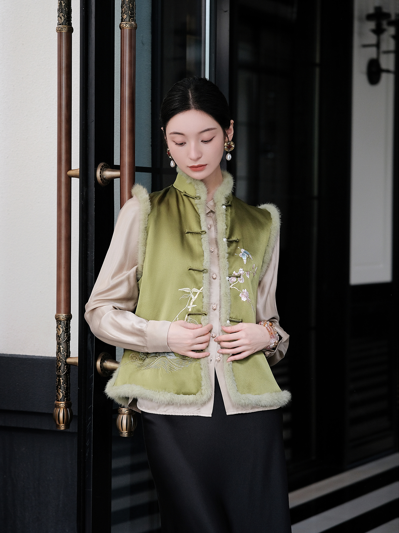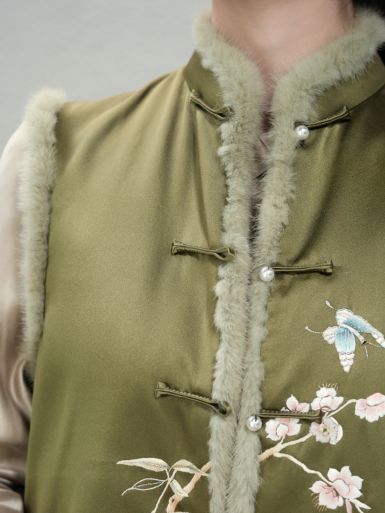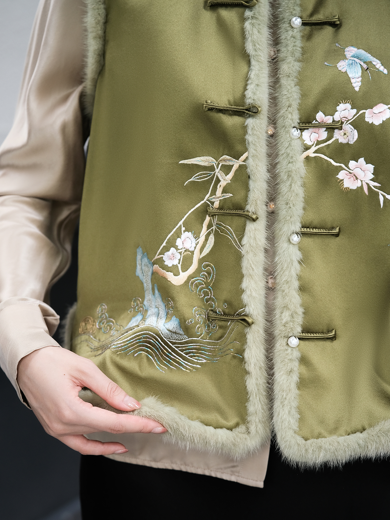 盛唐牡丹大师系列-卢梅红 | 翠影重缎真丝水貂手绣棉马甲