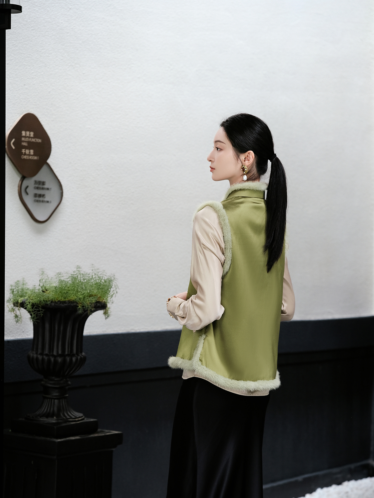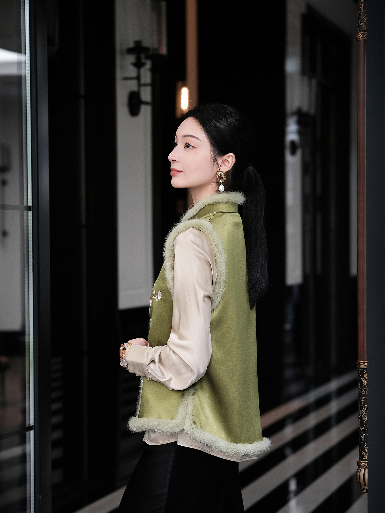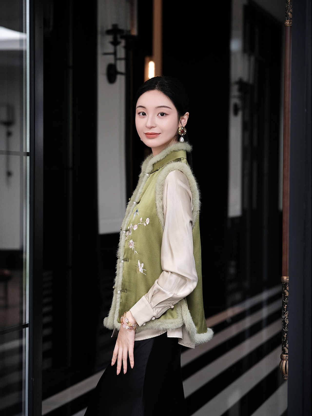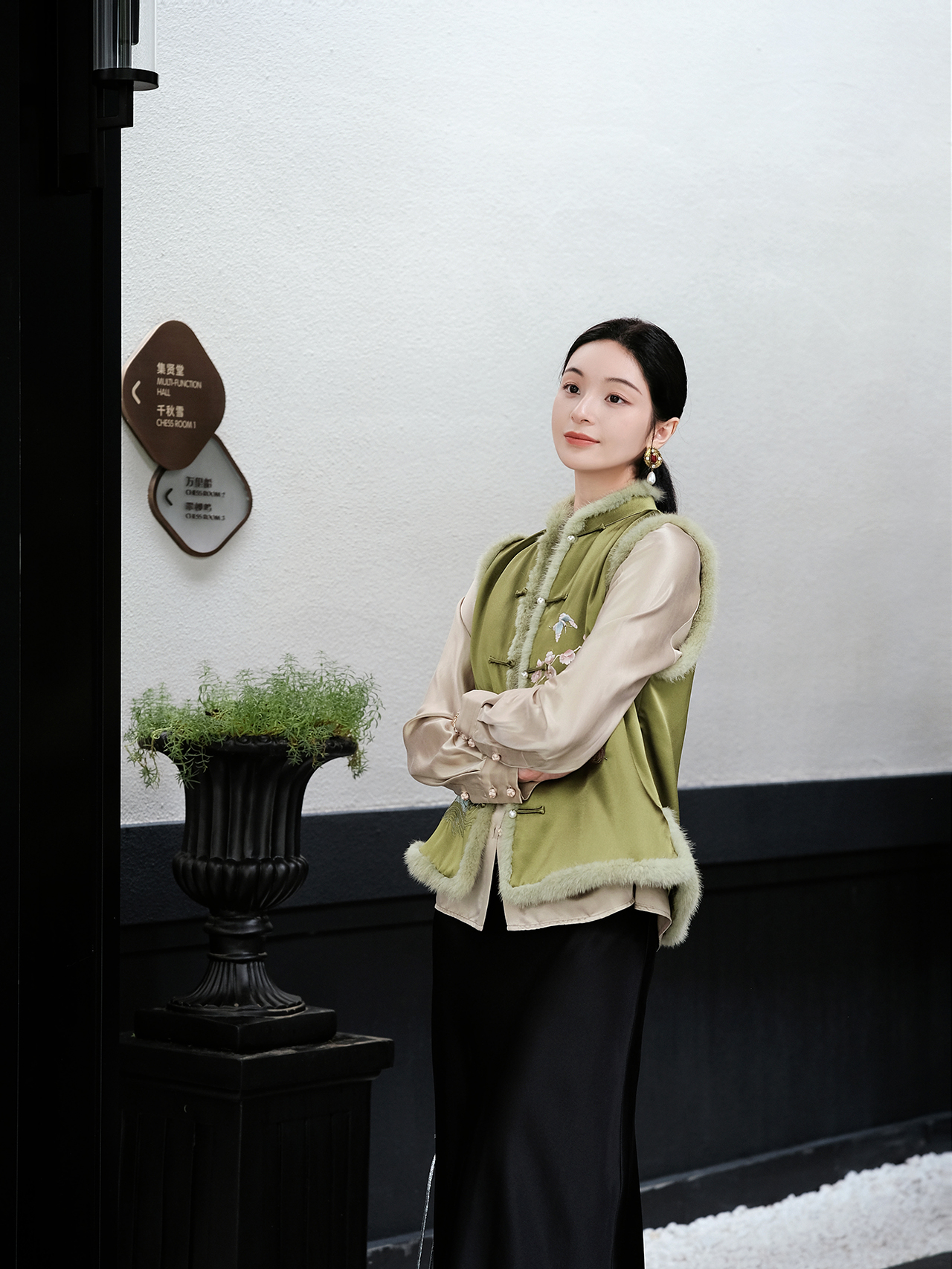 盛唐牡丹大师系列-卢梅红 | 翠影重缎真丝水貂手绣棉马甲