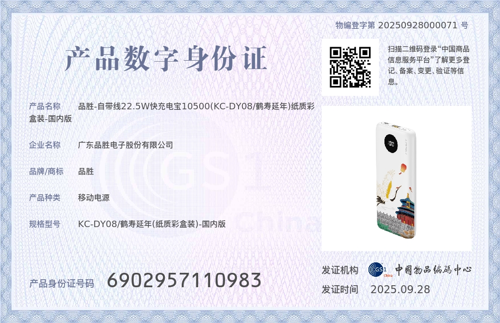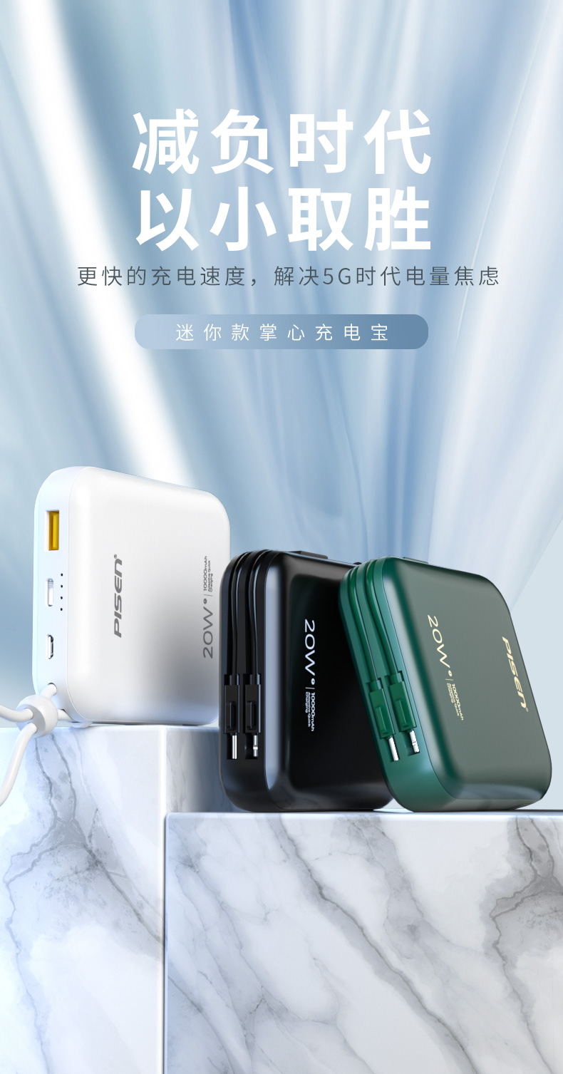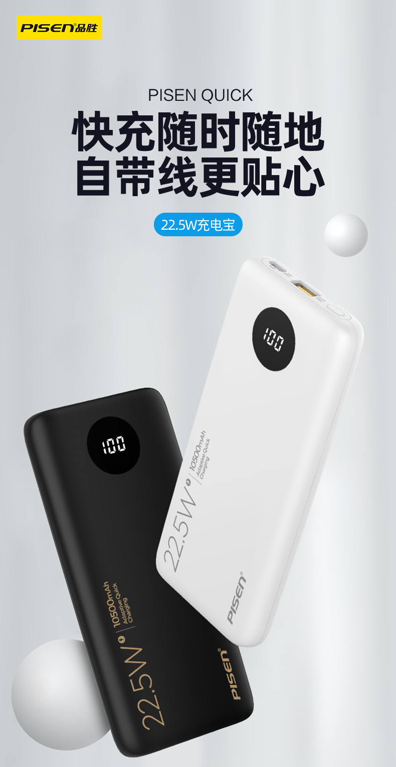 品胜 自带线充电宝 支持22.5W/PD20W快充 LED电量显示屏10000/20000毫安可选 苹果华为小米三星手机闪充
