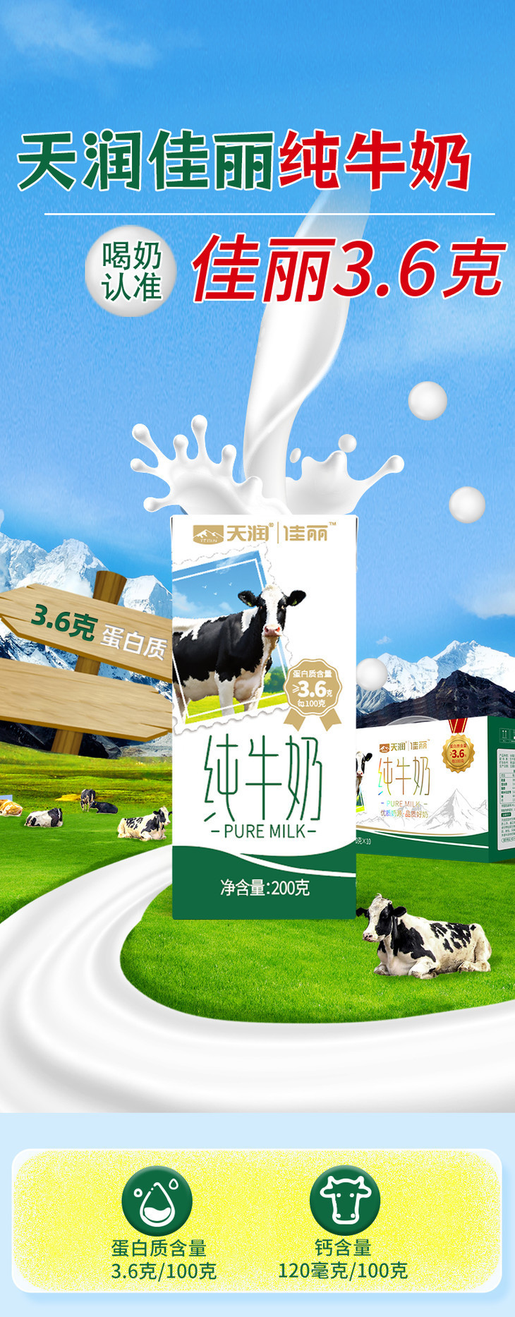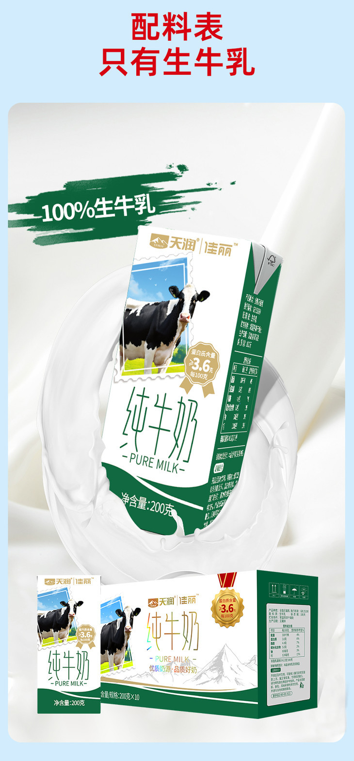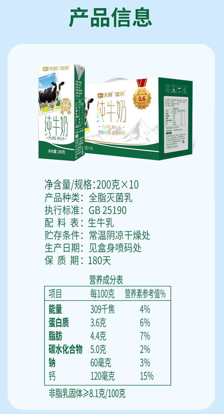 更让人放心的是,它背靠新疆兵团的国企品牌,靠谱!国内顶尖自动化流水线,全程闭环无污染,品质又稳又安全,根本不用怕宣传与实物不符的坑。配料表比脸还干净——只有100%生牛乳,更厉害的是还入围了国家优质乳项目,每100ml里藏着3.6g优质乳蛋白、120mg原生高钙,给老人孩子补营养,选它准没错!