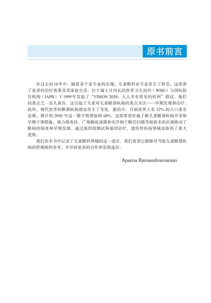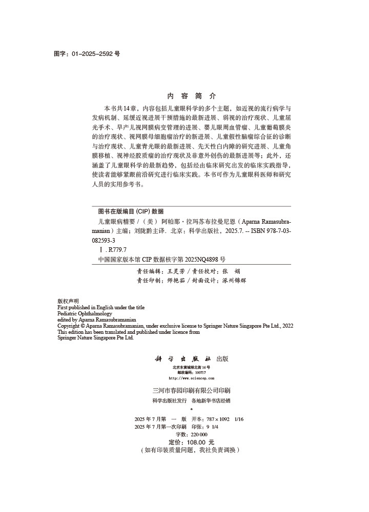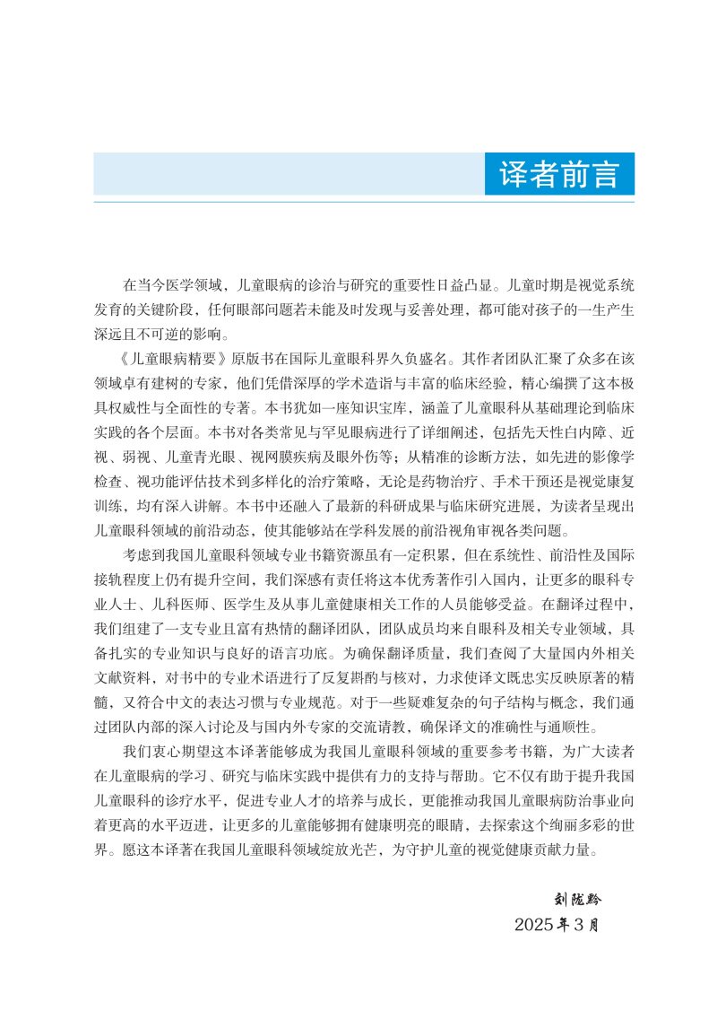 本书共14章,内容包括儿童眼科学的多个主题,如近视的流行病学与发病机制、延缓近视进展干预措施的近期新进展、弱视的治疗现状、儿童屈光手术、早产儿视网膜病变管理的进展、婴儿眼周血管瘤、儿童葡萄膜炎的治疗现状、视网膜母细胞瘤治疗的新进展、儿童假性脑瘤综合征的诊断与治疗现状、儿童青光眼的近期新进展、先天性白内障的研究进展、儿童角膜移植、视神经胶质瘤的治疗现状及非意外创伤的近期新进展等;此外,还涵盖了儿童眼科学的近期新趋势,包括经由临床研究出发的临床实践指导,使读者能够紧跟前沿研究进行临床实践。本书可作为儿童眼科医师和研究人员的实用参考书。