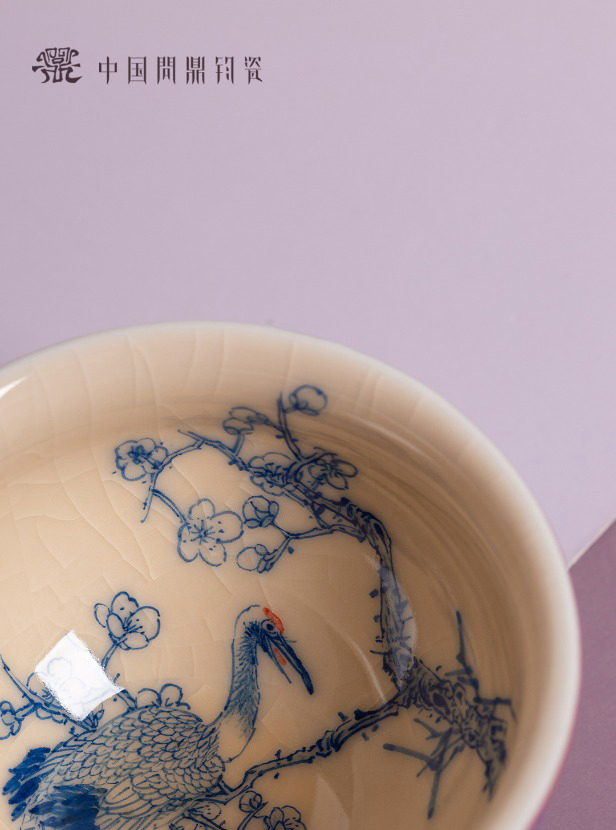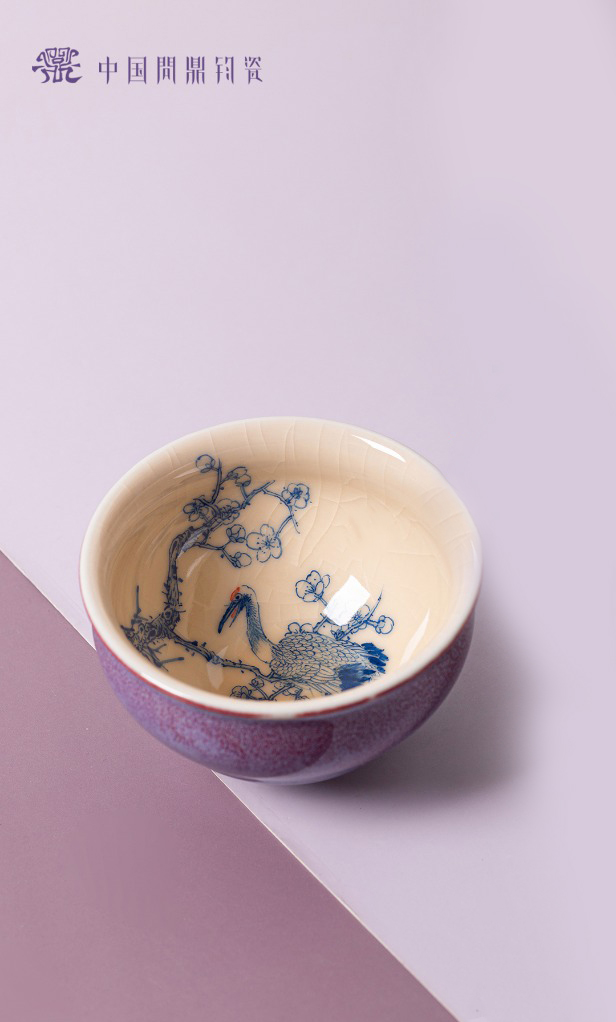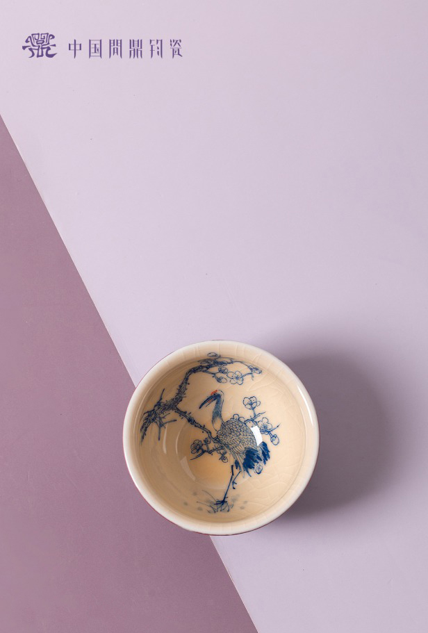 问鼎钧瓷鹅黄青花闲意杯(梅花舞鹤)