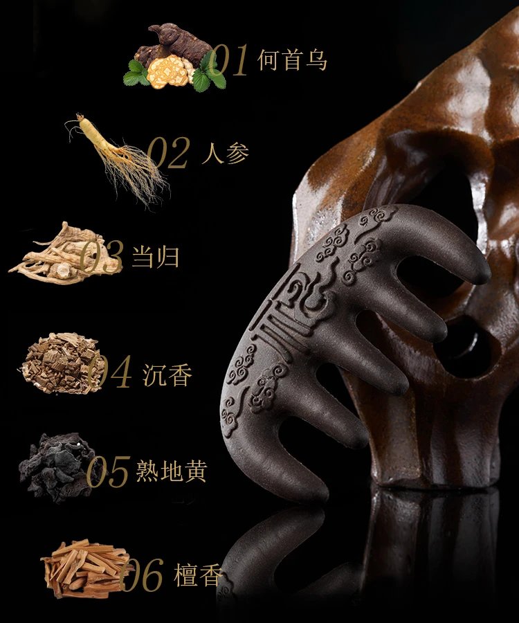 ※ 何首乌、当归、人参….等中草药做成养发梳,直接渗透;