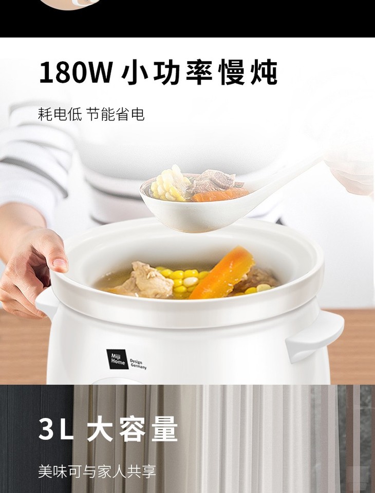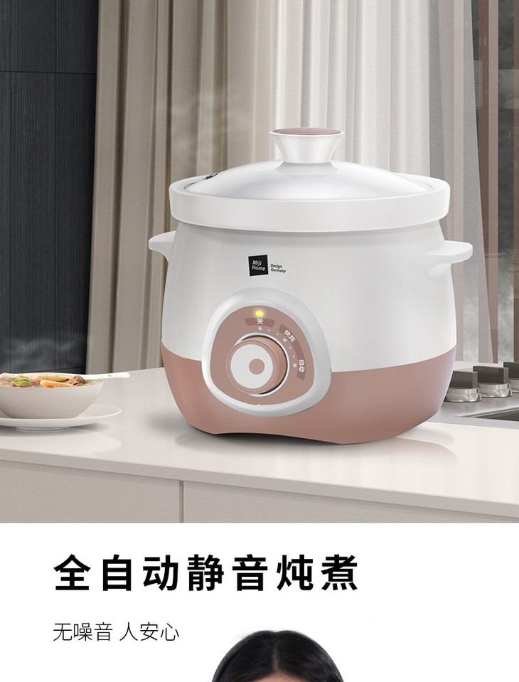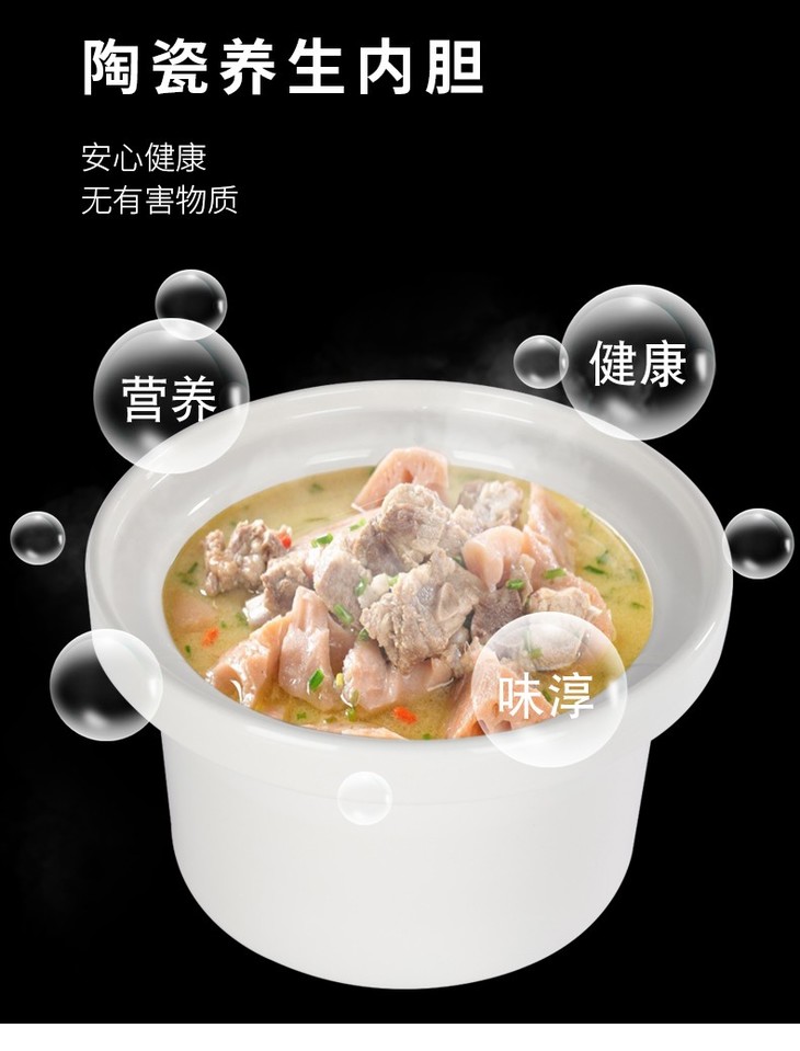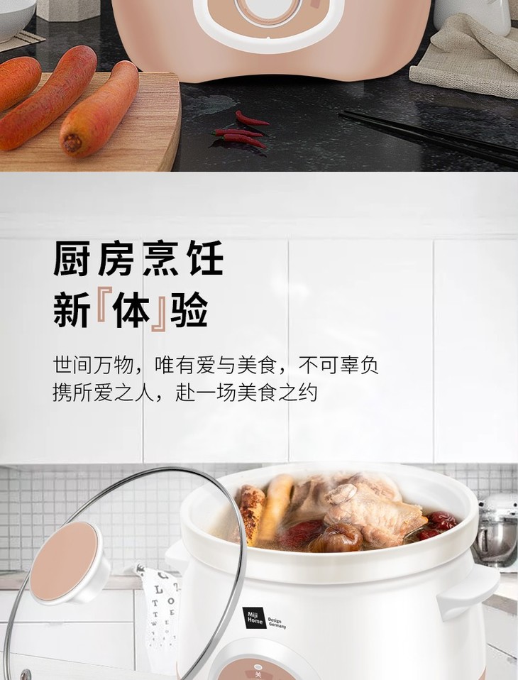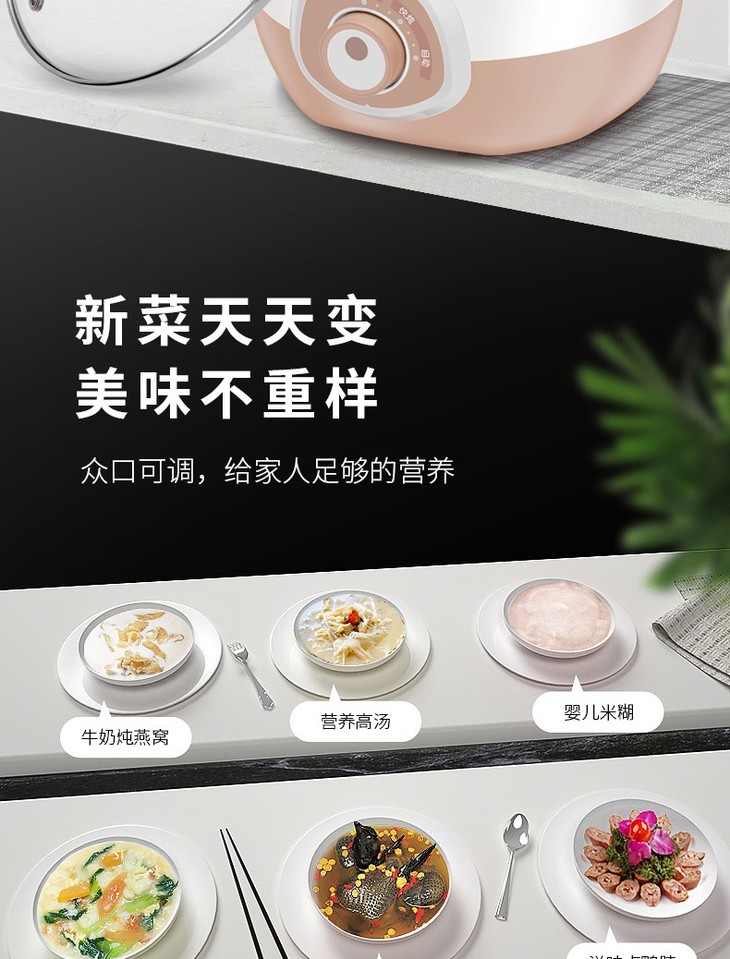 八项功能,慢炖设计,宝宝粥、养生炖、营养靓汤、清爽甜品,随心选择,美味自然呈现。