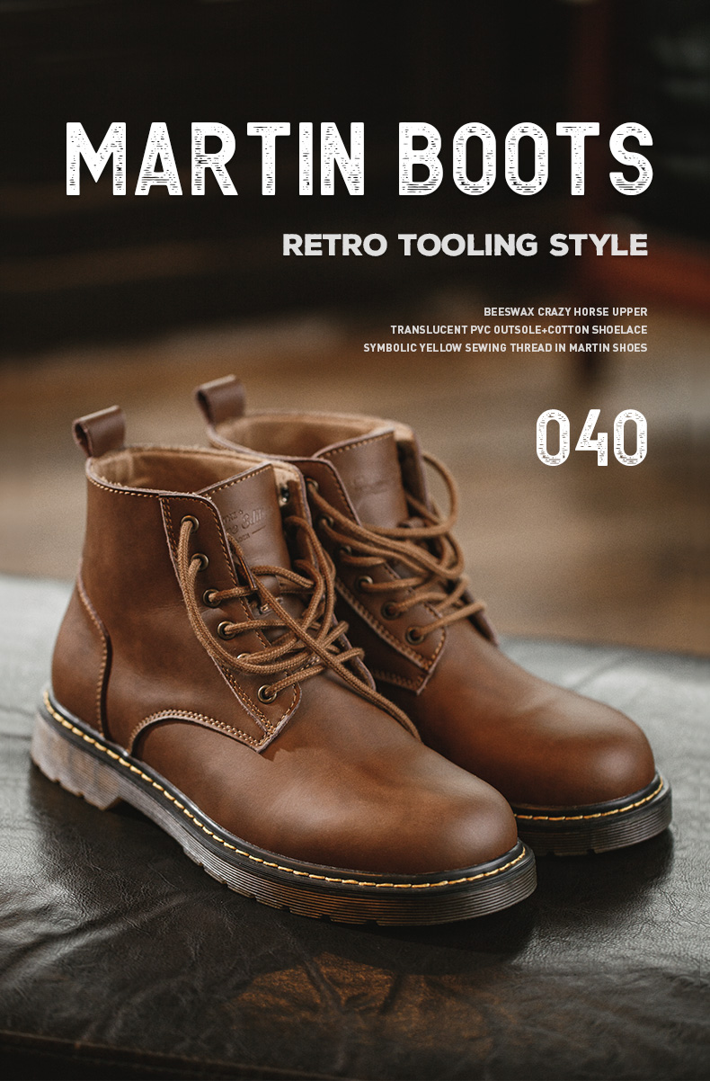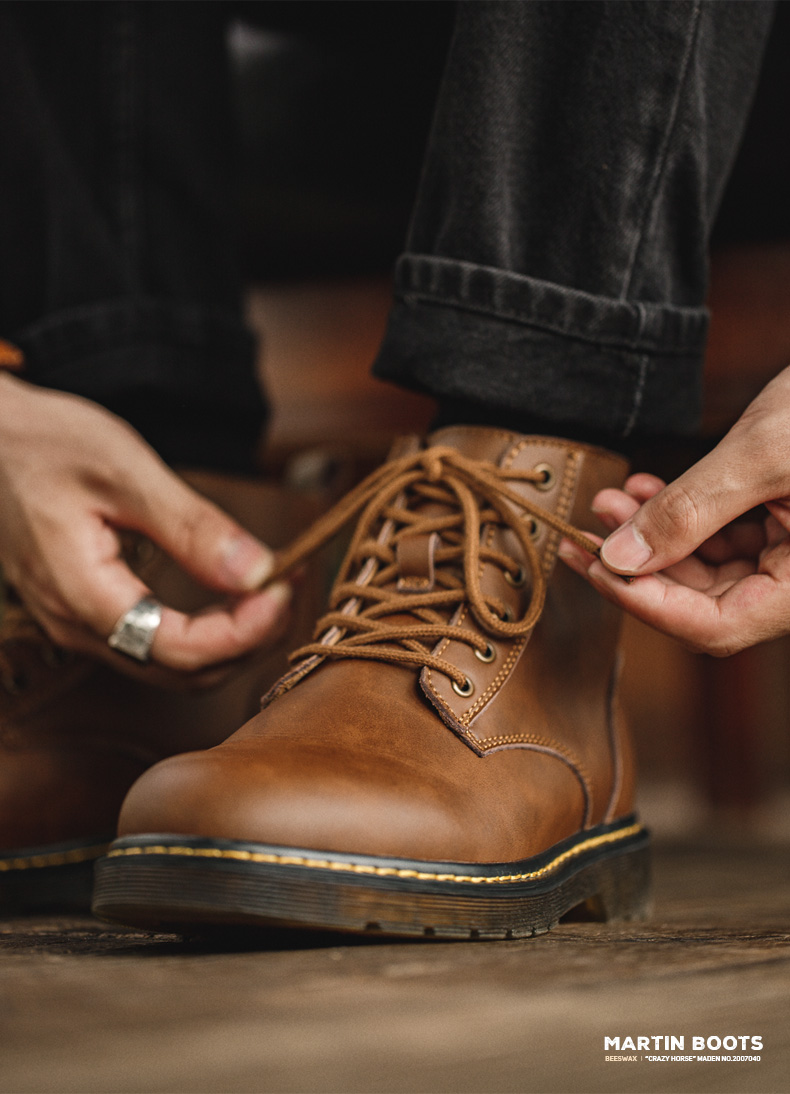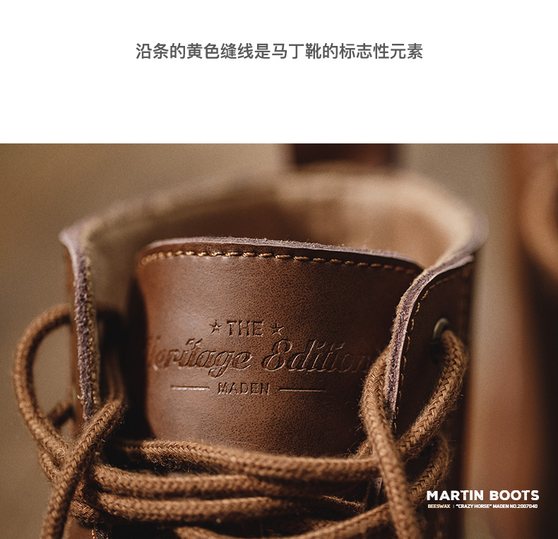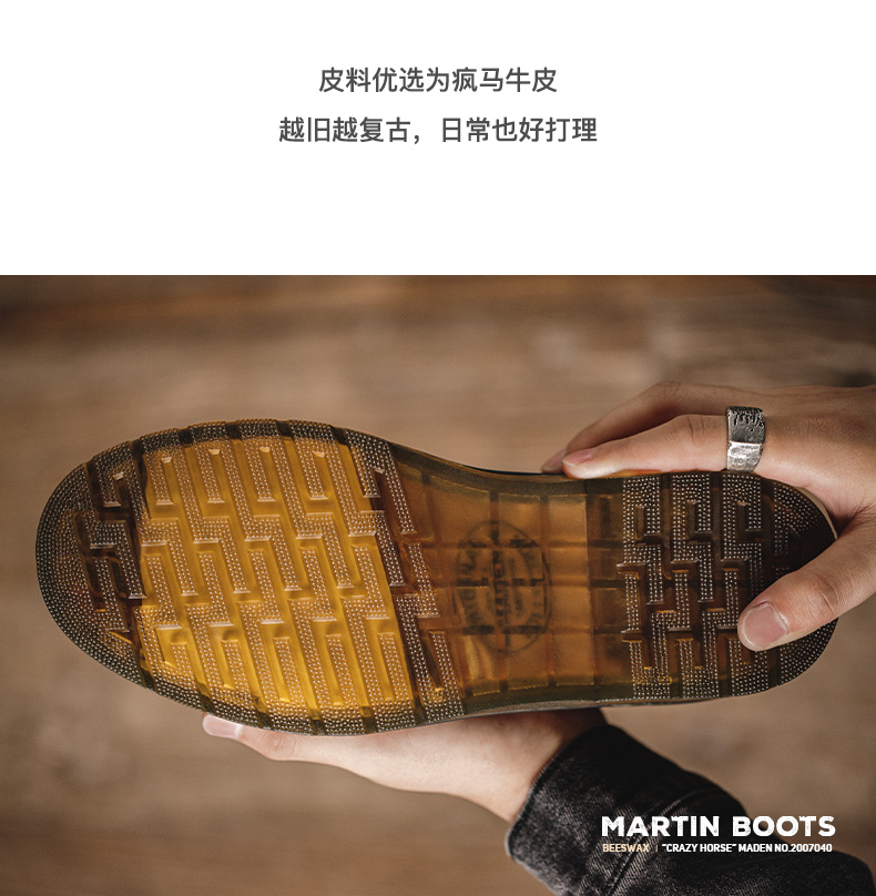 【马登男鞋】马丁靴男鞋春季复古高帮疯马皮工装靴英伦风中帮休闲大头真皮潮鞋