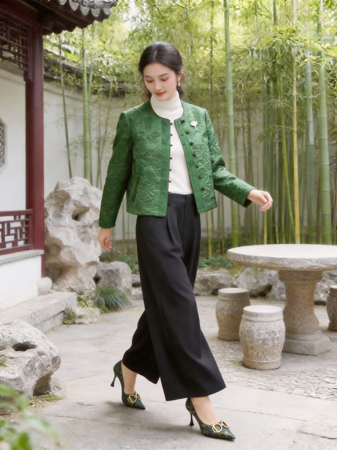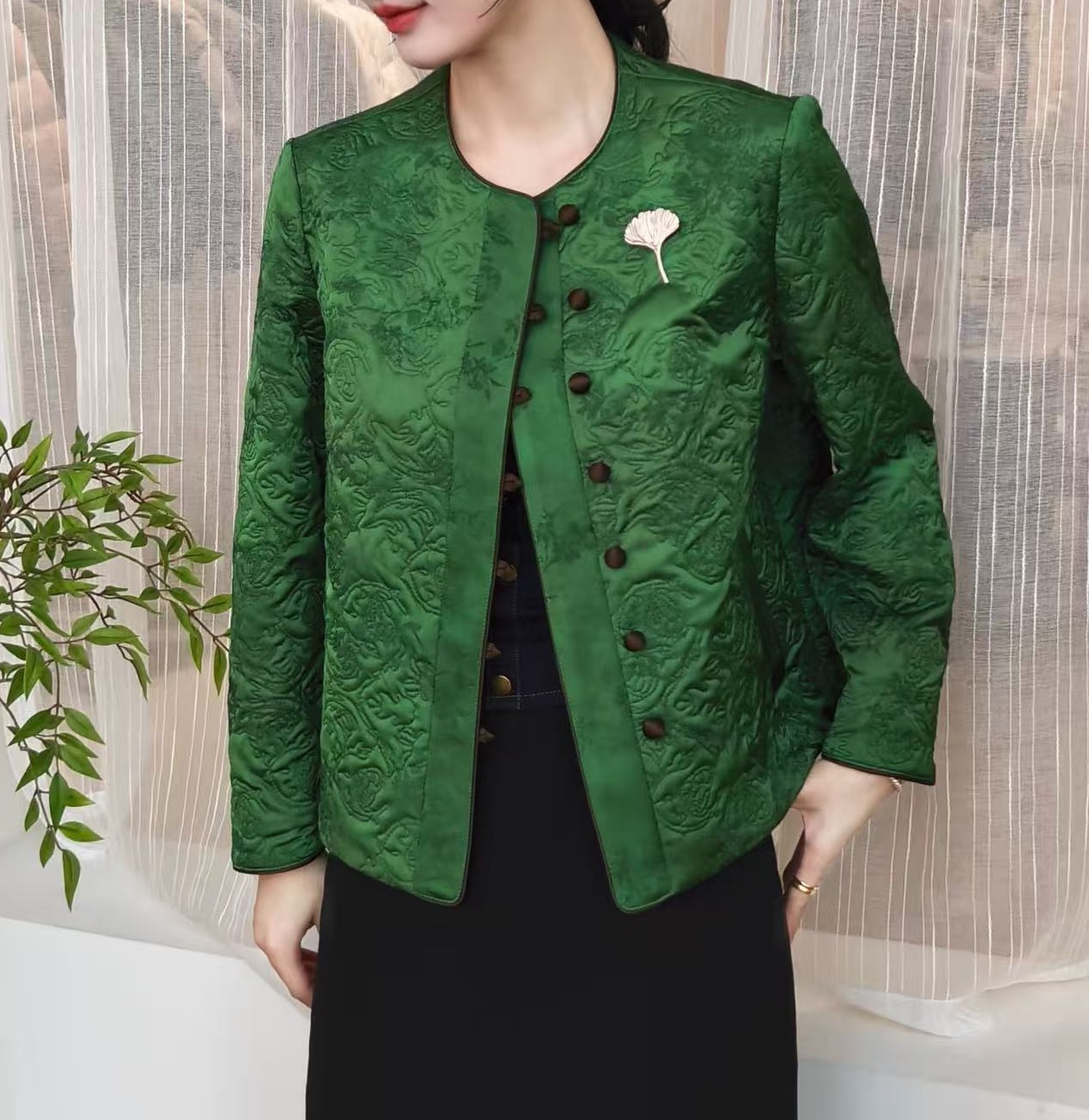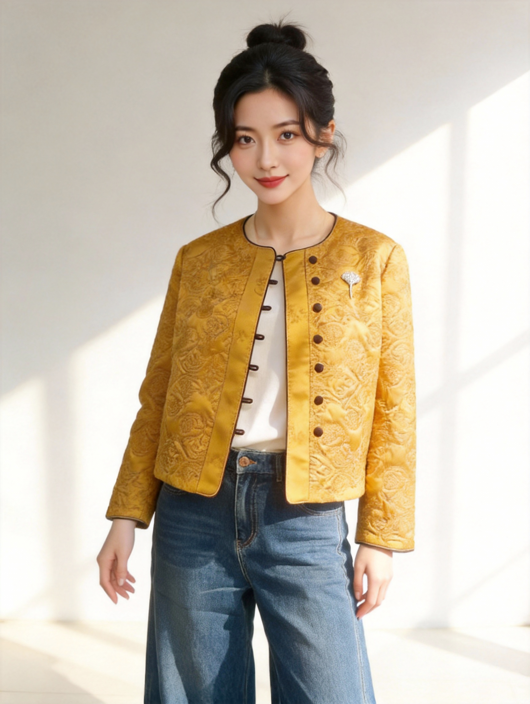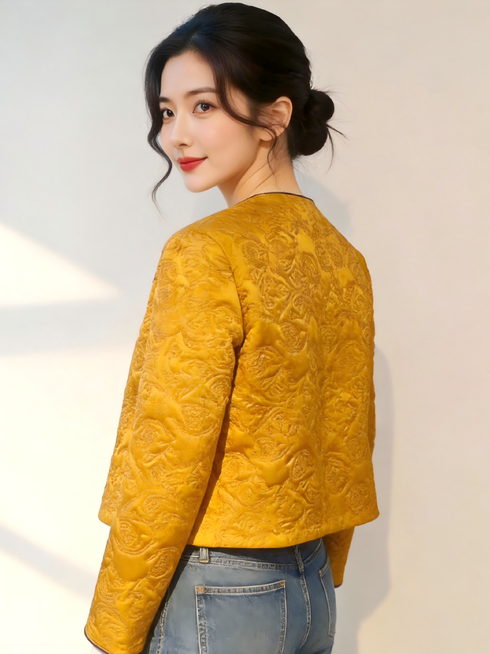 SZ6R15_明黄色/庭芜绿色_外套_秋冬_新中式圆领对襟一字盘扣暗纹提花绗_高级女装_BERNIEELEN 伯妮斯茵