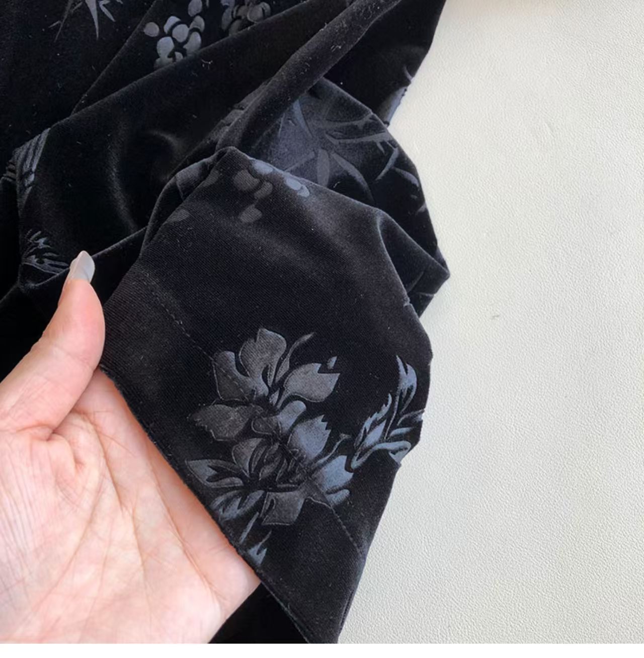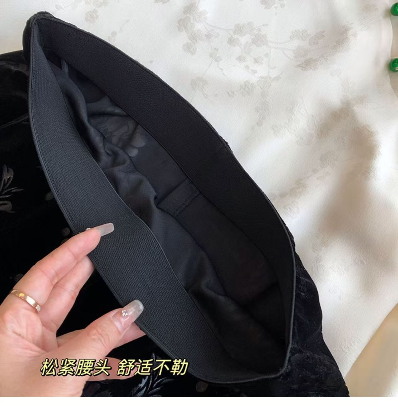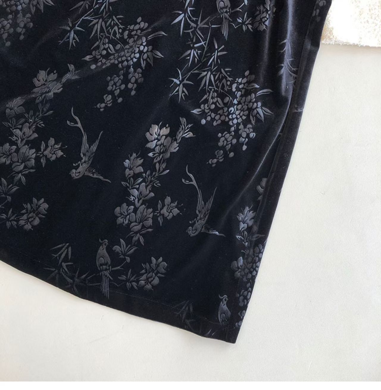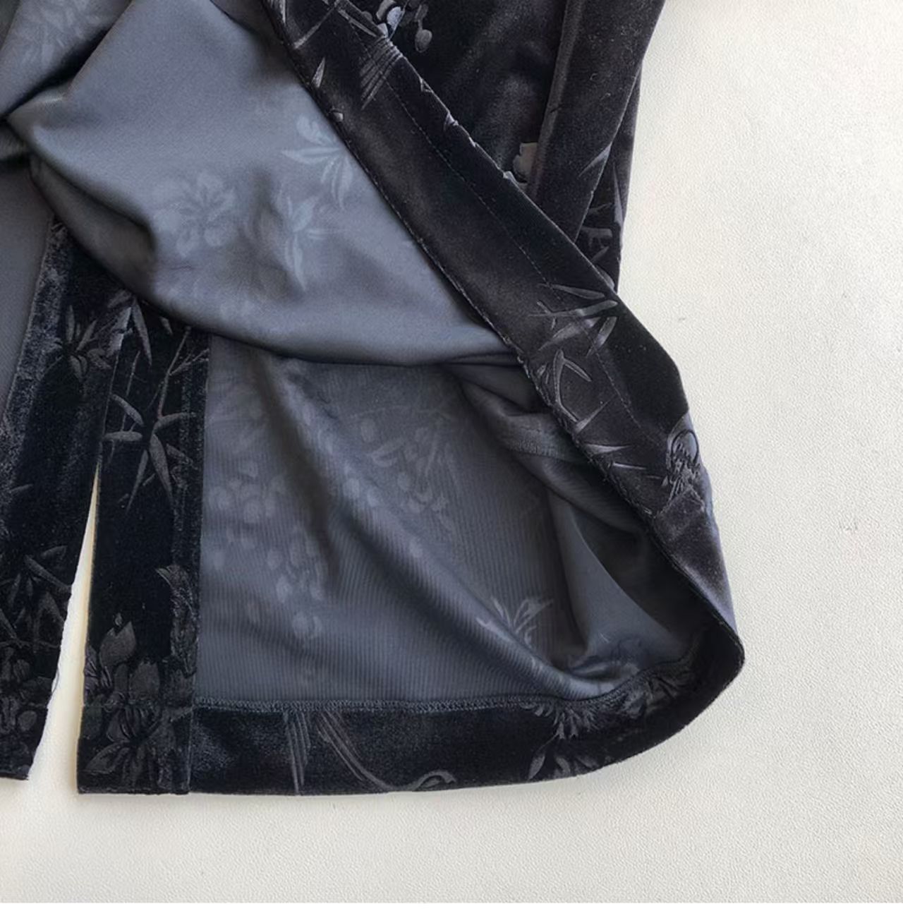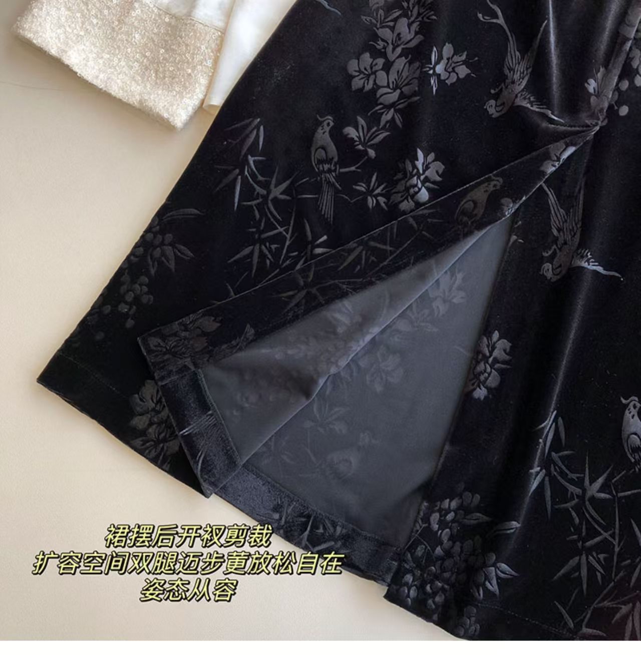 绒面质感凸显中式气质,裙摆单侧开衩剪裁,