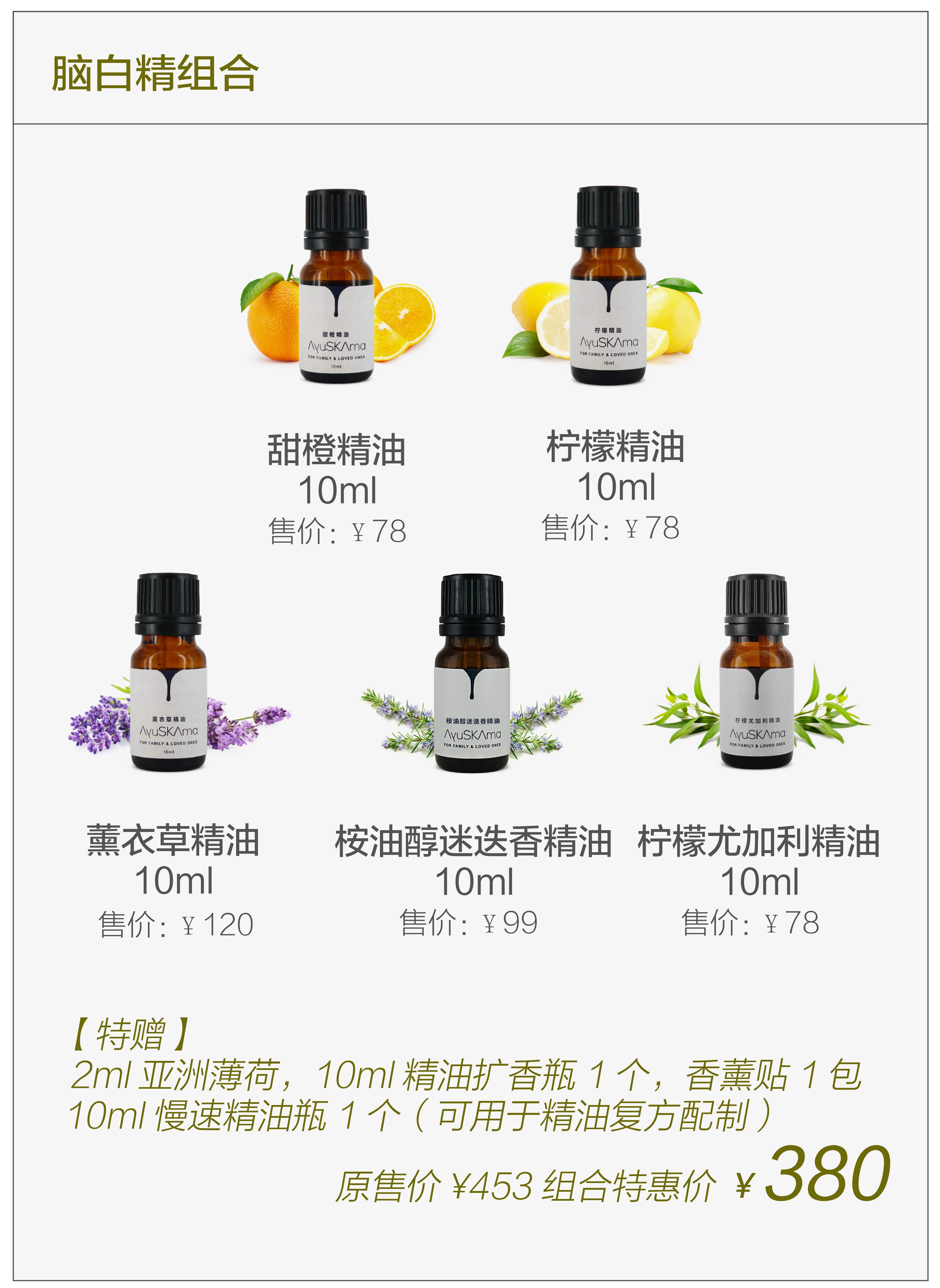 甜橙78元/支、柠檬78元/支、柠檬尤加利精油78元/支、桉油醇迷迭香精油99元/支、真正薰衣草精油120元/支,原价453/套,特惠价380元/套。