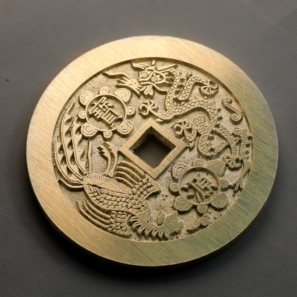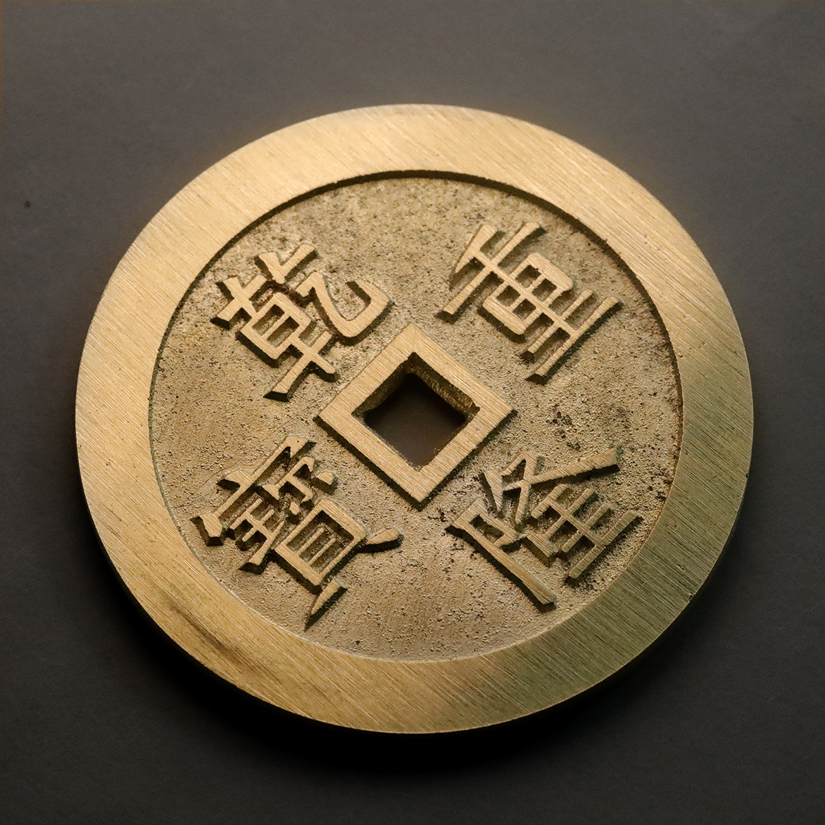 古代真品钱币复刻;古法铸造,独家黄铜材质打造,币身的直径也达到了6cm以上,拿在手里非常有分量感,双面刻有文字浮雕,器型饱满!